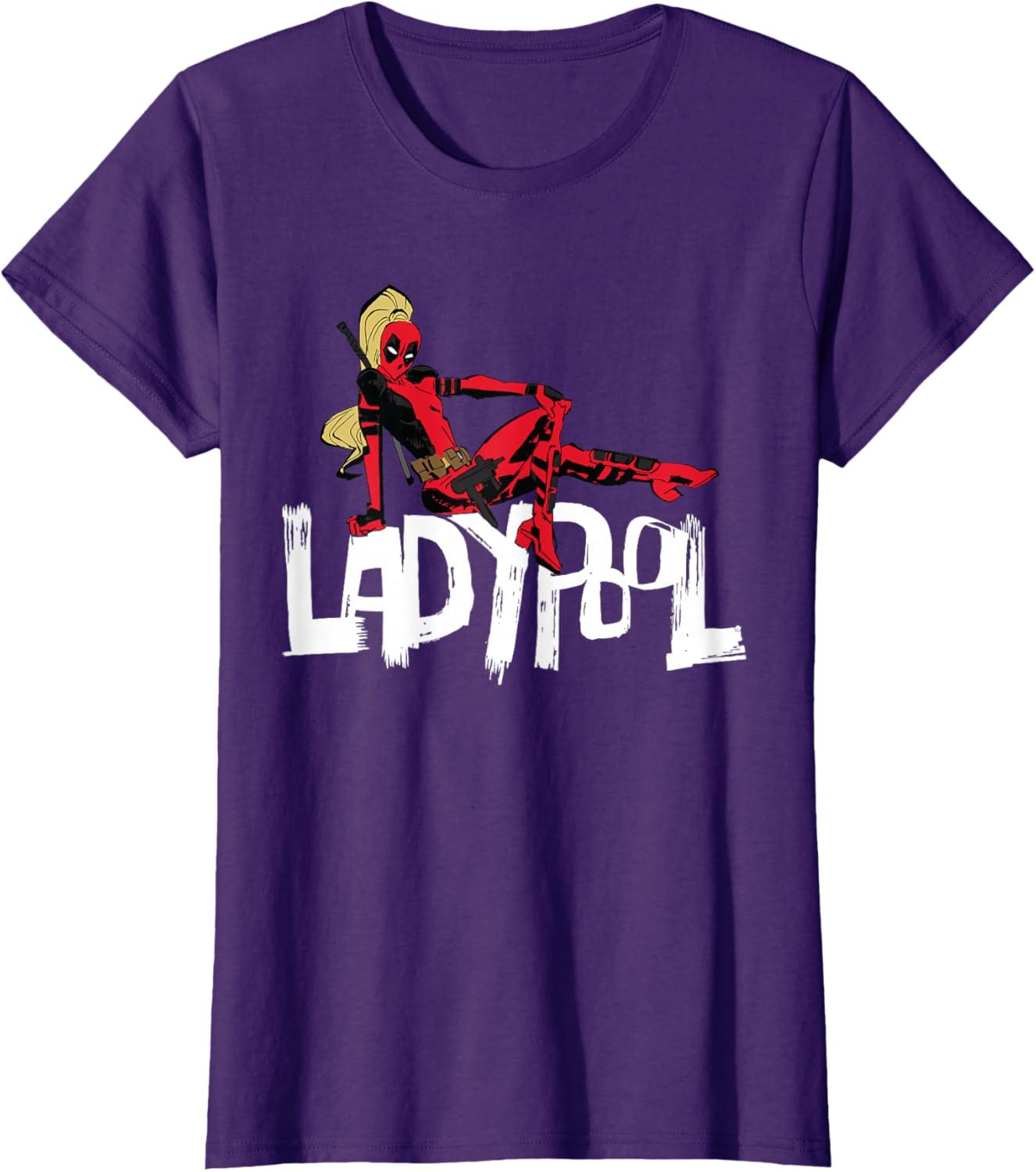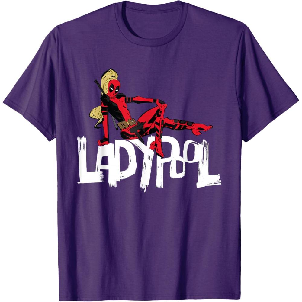 Look out for Ladypool! Blasting out of the blockbuster new Marvel Studios movie “Deadpool & Wolverine”, this member of the multiversal Deadpool Corps is ready for action on an official Marvel tee or hoodie, featuring an eye-catching illustration of the deadly Deadpool variant seated on top of her name. A great gift for a Deadpool, Ladypool, or Marvel Cinematic Universe (MCU) fan. Get multiples to coordinate and match with friends and family for even more superhero-sized fun! Find it in a t-shirt, premium t-shirt, tank top, v-neck, long sleeve tee, hoodie, and sweatshirt.