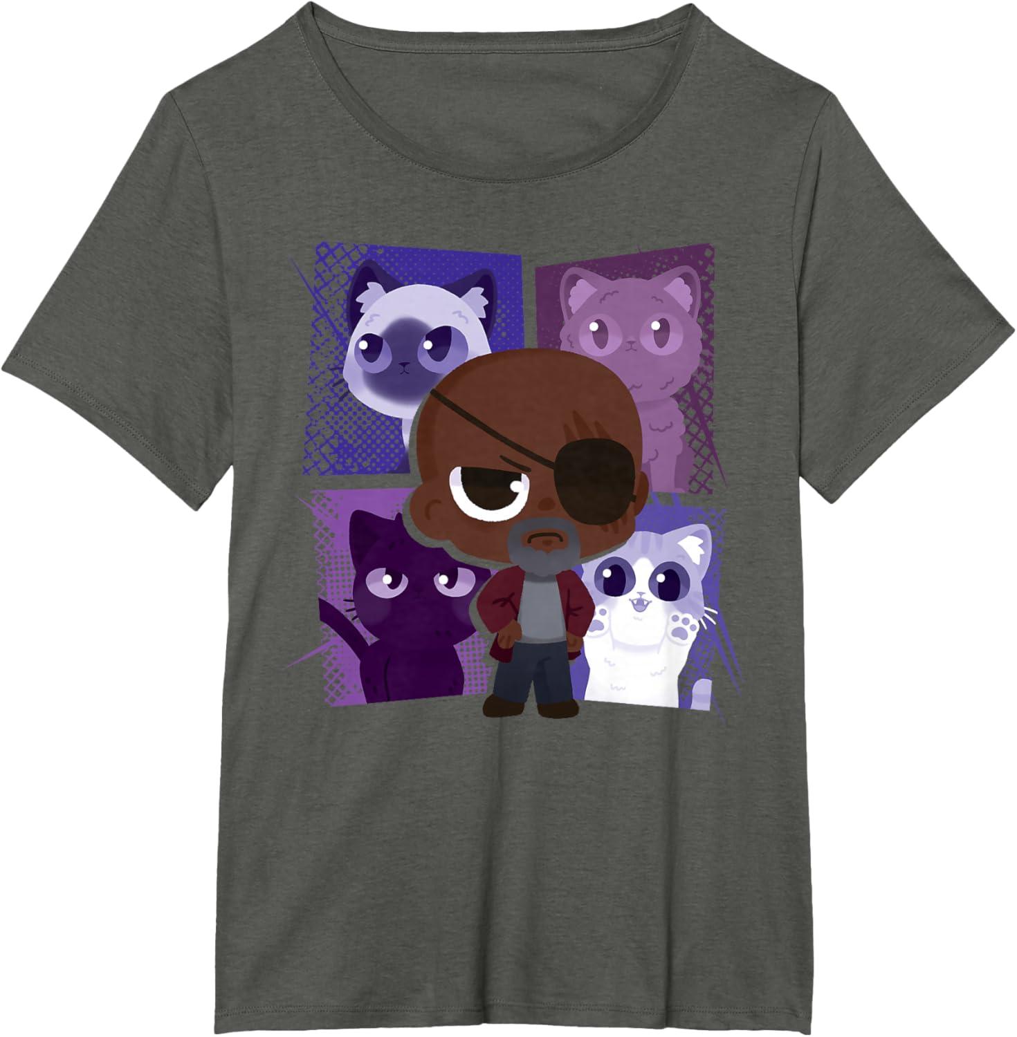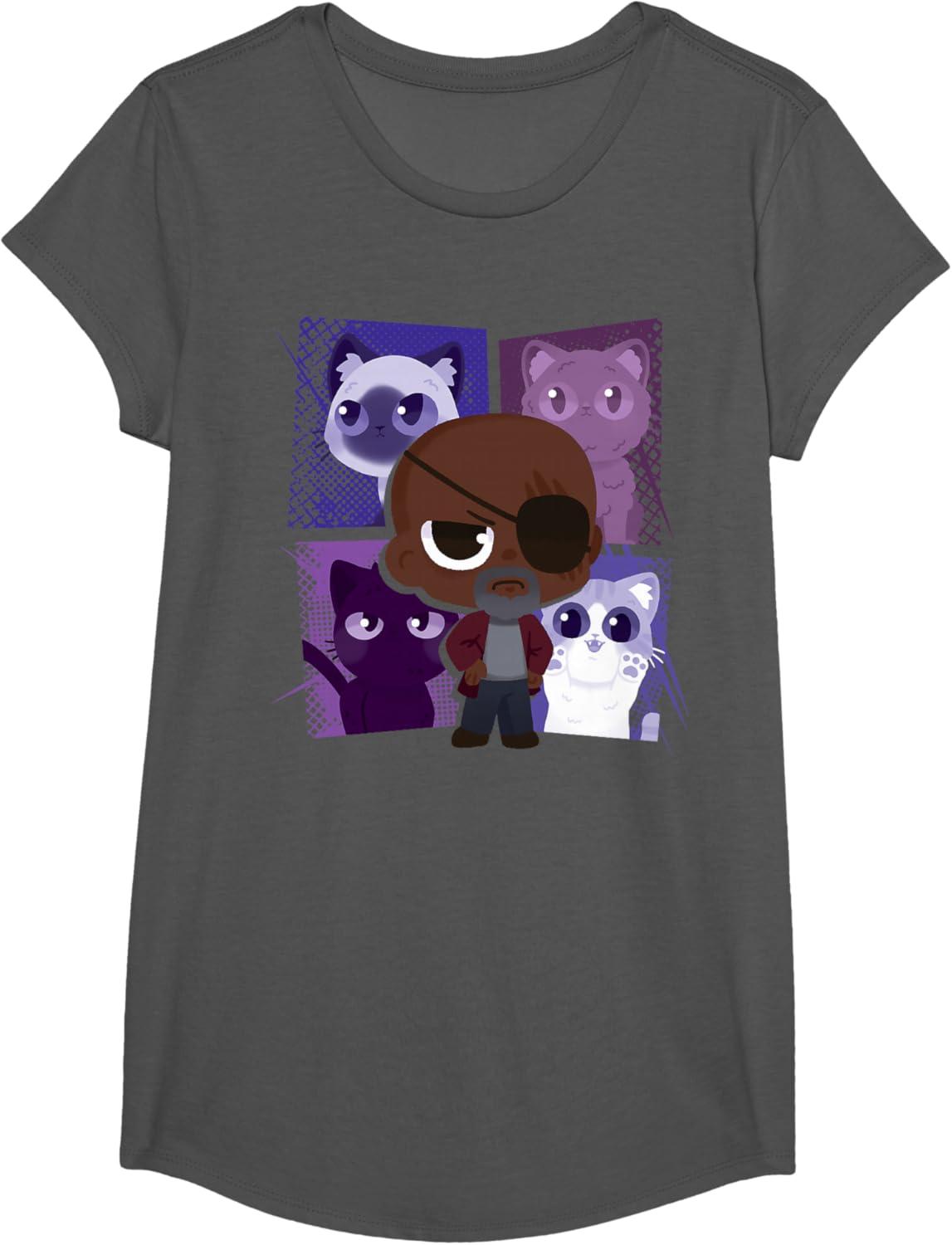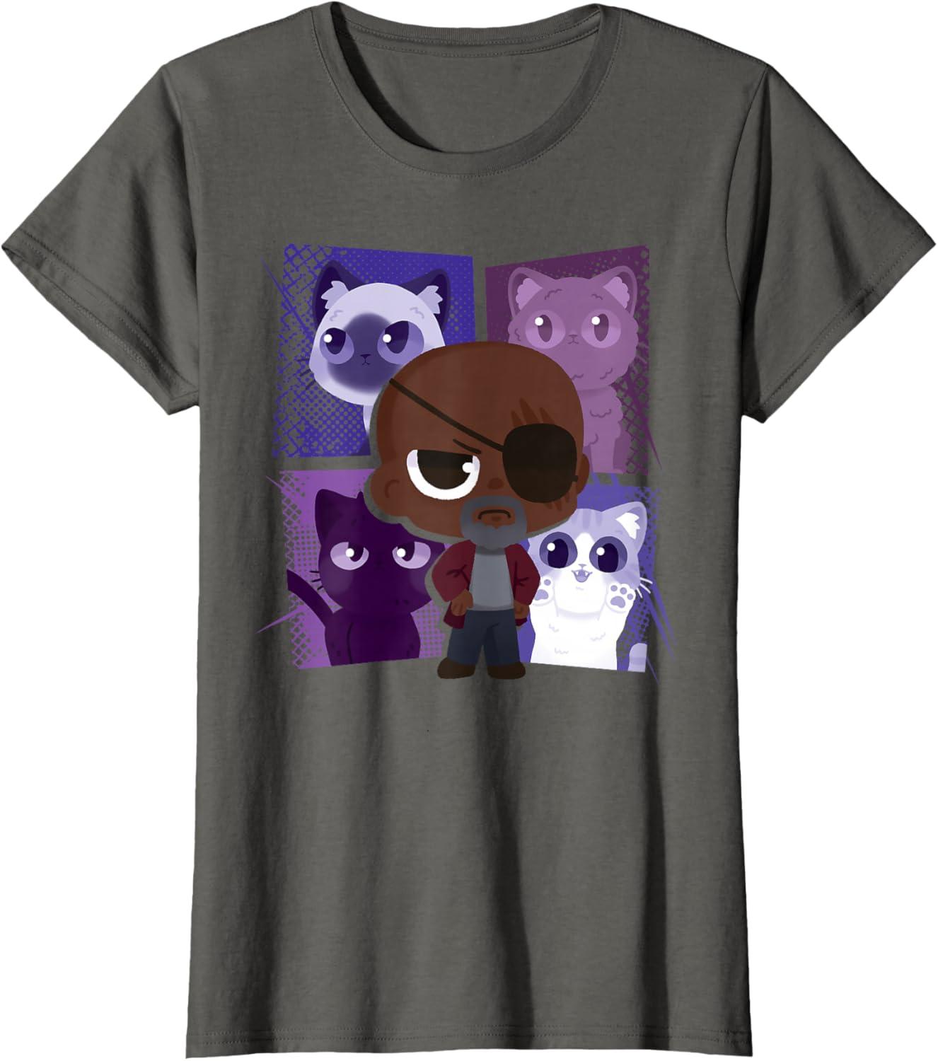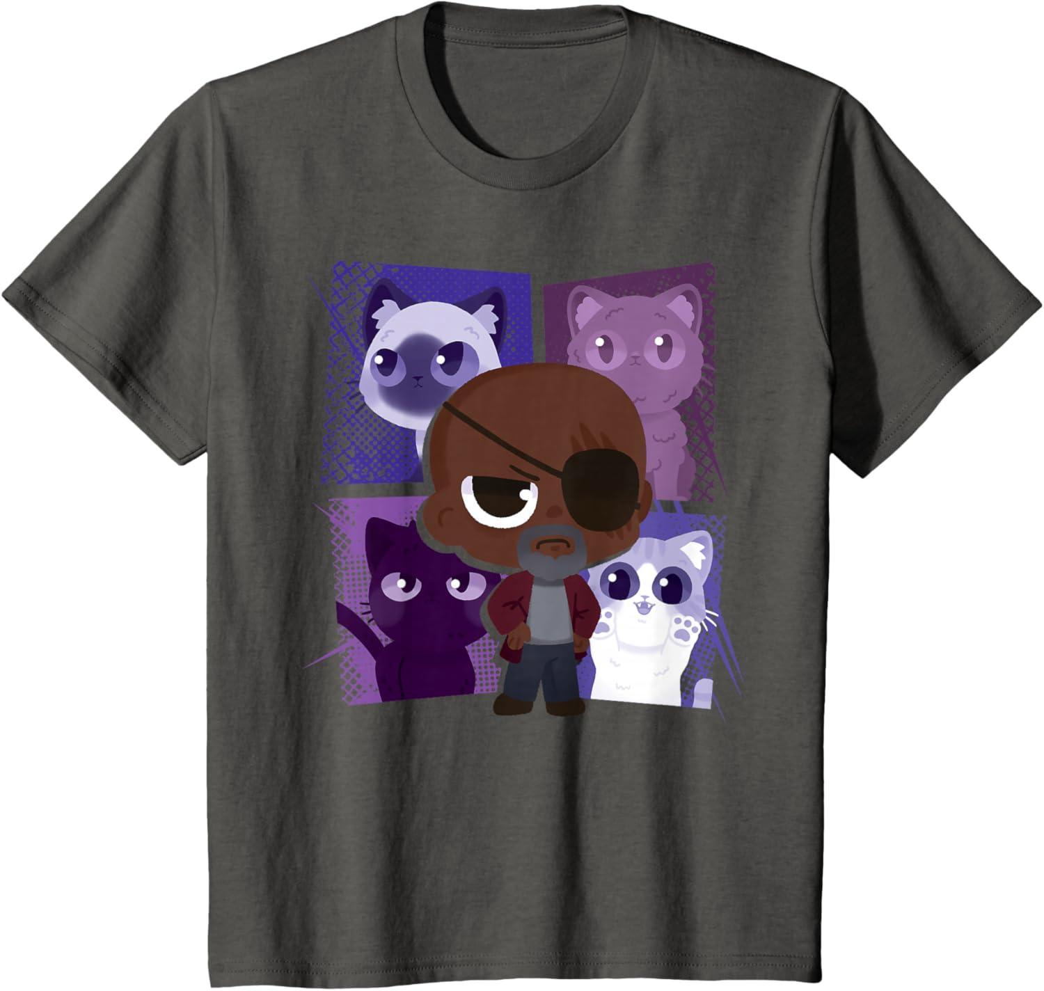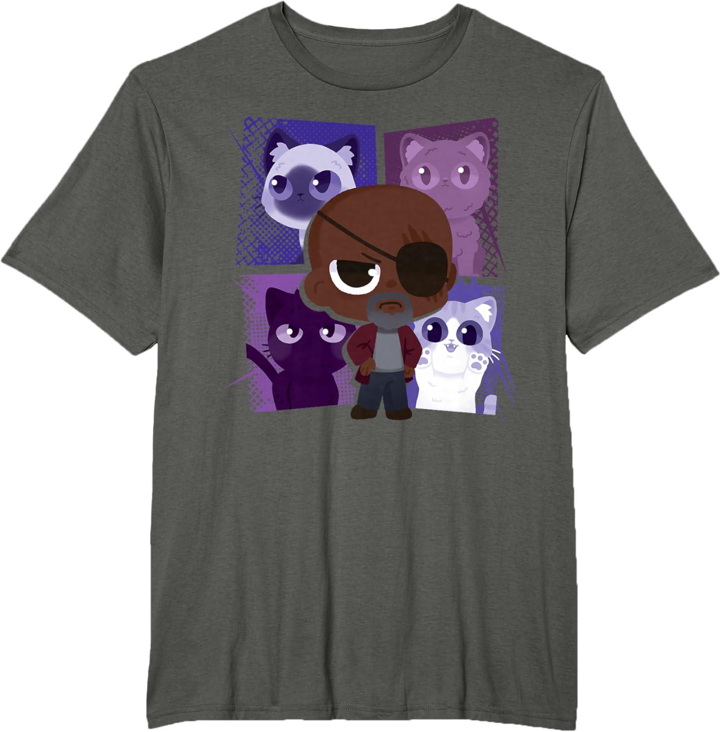 Marvel Studios The Marvels Nick Fury and Flerkittens Cute T-Shirt(Slate Grey)