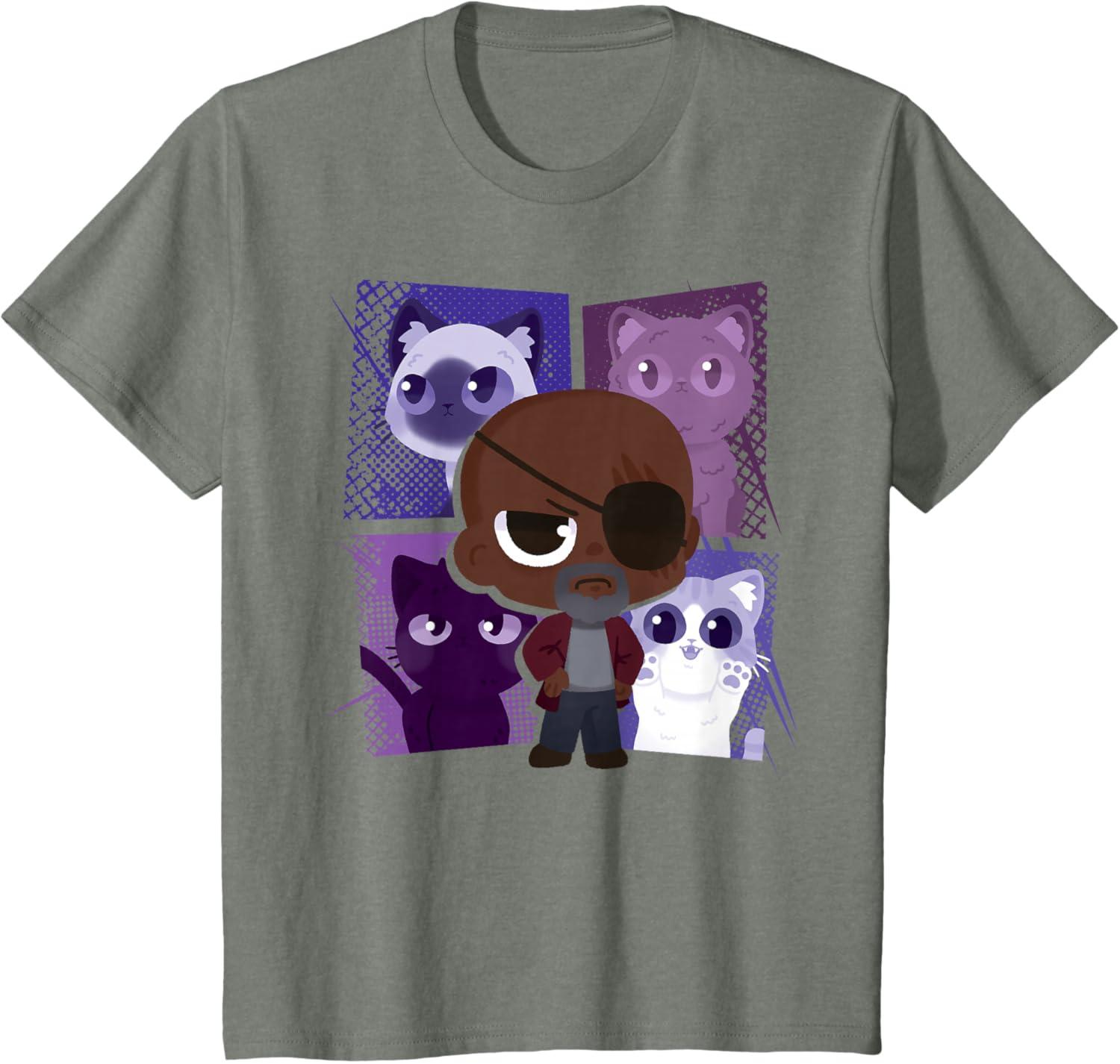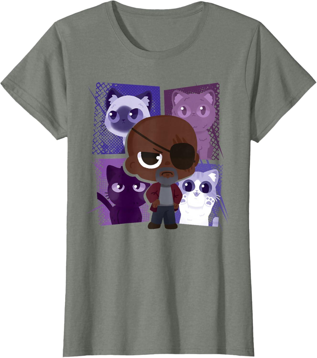 Aww, how dangerously cute they all are! Nick Fury and a quartet of Goose the Flerken’s adorable baby Flerkittens take center stage on this super stylized official tee or hoodie from Marvel Studios’ cosmic new movie “The Marvels”, the sequel to “Captain Marvel”. A great gift for a fan of The Marvels, Goose, alien cat-like creatures, and the MCU! Available in youth and adult sizes. Find it in a t-shirt, premium t-shirt, tank top, v-neck, long sleeve tee, hoodie, and sweatshirt.