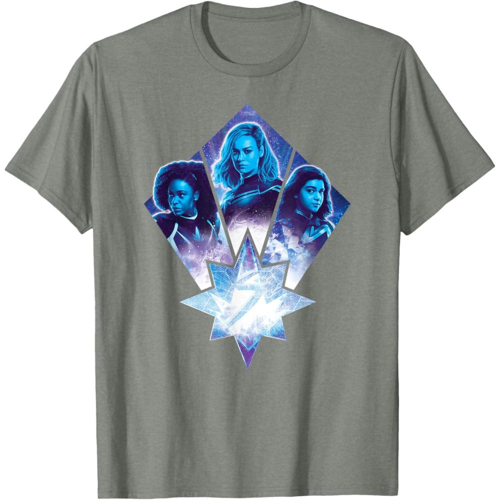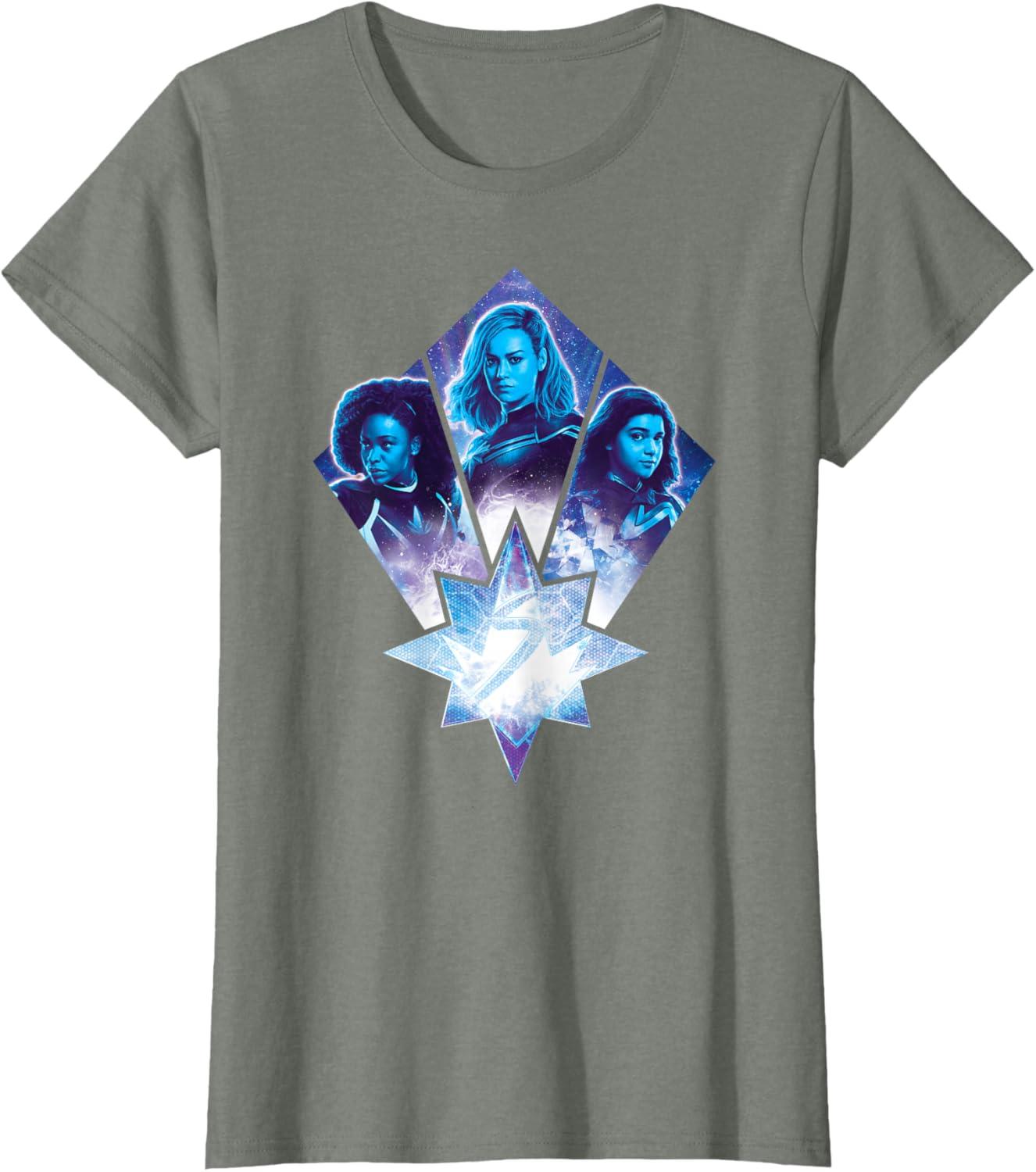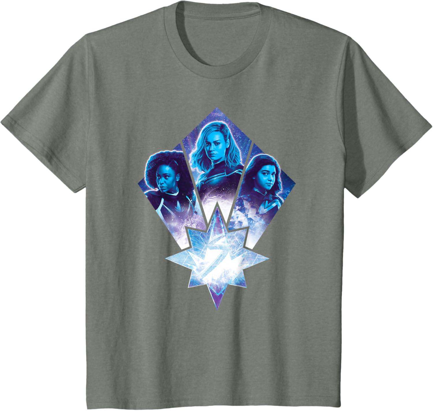 Three Marvels unite in Marvel Studios’ cosmic new movie “The Marvels”, the sequel to “Captain Marvel” and the newest exciting chapter in the Marvel Cinematic Universe! This official tee or hoodie features awesome images of Photon, Captain Marvel, and Ms. Marvel – a.k.a. Monica Rambeau (“WandaVision”), Carol Danvers (“Captain Marvel”), and Kamala Khan (“Ms. Marvel”) – along with an icon combining all three of their symbols. When these super heroes team up, incredible adventure is in store. A great gift for a fan of The Marvels or the MCU! Available in youth and adult sizes. Find it in a t-shirt, premium t-shirt, tank top, v-neck, long sleeve tee, hoodie, and sweatshirt.