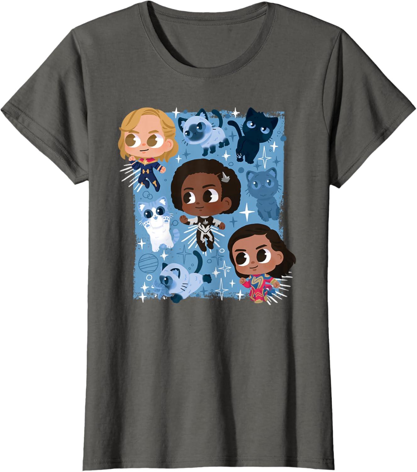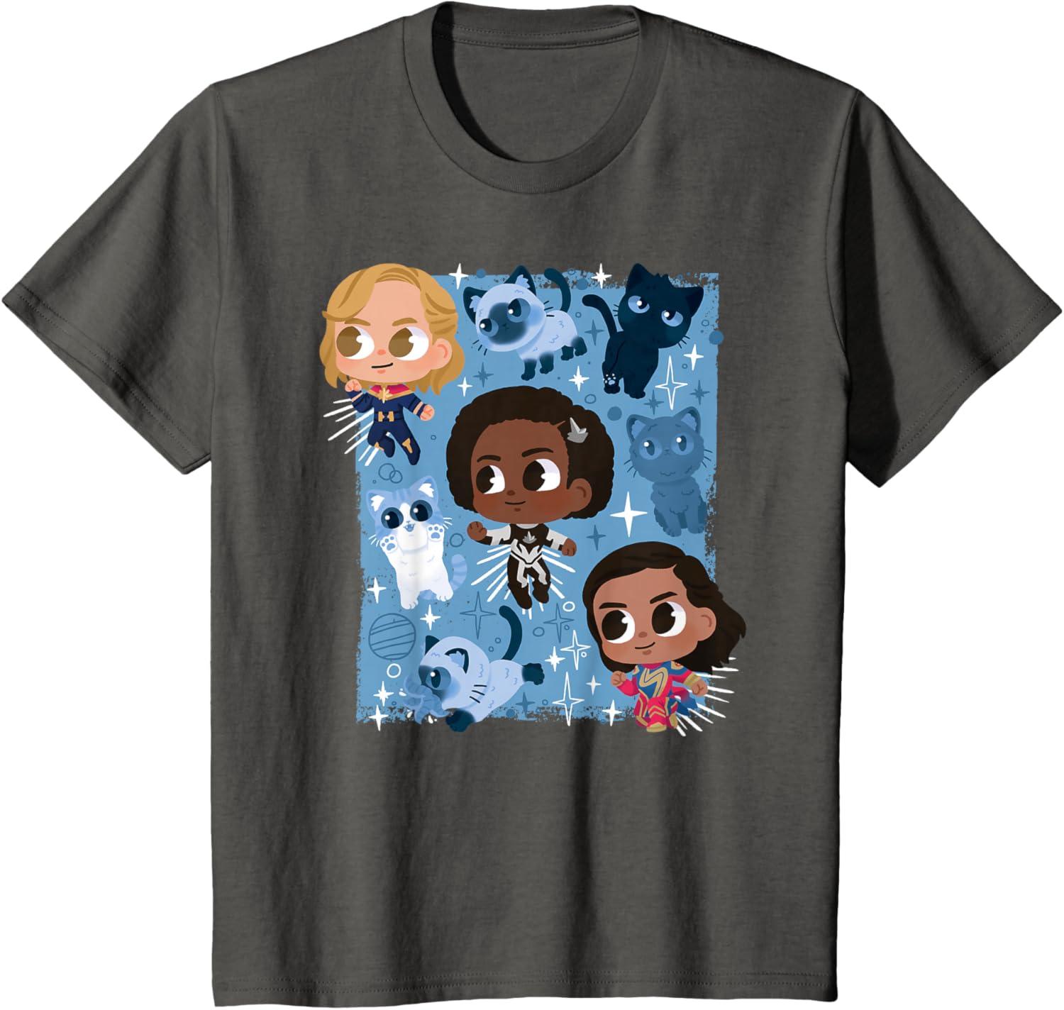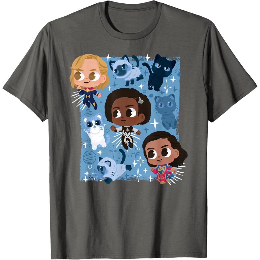 Marvel Studios The Marvels Super Heroes and Flerkittens Cute T-Shirt(Asphalt Grey)