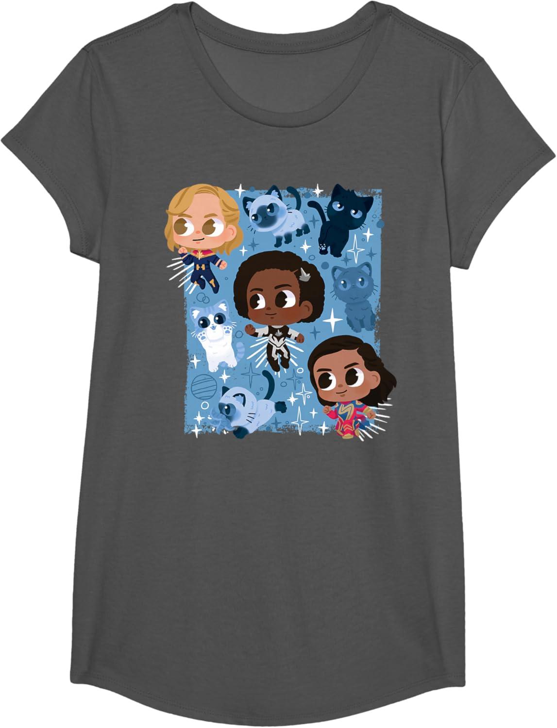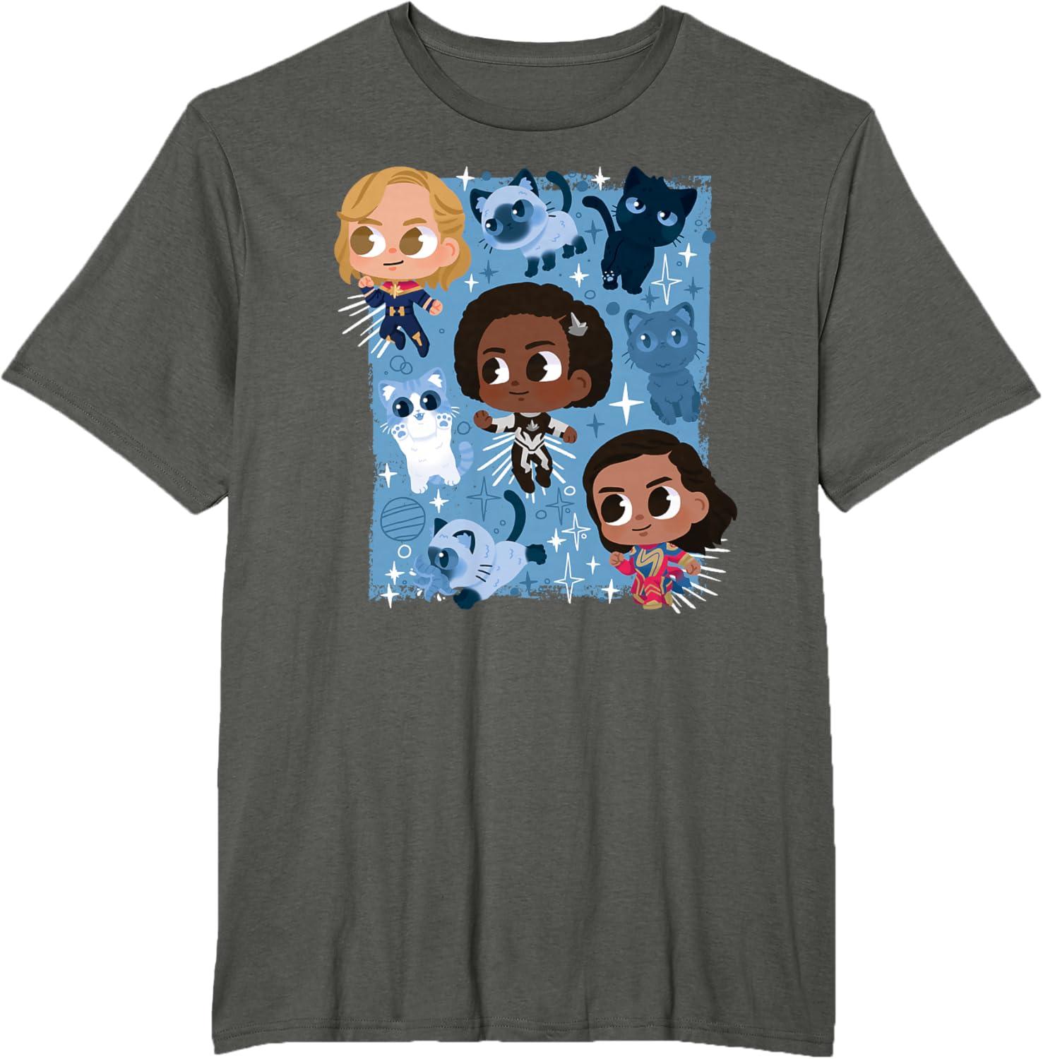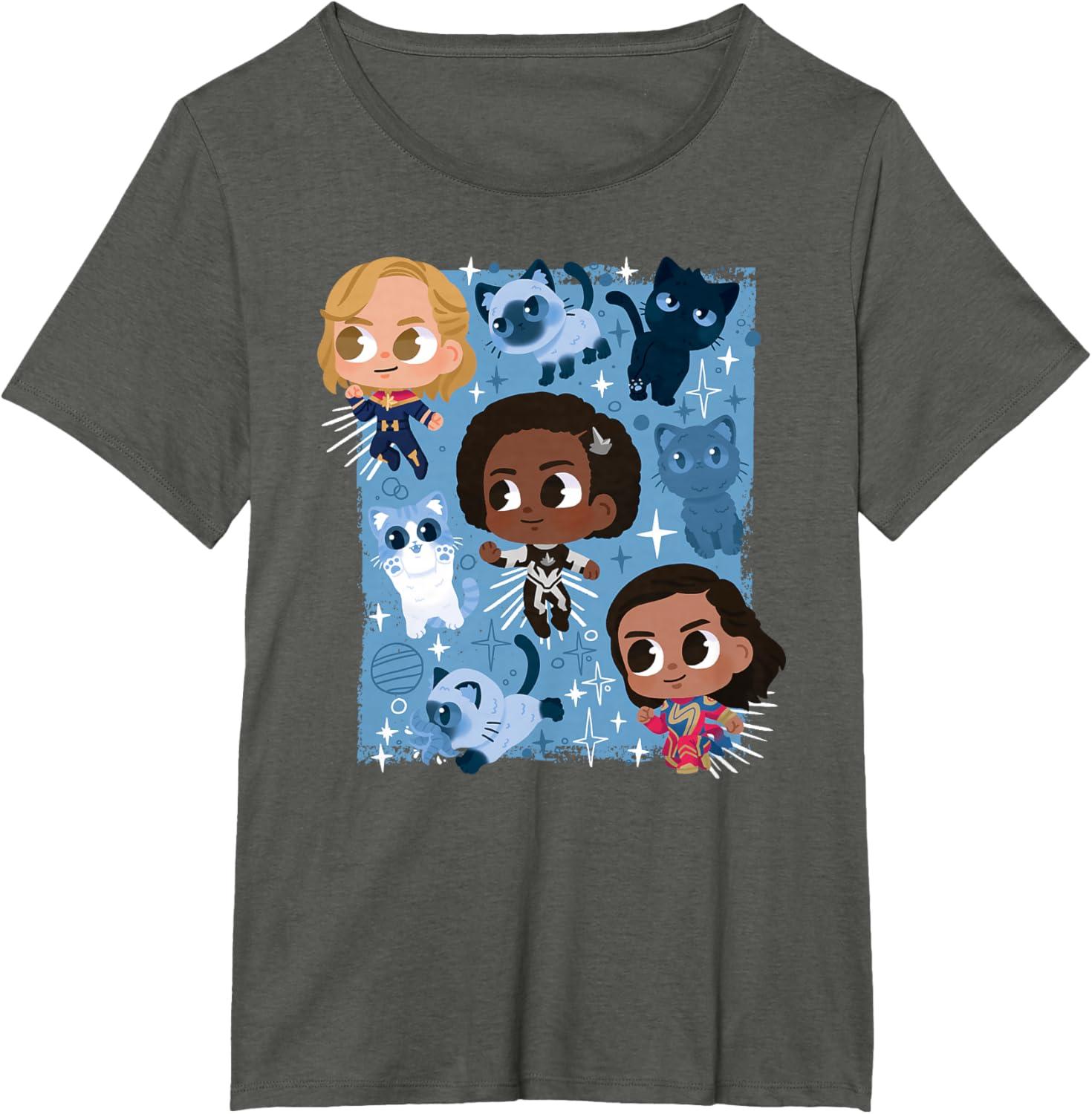 Marvel Studios The Marvels Super Heroes and Flerkittens Cute T-Shirt(Asphalt Grey)