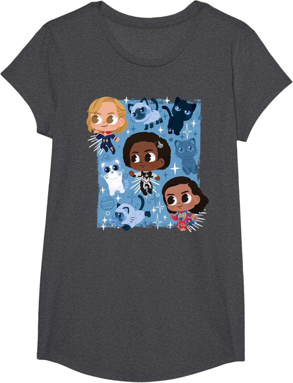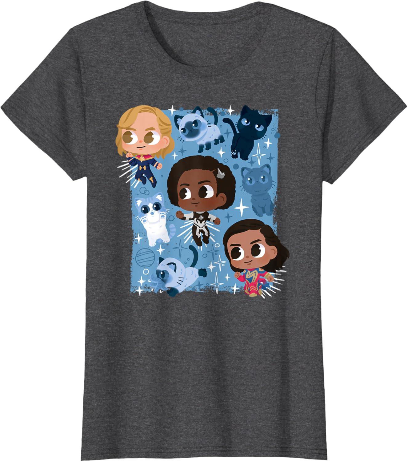 Marvel Studios The Marvels Super Heroes and Flerkittens Cute T-Shirt(Dark Heather Grey)