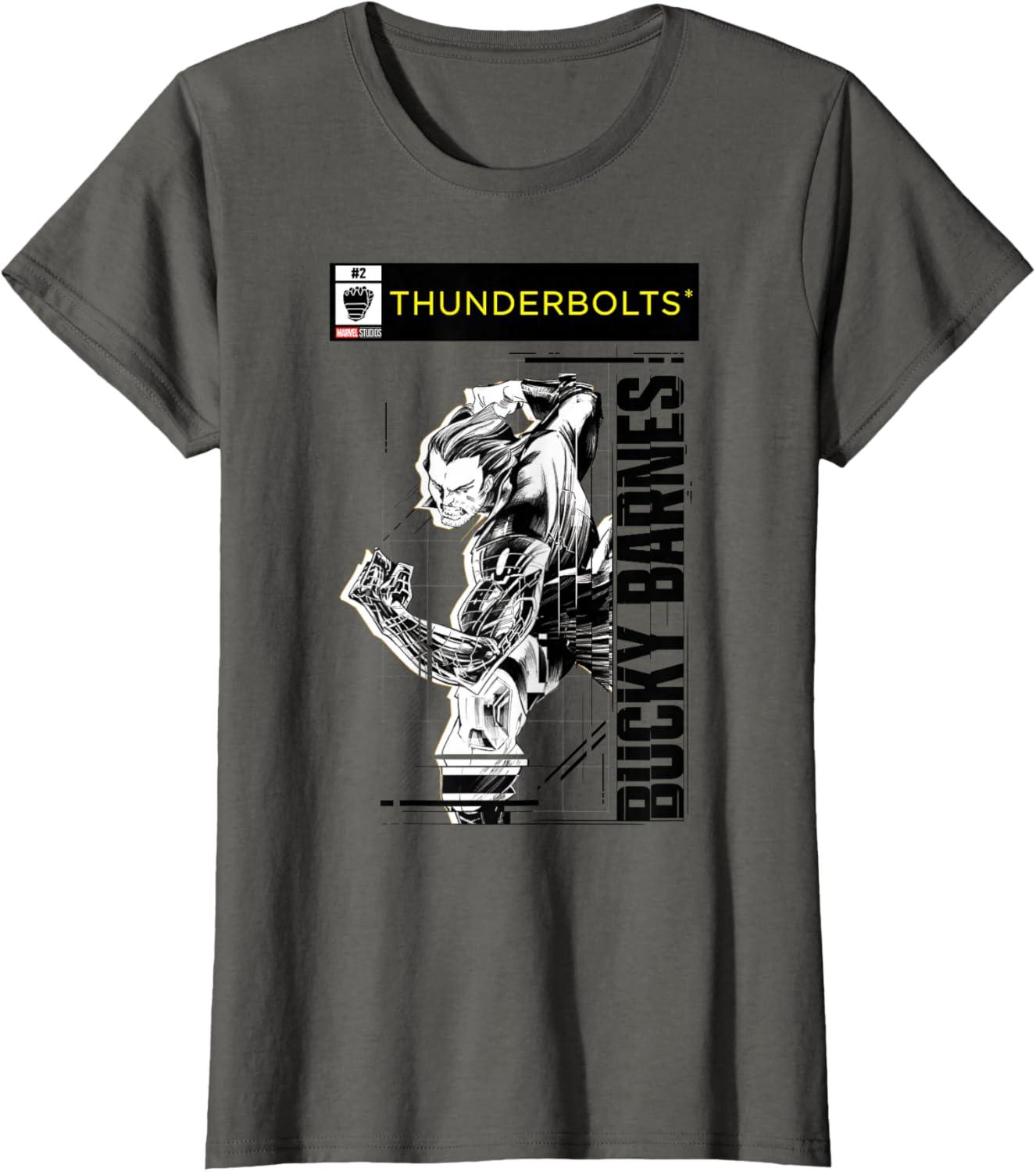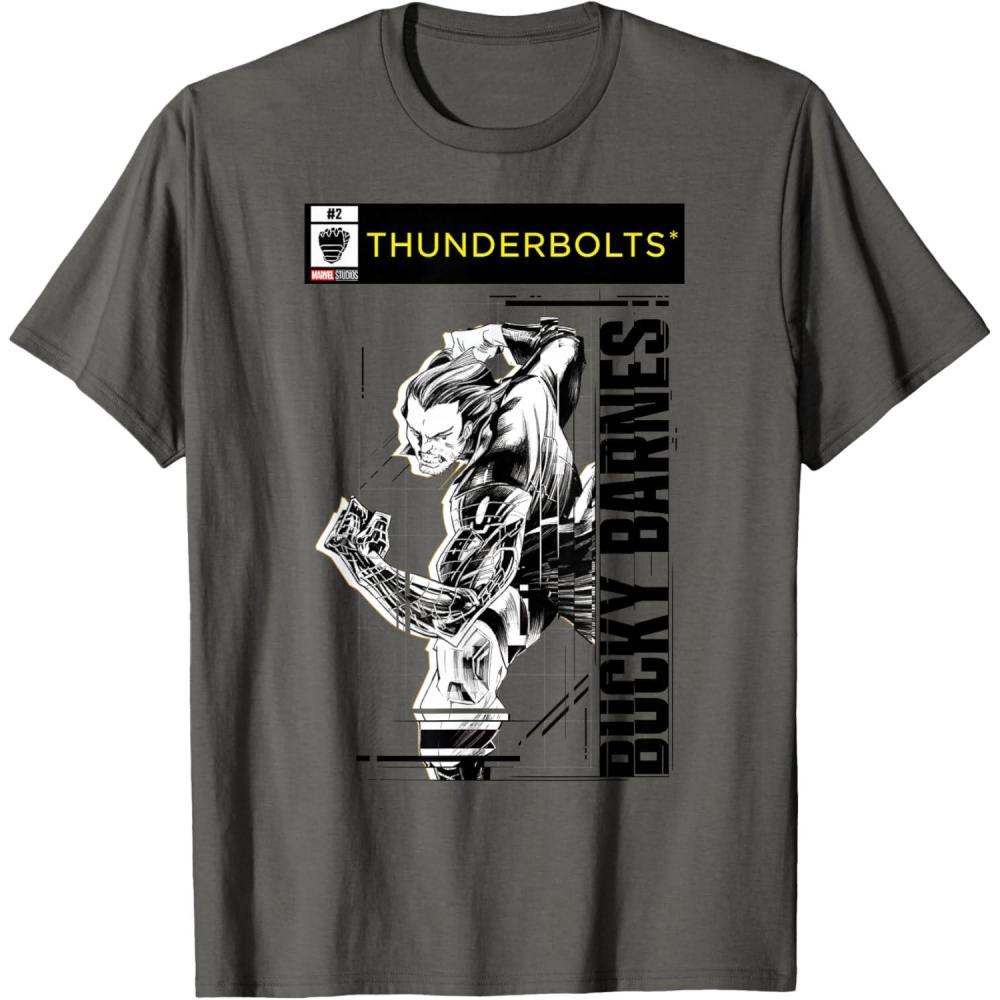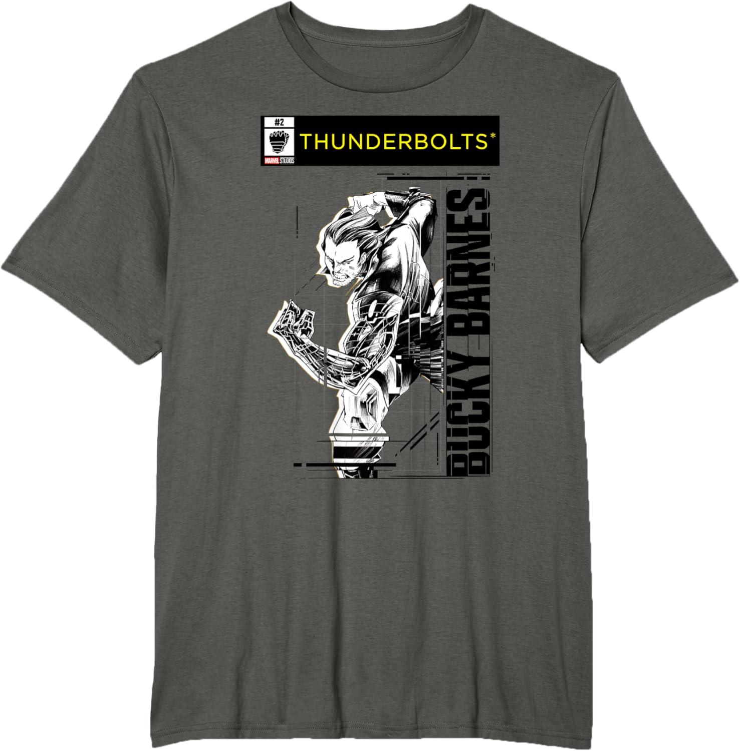 Not super. Not heroes. Not giving up. Join the most unexpected new team in the Marvel Cinematic Universe! This official Marvel tee or hoodie from Marvel Studios' blockbuster movie “Thunderbolts” features action-packed, black-and-white comic cover style art of Bucky Barnes, the former Winter Soldier, with a Thunderbolts logo at the top. A great gift for a Marvel Super Heroes, Thunderbolts, or MCU fan — collect the whole team with numbered designs featuring Yelena Belova, Red Guardian, Taskmaster, John F. Walker, and Ghost! Planning a trip to Avengers Campus at Disney California Adventure Park or another super destination? Get multiples and wear matching Marvel's Thunderbolts t-shirts with friends and family for even more superhero-sized fun! Find it in a t-shirt, premium t-shirt, tank top, v-neck, long sleeve tee, hoodie, and sweatshirt.