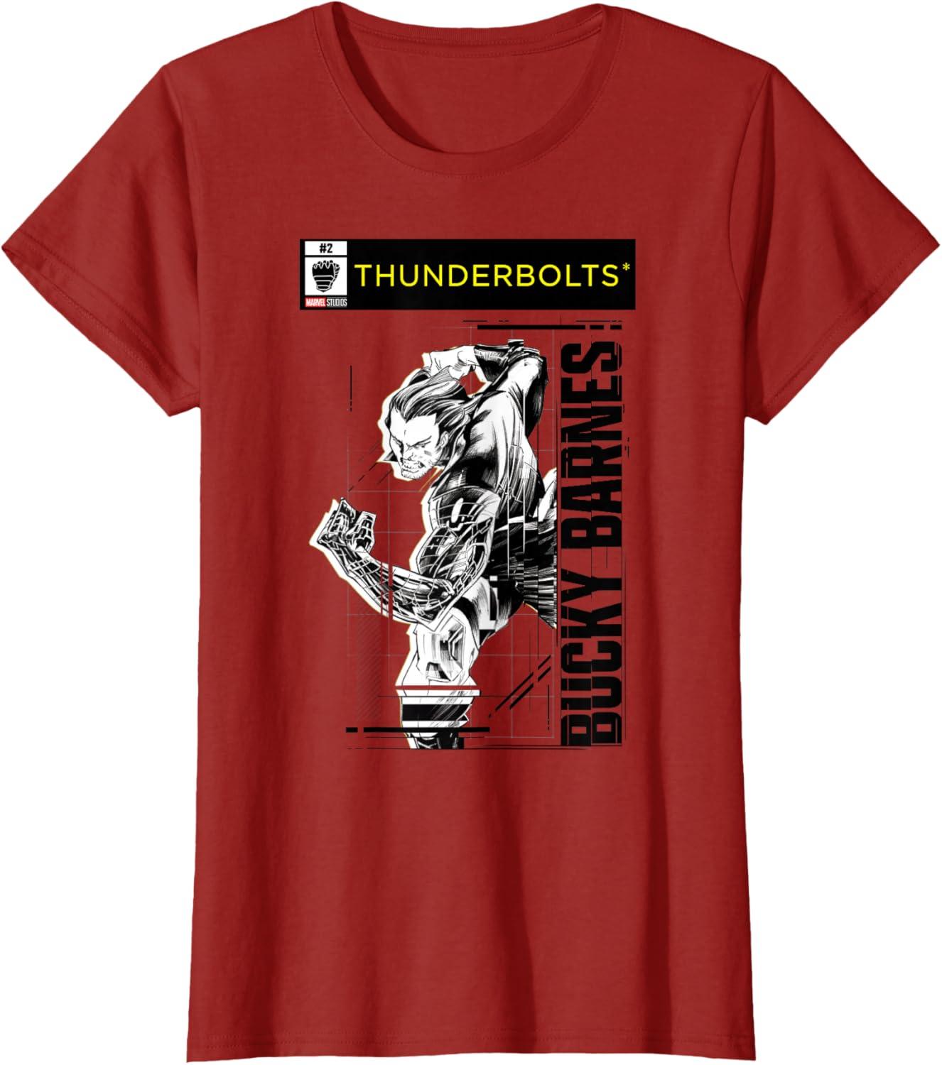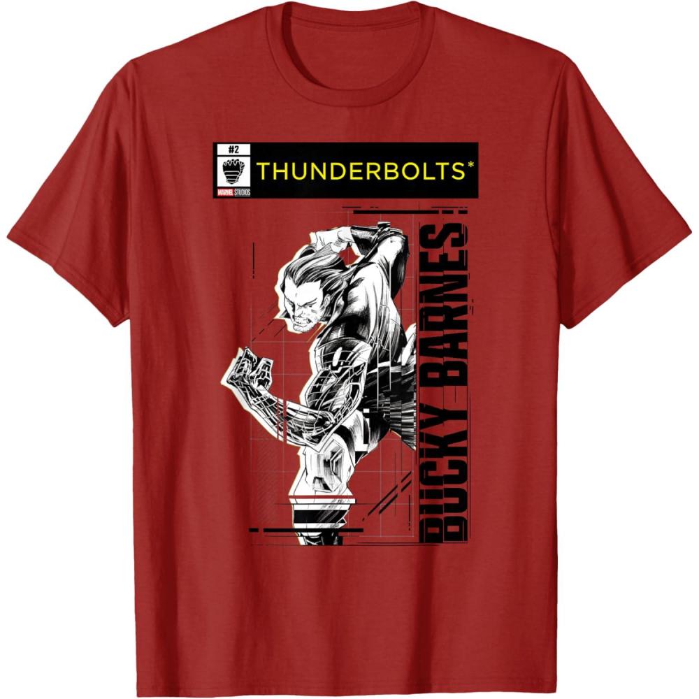 Not super. Not heroes. Not giving up. Join the most unexpected new team in the Marvel Cinematic Universe! This official Marvel tee or hoodie from Marvel Studios' blockbuster movie “Thunderbolts” features action-packed, black-and-white comic cover style art of Bucky Barnes, the former Winter Soldier, with a Thunderbolts logo at the top. A great gift for a Marvel Super Heroes, Thunderbolts, or MCU fan — collect the whole team with numbered designs featuring Yelena Belova, Red Guardian, Taskmaster, John F. Walker, and Ghost! Planning a trip to Avengers Campus at Disney California Adventure Park or another super destination? Get multiples and wear matching Marvel's Thunderbolts t-shirts with friends and family for even more superhero-sized fun! Find it in a t-shirt, premium t-shirt, tank top, v-neck, long sleeve tee, hoodie, and sweatshirt.