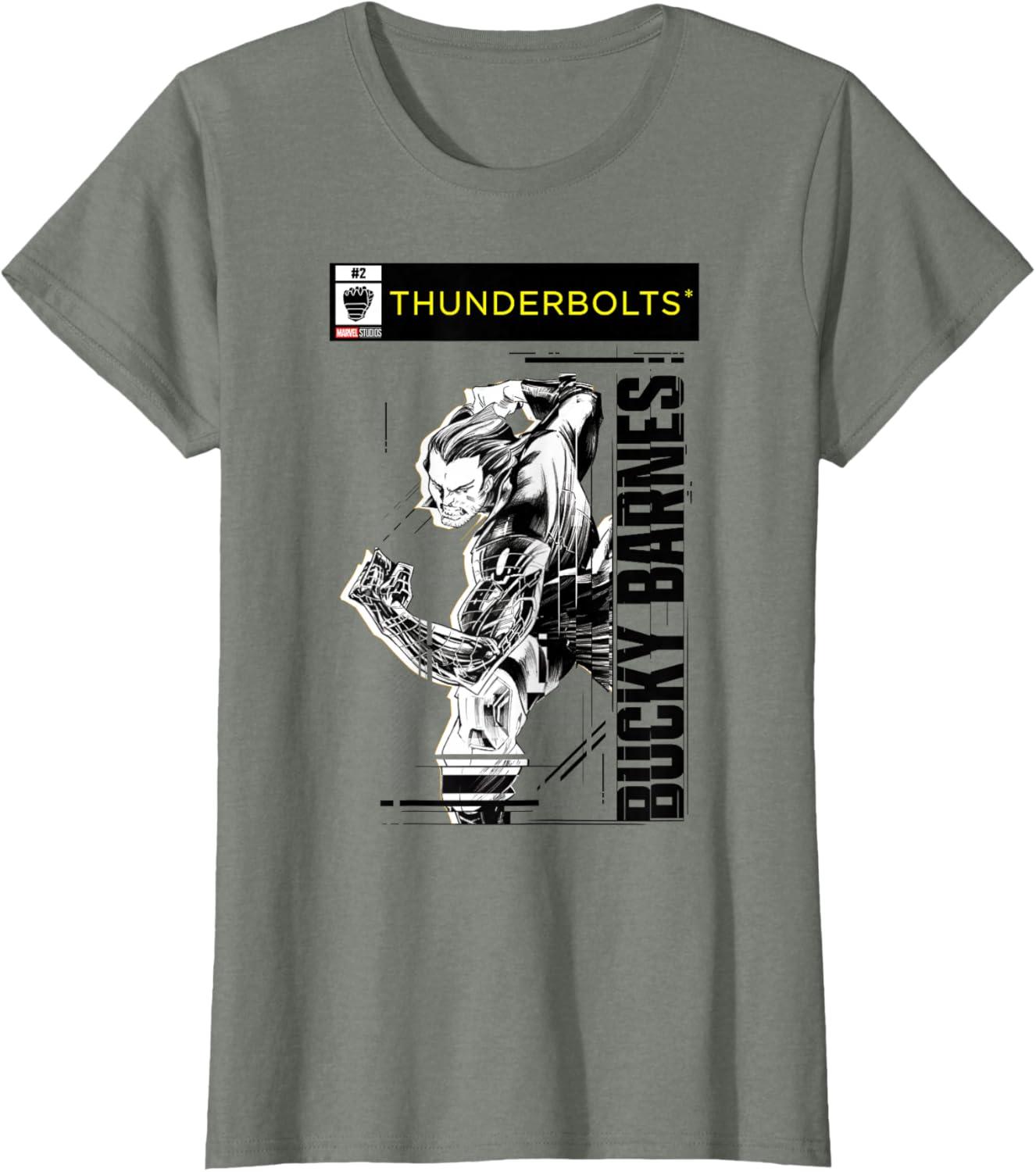 Not super. Not heroes. Not giving up. Join the most unexpected new team in the Marvel Cinematic Universe! This official Marvel tee or hoodie from Marvel Studios' blockbuster movie “Thunderbolts” features action-packed, black-and-white comic cover style art of Bucky Barnes, the former Winter Soldier, with a Thunderbolts logo at the top. A great gift for a Marvel Super Heroes, Thunderbolts, or MCU fan — collect the whole team with numbered designs featuring Yelena Belova, Red Guardian, Taskmaster, John F. Walker, and Ghost! Planning a trip to Avengers Campus at Disney California Adventure Park or another super destination? Get multiples and wear matching Marvel's Thunderbolts t-shirts with friends and family for even more superhero-sized fun! Find it in a t-shirt, premium t-shirt, tank top, v-neck, long sleeve tee, hoodie, and sweatshirt.