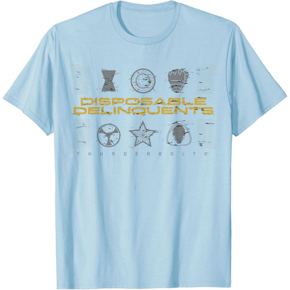 Not super. Not heroes. Not giving up. Join the most unexpected new team in the Marvel Cinematic Universe! This official Marvel tee or hoodie from Marvel Studios' blockbuster movie “Thunderbolts” features an eye-catching distressed design with the message “Disposable Delinquents” above the movie logo, accompanied by icons representing team members Yelena Belova, John F. Walker, Bucky Barnes, Taskmaster, Red Guardian, and Ghost. A great gift for a Marvel Super Heroes, Thunderbolts, or MCU fan! Planning a trip to Avengers Campus at Disney California Adventure Park or another super destination? Get multiples and wear matching Marvel's Thunderbolts t-shirts with friends and family for even more superhero-sized fun! Find it in a t-shirt, premium t-shirt, tank top, v-neck, long sleeve tee, hoodie, and sweatshirt.