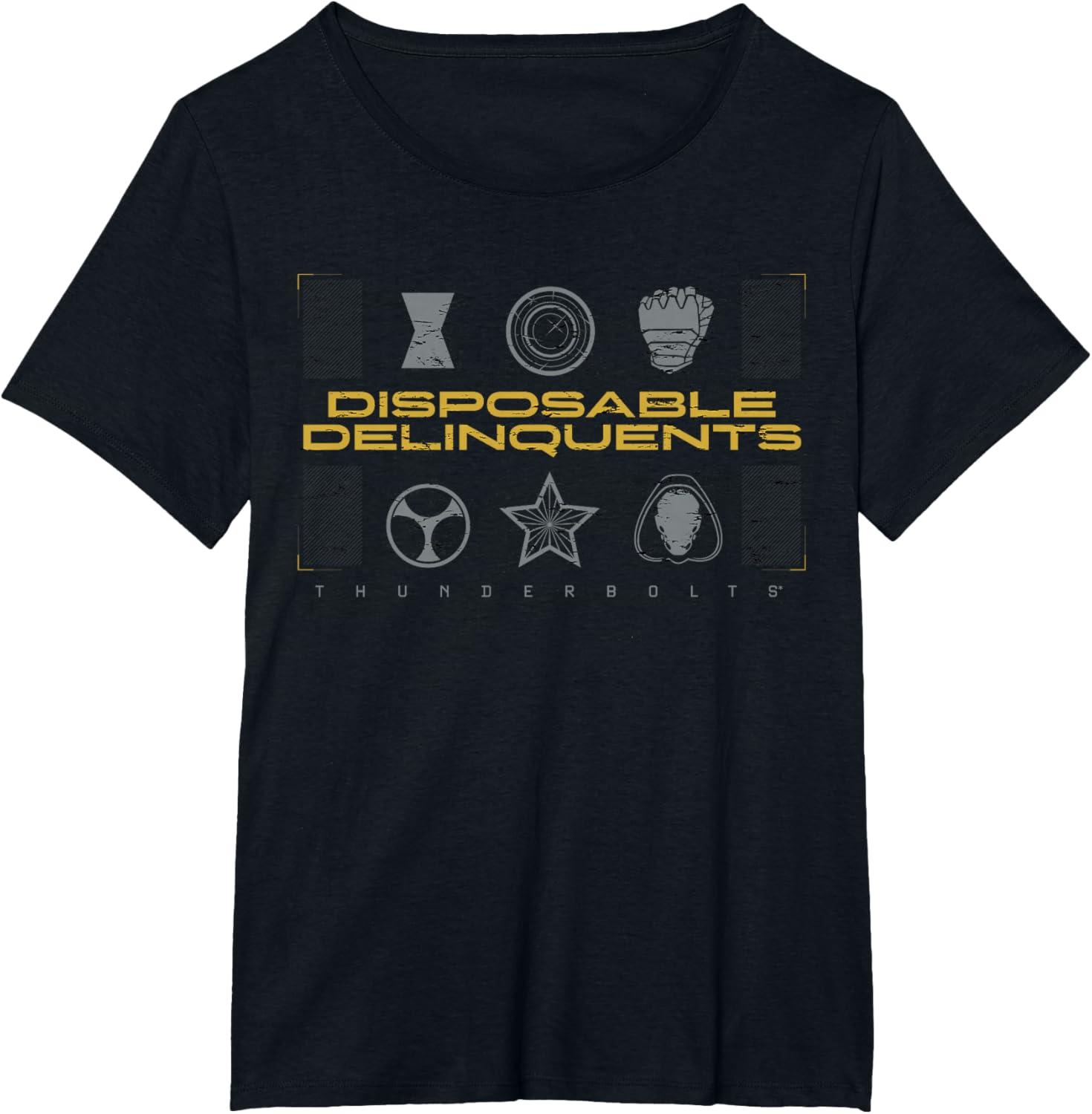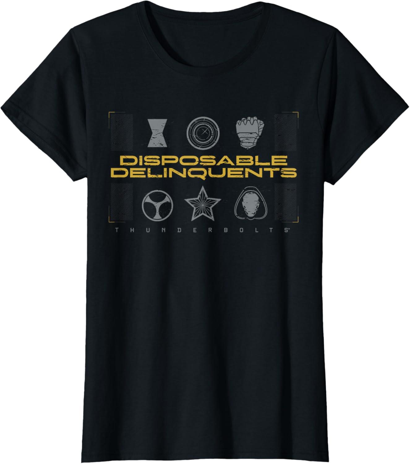 Not super. Not heroes. Not giving up. Join the most unexpected new team in the Marvel Cinematic Universe! This official Marvel tee or hoodie from Marvel Studios' blockbuster movie “Thunderbolts” features an eye-catching distressed design with the message “Disposable Delinquents” above the movie logo, accompanied by icons representing team members Yelena Belova, John F. Walker, Bucky Barnes, Taskmaster, Red Guardian, and Ghost. A great gift for a Marvel Super Heroes, Thunderbolts, or MCU fan! Planning a trip to Avengers Campus at Disney California Adventure Park or another super destination? Get multiples and wear matching Marvel's Thunderbolts t-shirts with friends and family for even more superhero-sized fun! Find it in a t-shirt, premium t-shirt, tank top, v-neck, long sleeve tee, hoodie, and sweatshirt.