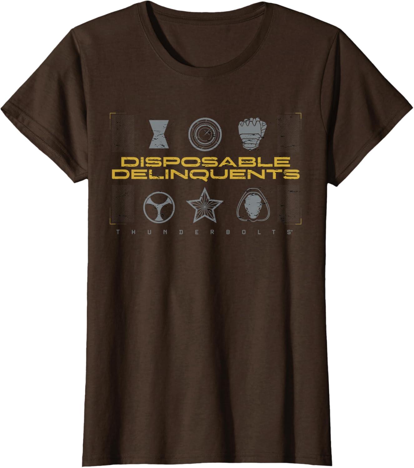 Not super. Not heroes. Not giving up. Join the most unexpected new team in the Marvel Cinematic Universe! This official Marvel tee or hoodie from Marvel Studios' blockbuster movie “Thunderbolts” features an eye-catching distressed design with the message “Disposable Delinquents” above the movie logo, accompanied by icons representing team members Yelena Belova, John F. Walker, Bucky Barnes, Taskmaster, Red Guardian, and Ghost. A great gift for a Marvel Super Heroes, Thunderbolts, or MCU fan! Planning a trip to Avengers Campus at Disney California Adventure Park or another super destination? Get multiples and wear matching Marvel's Thunderbolts t-shirts with friends and family for even more superhero-sized fun! Find it in a t-shirt, premium t-shirt, tank top, v-neck, long sleeve tee, hoodie, and sweatshirt.