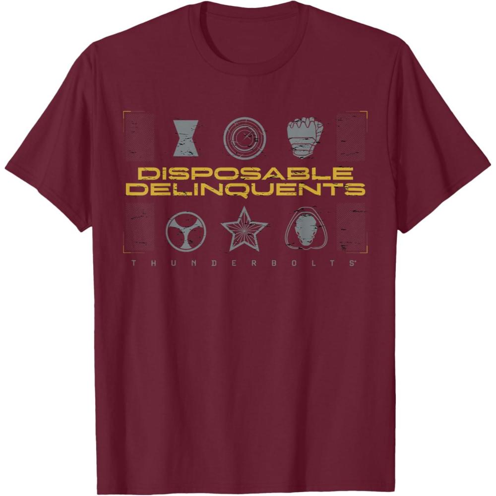 Not super. Not heroes. Not giving up. Join the most unexpected new team in the Marvel Cinematic Universe! This official Marvel tee or hoodie from Marvel Studios' blockbuster movie “Thunderbolts” features an eye-catching distressed design with the message “Disposable Delinquents” above the movie logo, accompanied by icons representing team members Yelena Belova, John F. Walker, Bucky Barnes, Taskmaster, Red Guardian, and Ghost. A great gift for a Marvel Super Heroes, Thunderbolts, or MCU fan! Planning a trip to Avengers Campus at Disney California Adventure Park or another super destination? Get multiples and wear matching Marvel's Thunderbolts t-shirts with friends and family for even more superhero-sized fun! Find it in a t-shirt, premium t-shirt, tank top, v-neck, long sleeve tee, hoodie, and sweatshirt.