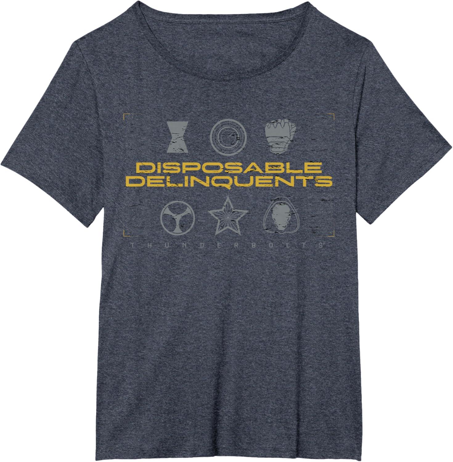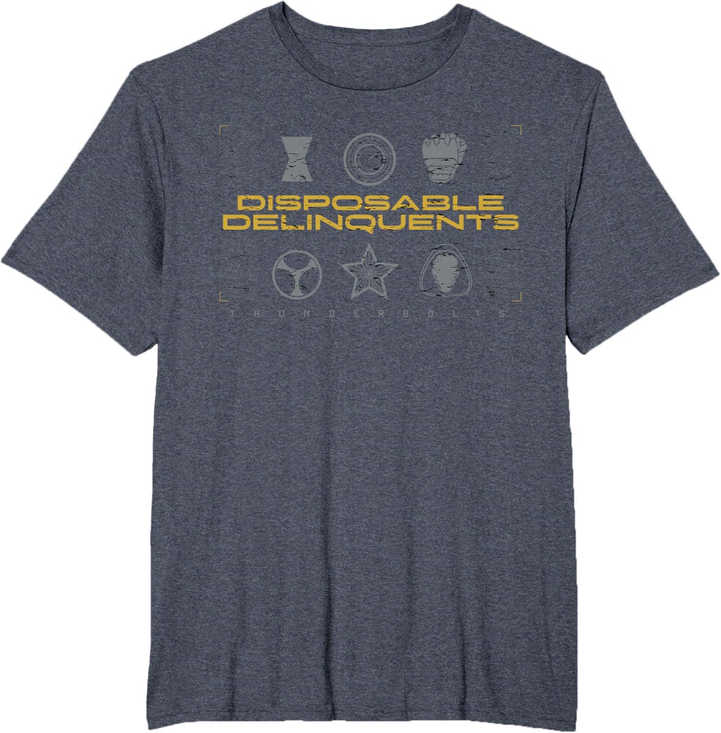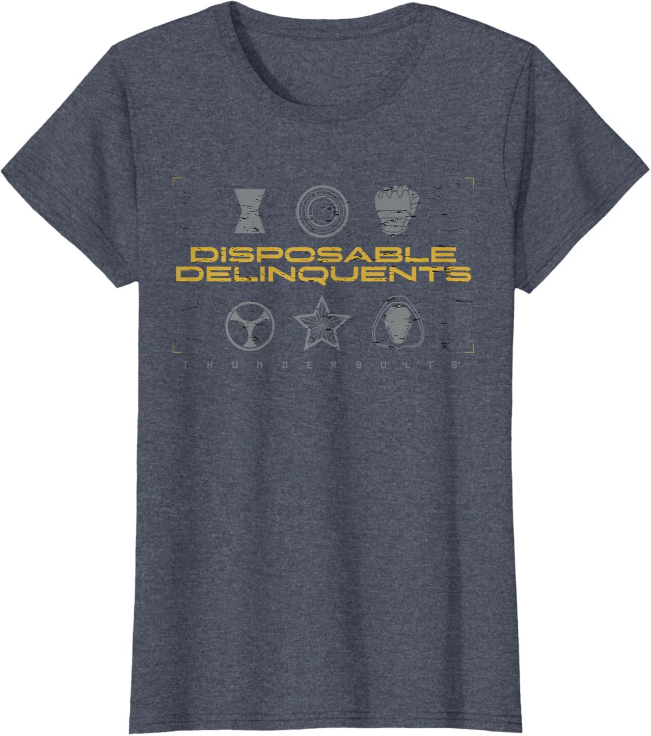 Not super. Not heroes. Not giving up. Join the most unexpected new team in the Marvel Cinematic Universe! This official Marvel tee or hoodie from Marvel Studios' blockbuster movie “Thunderbolts” features an eye-catching distressed design with the message “Disposable Delinquents” above the movie logo, accompanied by icons representing team members Yelena Belova, John F. Walker, Bucky Barnes, Taskmaster, Red Guardian, and Ghost. A great gift for a Marvel Super Heroes, Thunderbolts, or MCU fan! Planning a trip to Avengers Campus at Disney California Adventure Park or another super destination? Get multiples and wear matching Marvel's Thunderbolts t-shirts with friends and family for even more superhero-sized fun! Find it in a t-shirt, premium t-shirt, tank top, v-neck, long sleeve tee, hoodie, and sweatshirt.