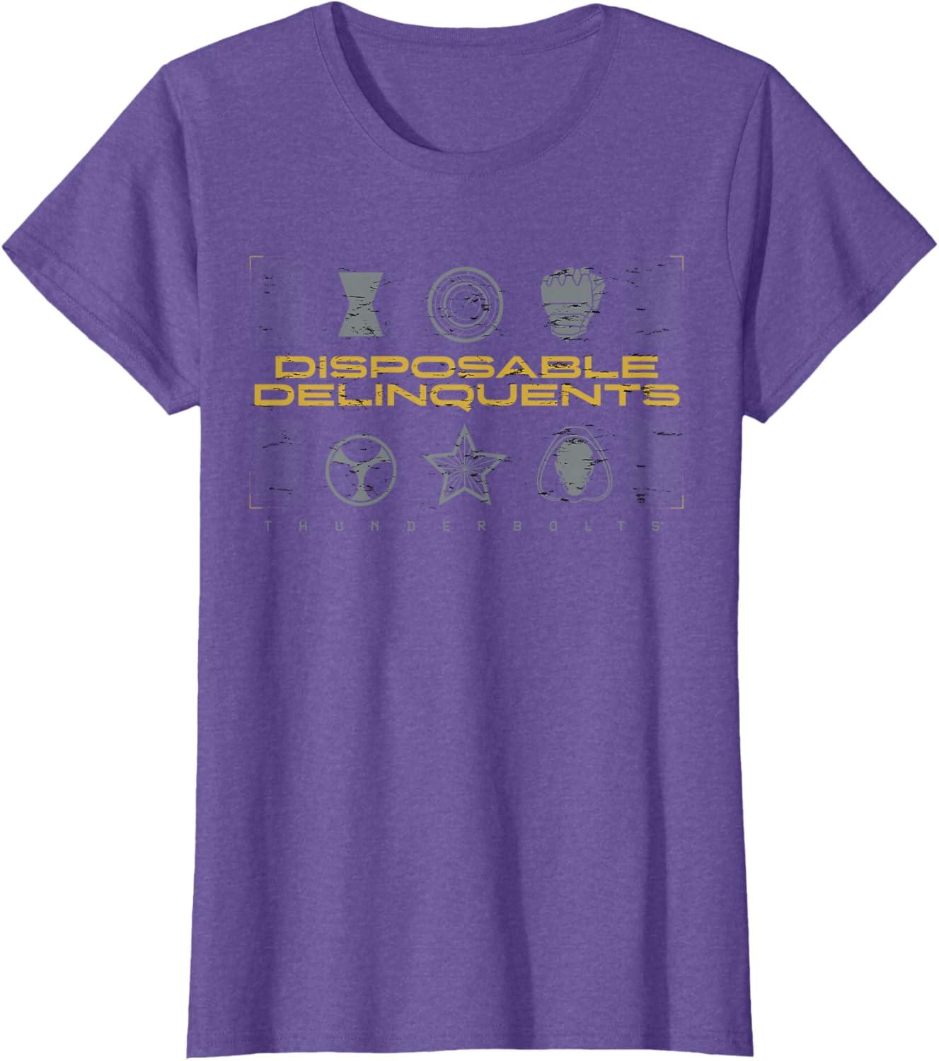 Not super. Not heroes. Not giving up. Join the most unexpected new team in the Marvel Cinematic Universe! This official Marvel tee or hoodie from Marvel Studios' blockbuster movie “Thunderbolts” features an eye-catching distressed design with the message “Disposable Delinquents” above the movie logo, accompanied by icons representing team members Yelena Belova, John F. Walker, Bucky Barnes, Taskmaster, Red Guardian, and Ghost. A great gift for a Marvel Super Heroes, Thunderbolts, or MCU fan! Planning a trip to Avengers Campus at Disney California Adventure Park or another super destination? Get multiples and wear matching Marvel's Thunderbolts t-shirts with friends and family for even more superhero-sized fun! Find it in a t-shirt, premium t-shirt, tank top, v-neck, long sleeve tee, hoodie, and sweatshirt.