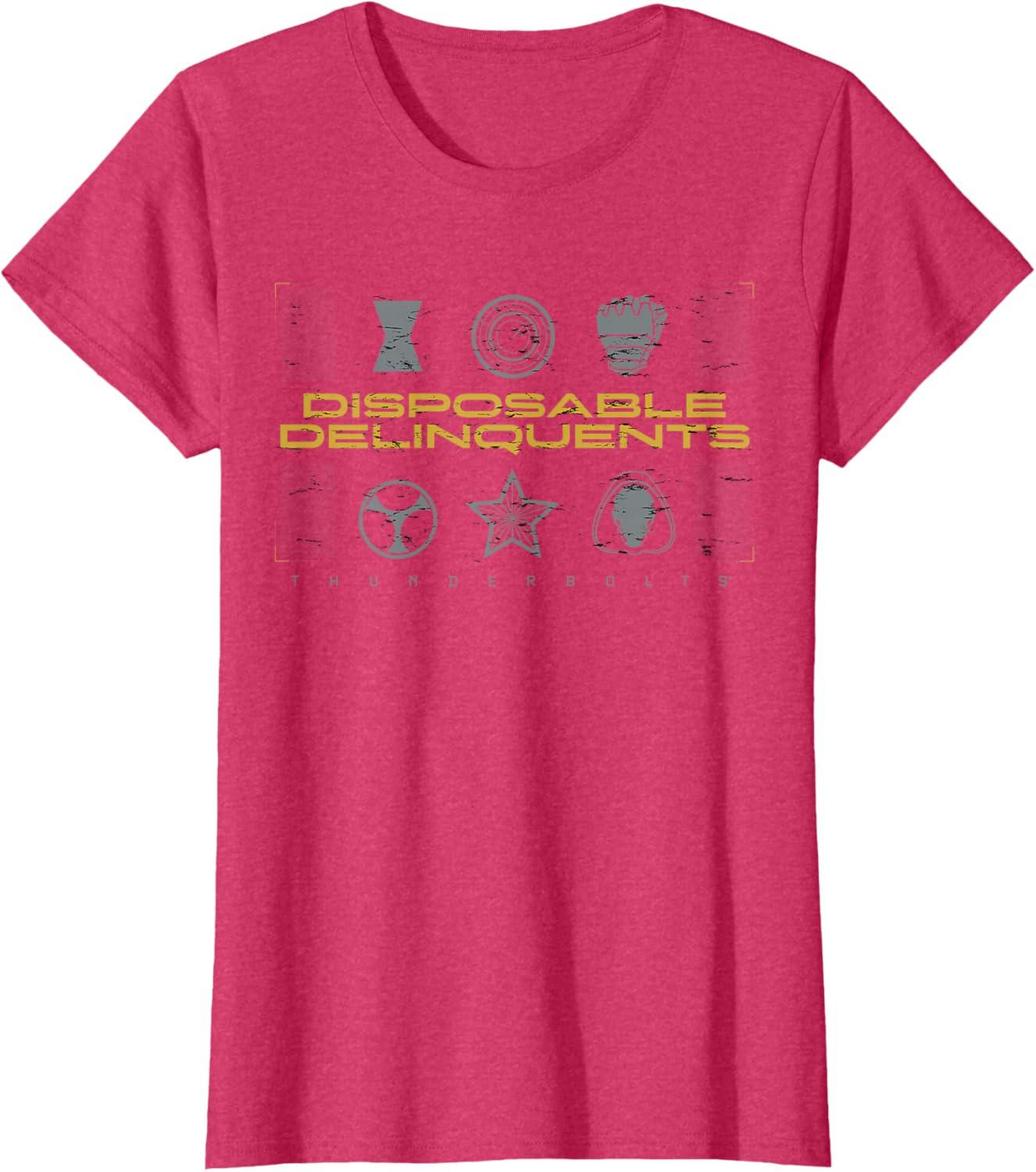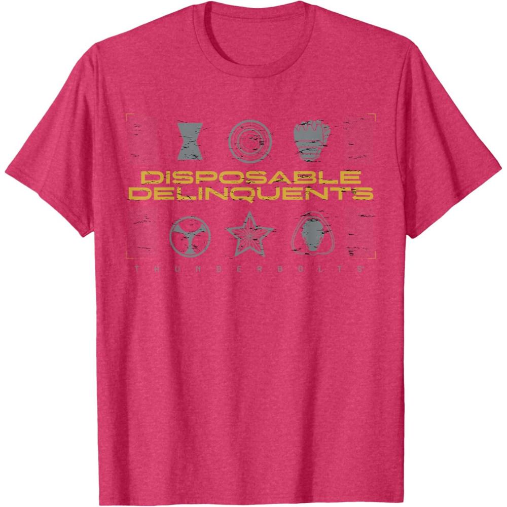 Not super. Not heroes. Not giving up. Join the most unexpected new team in the Marvel Cinematic Universe! This official Marvel tee or hoodie from Marvel Studios' blockbuster movie “Thunderbolts” features an eye-catching distressed design with the message “Disposable Delinquents” above the movie logo, accompanied by icons representing team members Yelena Belova, John F. Walker, Bucky Barnes, Taskmaster, Red Guardian, and Ghost. A great gift for a Marvel Super Heroes, Thunderbolts, or MCU fan! Planning a trip to Avengers Campus at Disney California Adventure Park or another super destination? Get multiples and wear matching Marvel's Thunderbolts t-shirts with friends and family for even more superhero-sized fun! Find it in a t-shirt, premium t-shirt, tank top, v-neck, long sleeve tee, hoodie, and sweatshirt.