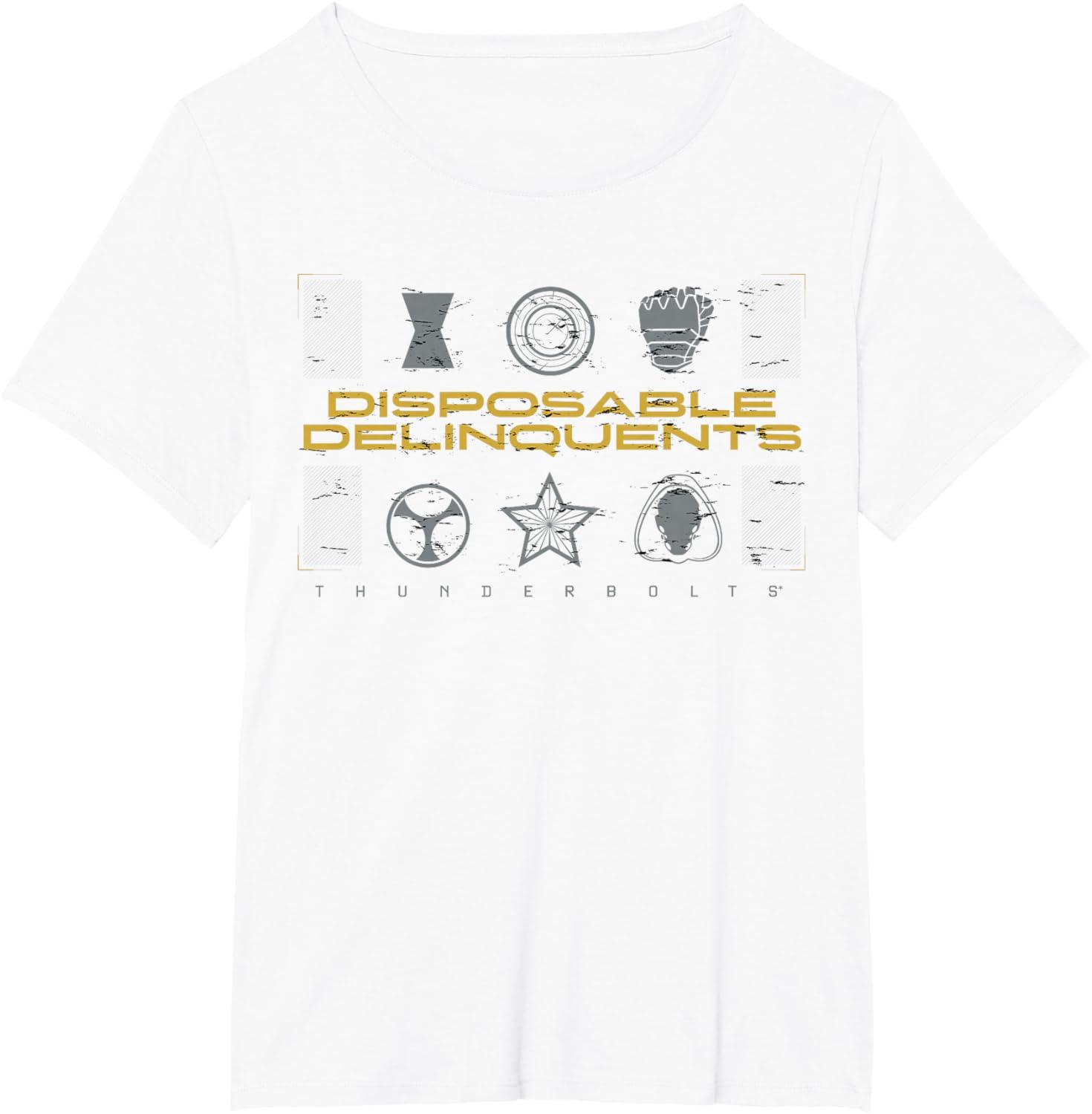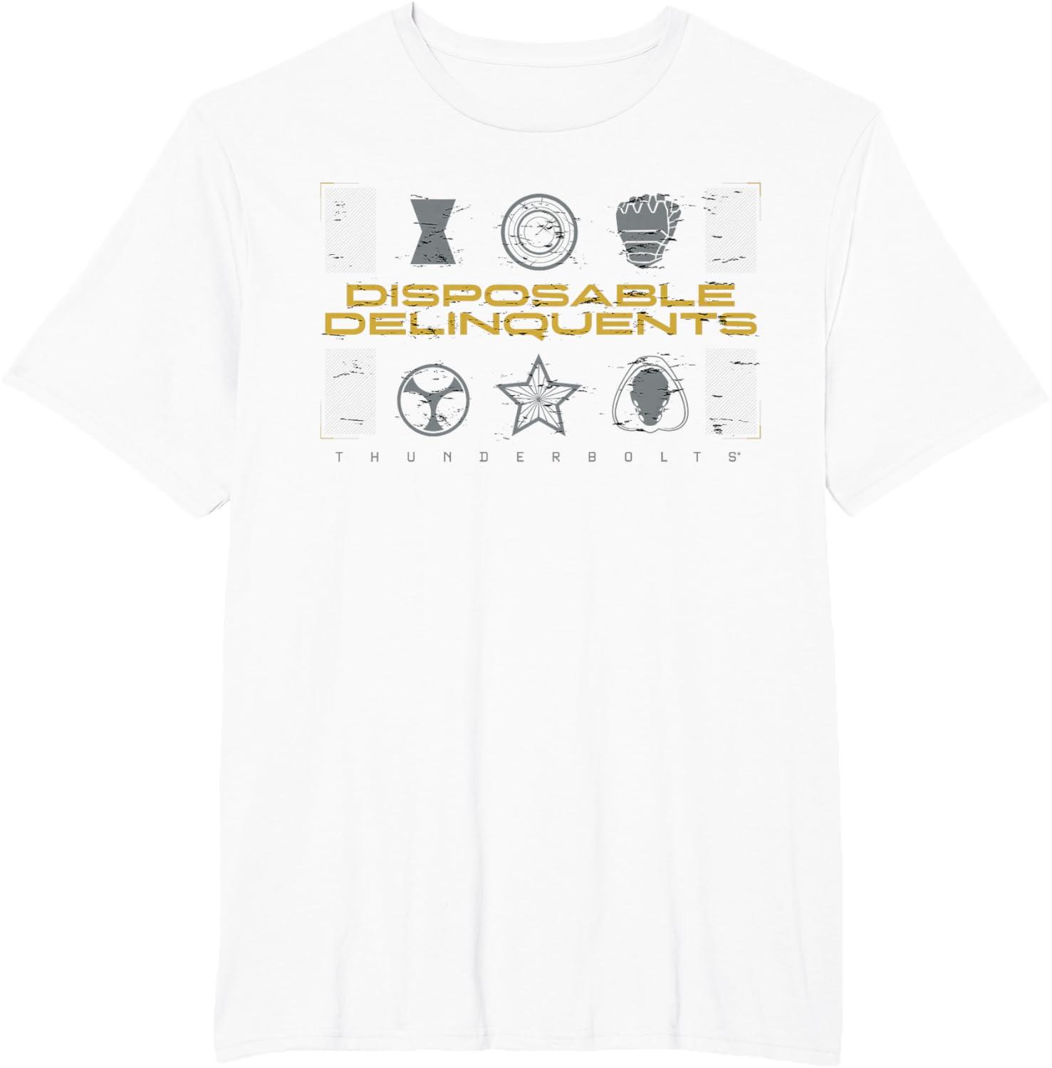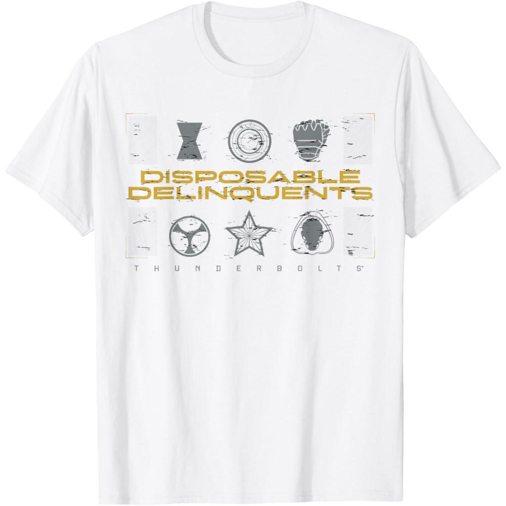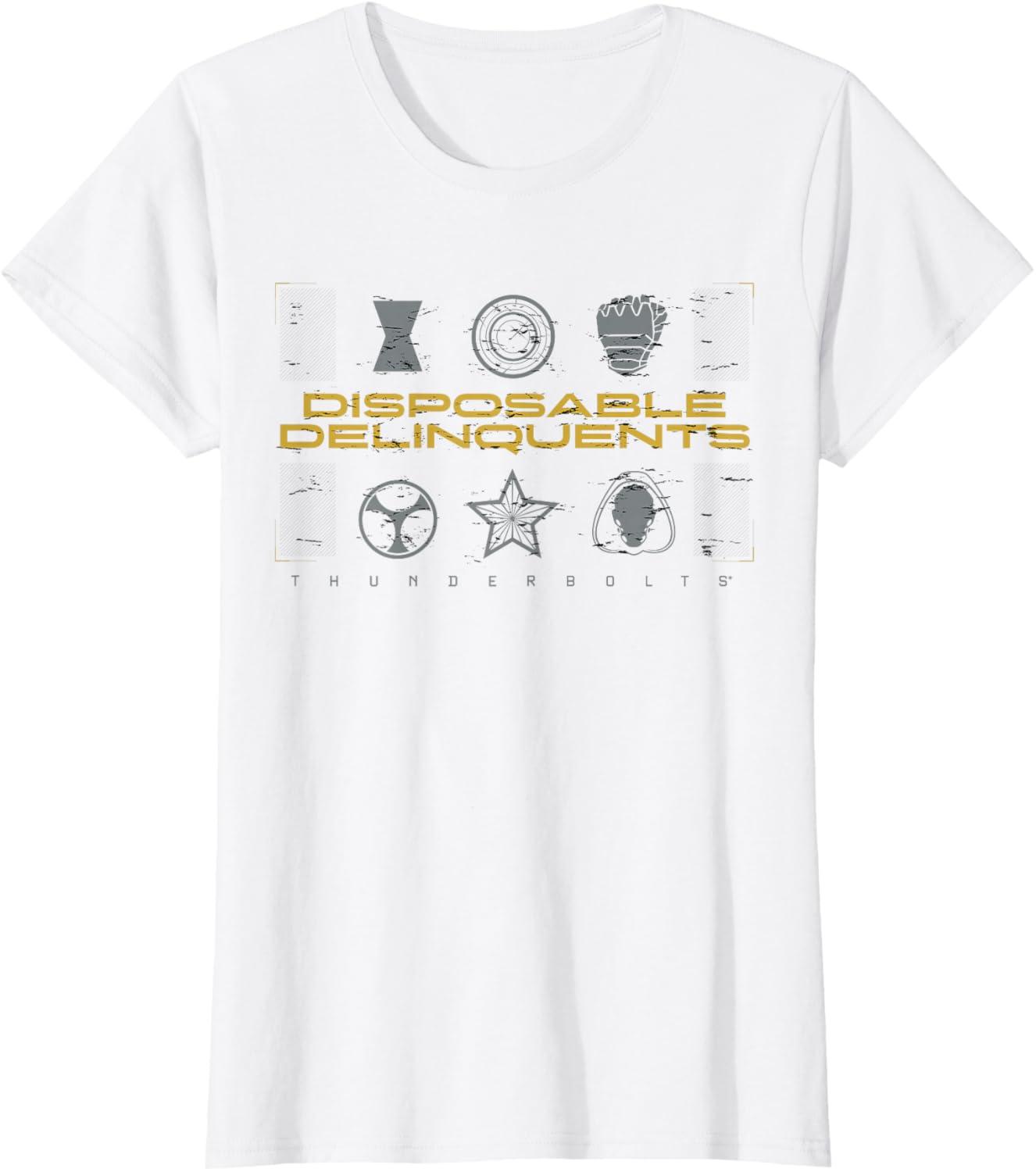 Not super. Not heroes. Not giving up. Join the most unexpected new team in the Marvel Cinematic Universe! This official Marvel tee or hoodie from Marvel Studios' blockbuster movie “Thunderbolts” features an eye-catching distressed design with the message “Disposable Delinquents” above the movie logo, accompanied by icons representing team members Yelena Belova, John F. Walker, Bucky Barnes, Taskmaster, Red Guardian, and Ghost. A great gift for a Marvel Super Heroes, Thunderbolts, or MCU fan! Planning a trip to Avengers Campus at Disney California Adventure Park or another super destination? Get multiples and wear matching Marvel's Thunderbolts t-shirts with friends and family for even more superhero-sized fun! Find it in a t-shirt, premium t-shirt, tank top, v-neck, long sleeve tee, hoodie, and sweatshirt.