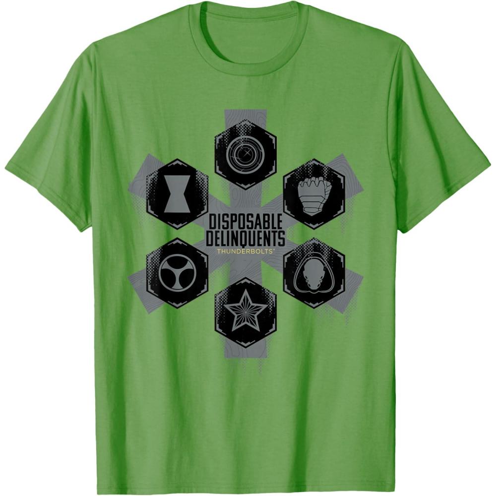 Not super. Not heroes. Not giving up. Join the most unexpected new team in the Marvel Cinematic Universe! This official Marvel tee or hoodie from Marvel Studios' blockbuster movie “Thunderbolts” features an eye-catching battle-worn design with the message “Disposable Delinquents” and the movie logo, accompanied by icons representing team members Yelena Belova, John F. Walker, Bucky Barnes, Taskmaster, Red Guardian, and Ghost. A great gift for a Marvel Super Heroes, Thunderbolts, or MCU fan! Planning a trip to Avengers Campus at Disney California Adventure Park or another super destination? Get multiples and wear matching Marvel's Thunderbolts t-shirts with friends and family for even more superhero-sized fun! Find it in a t-shirt, premium t-shirt, tank top, v-neck, long sleeve tee, hoodie, and sweatshirt.