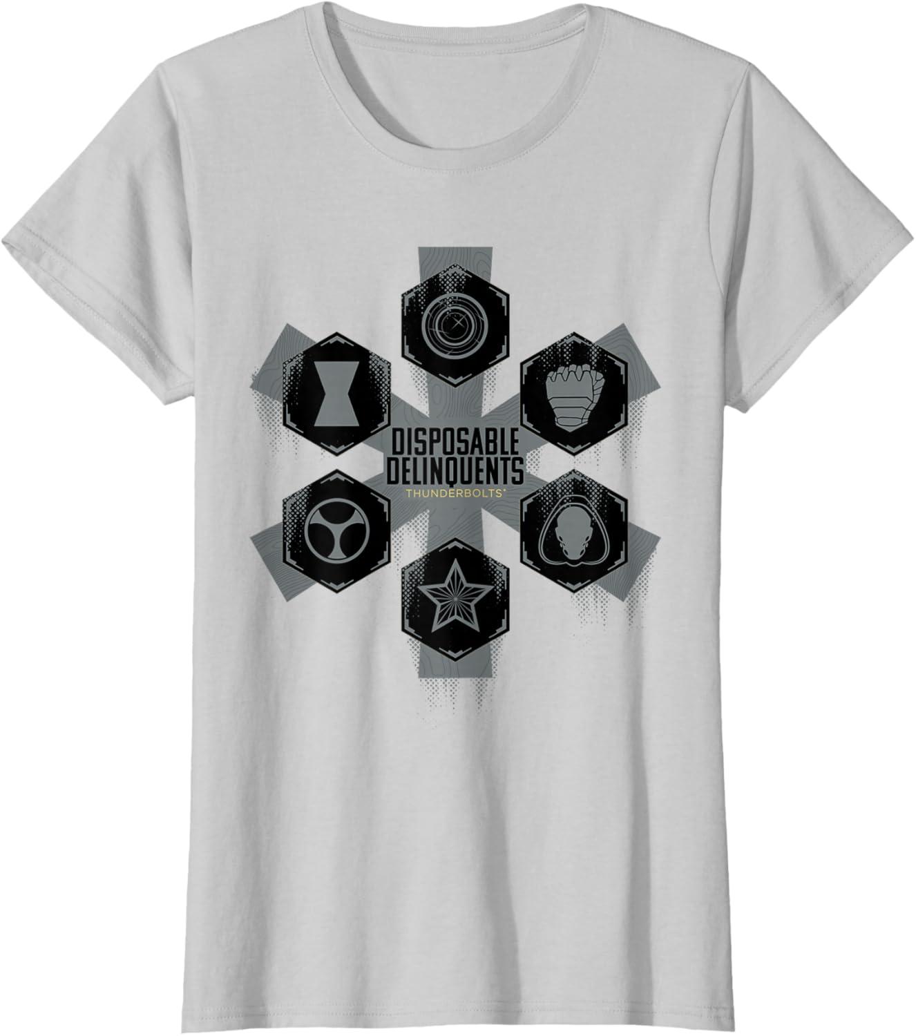 Not super. Not heroes. Not giving up. Join the most unexpected new team in the Marvel Cinematic Universe! This official Marvel tee or hoodie from Marvel Studios' blockbuster movie “Thunderbolts” features an eye-catching battle-worn design with the message “Disposable Delinquents” and the movie logo, accompanied by icons representing team members Yelena Belova, John F. Walker, Bucky Barnes, Taskmaster, Red Guardian, and Ghost. A great gift for a Marvel Super Heroes, Thunderbolts, or MCU fan! Planning a trip to Avengers Campus at Disney California Adventure Park or another super destination? Get multiples and wear matching Marvel's Thunderbolts t-shirts with friends and family for even more superhero-sized fun! Find it in a t-shirt, premium t-shirt, tank top, v-neck, long sleeve tee, hoodie, and sweatshirt.