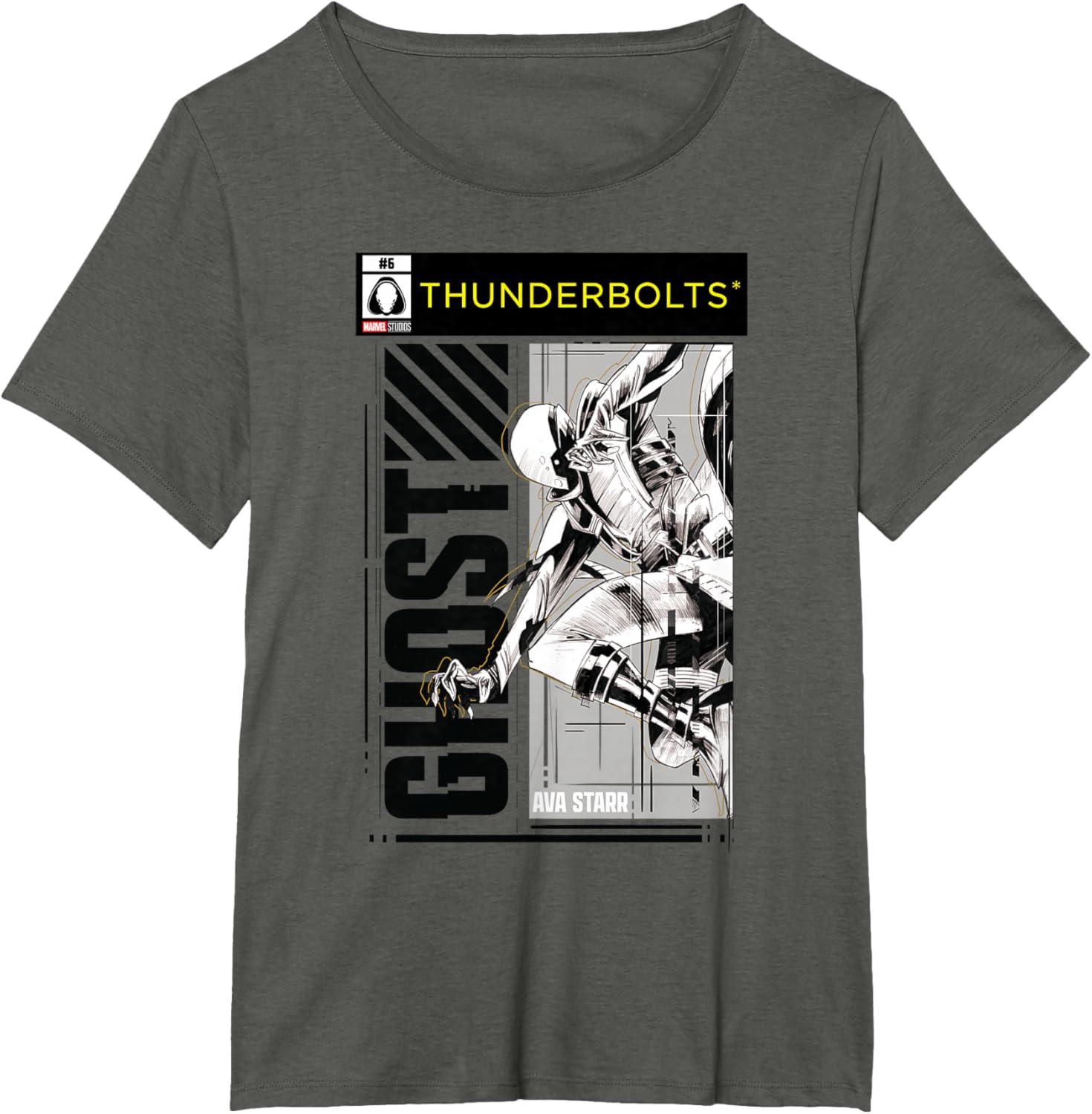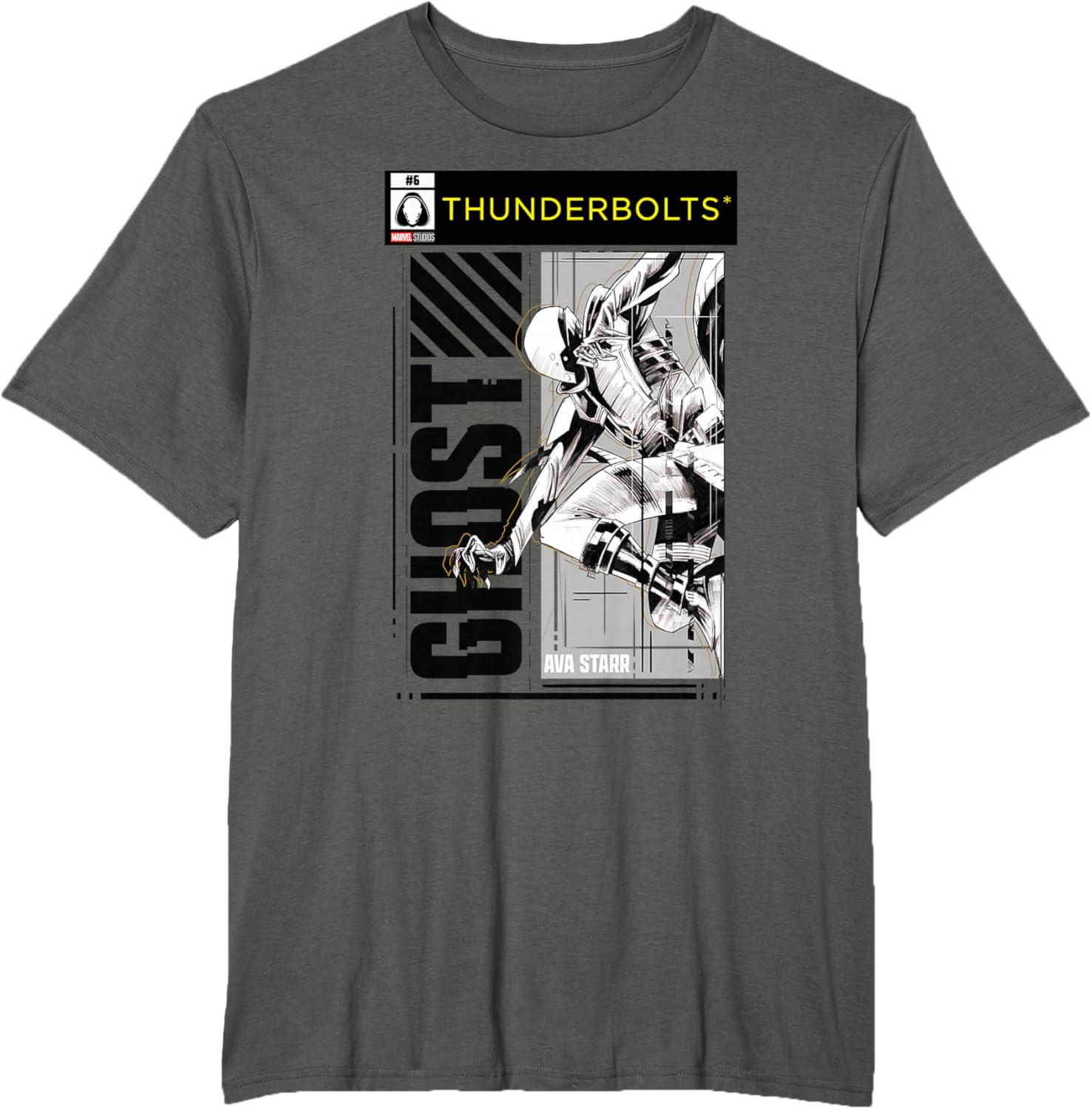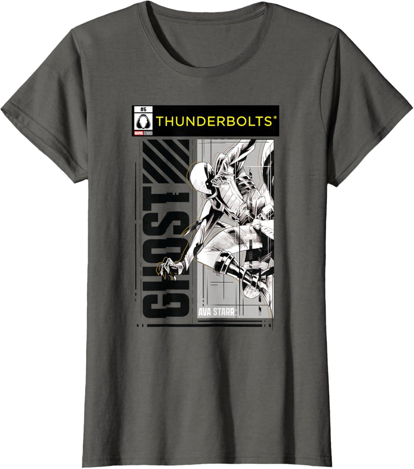 Not super. Not heroes. Not giving up. Join the most unexpected new team in the Marvel Cinematic Universe! This official Marvel tee or hoodie from Marvel Studios' blockbuster movie “Thunderbolts” features action-packed, black-and-white comic cover style art of Ghost, the intangible Ava Starr, with a Thunderbolts logo at the top. A great gift for a Marvel Super Heroes, Thunderbolts, or MCU fan — collect the whole team with numbered designs featuring Yelena Belova, Bucky Barnes, Red Guardian, Taskmaster, and John F. Walker! Planning a trip to Avengers Campus at Disney California Adventure Park or another super destination? Get multiples and wear matching Marvel's Thunderbolts t-shirts with friends and family for even more superhero-sized fun! Find it in a t-shirt, premium t-shirt, tank top, v-neck, long sleeve tee, hoodie, and sweatshirt.