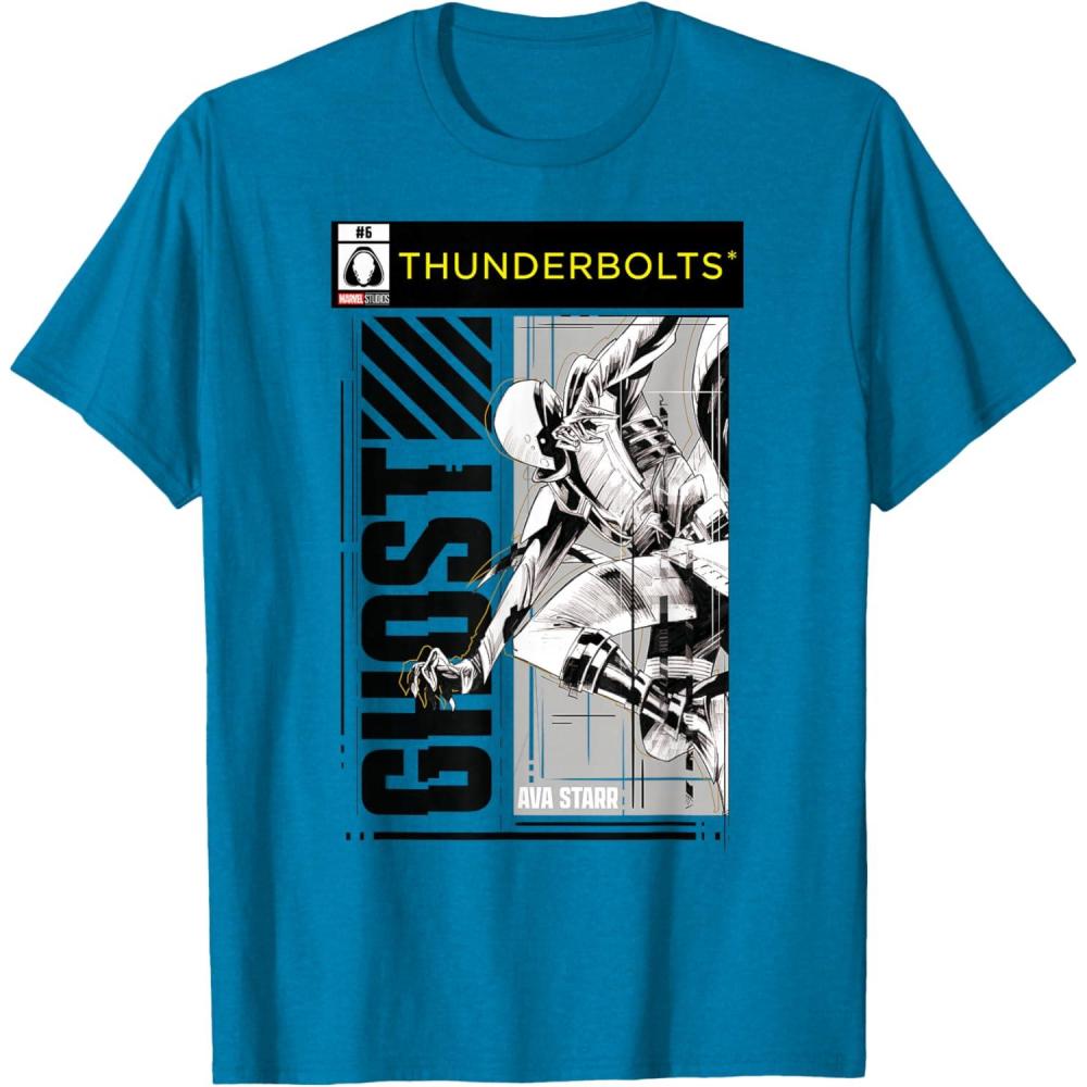 Not super. Not heroes. Not giving up. Join the most unexpected new team in the Marvel Cinematic Universe! This official Marvel tee or hoodie from Marvel Studios' blockbuster movie “Thunderbolts” features action-packed, black-and-white comic cover style art of Ghost, the intangible Ava Starr, with a Thunderbolts logo at the top. A great gift for a Marvel Super Heroes, Thunderbolts, or MCU fan — collect the whole team with numbered designs featuring Yelena Belova, Bucky Barnes, Red Guardian, Taskmaster, and John F. Walker! Planning a trip to Avengers Campus at Disney California Adventure Park or another super destination? Get multiples and wear matching Marvel's Thunderbolts t-shirts with friends and family for even more superhero-sized fun! Find it in a t-shirt, premium t-shirt, tank top, v-neck, long sleeve tee, hoodie, and sweatshirt.