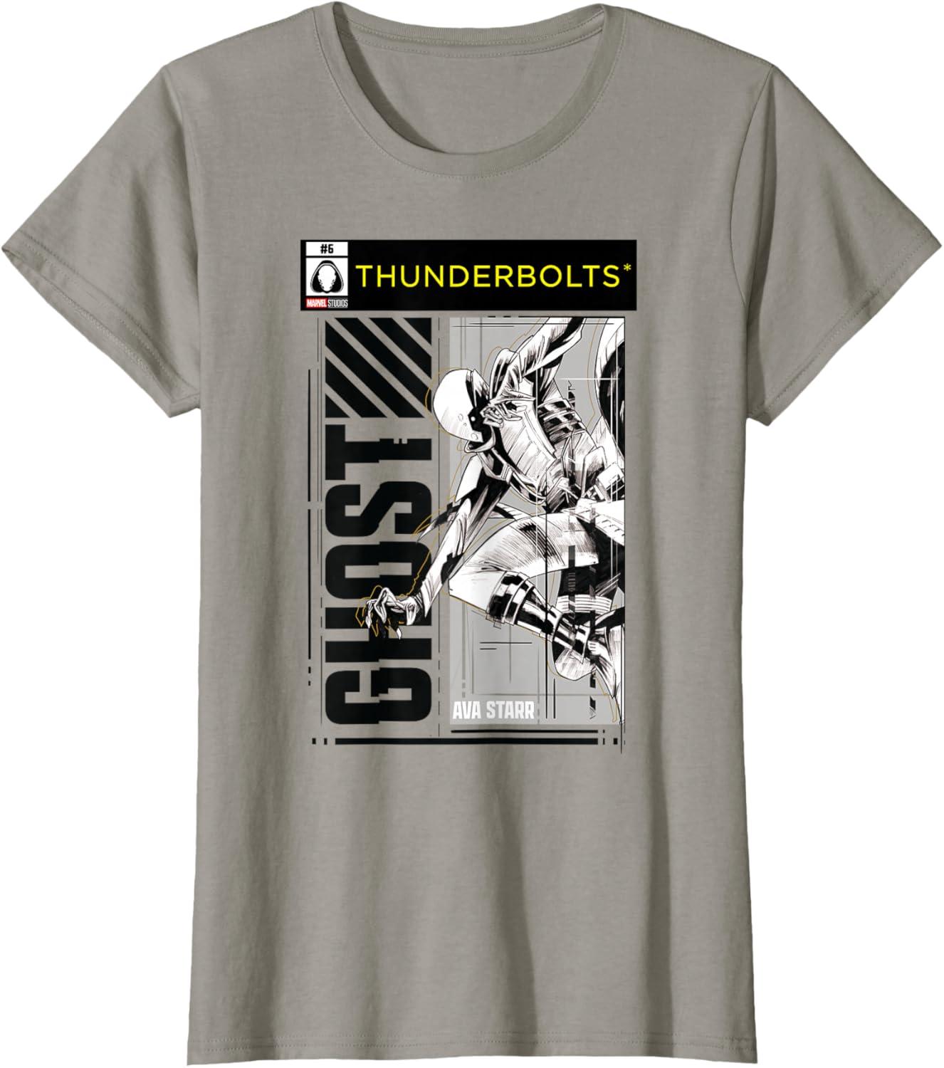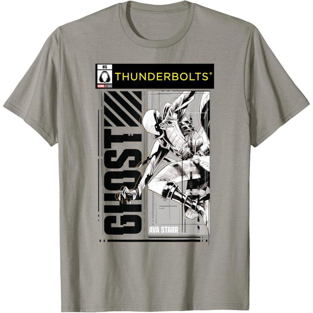 Not super. Not heroes. Not giving up. Join the most unexpected new team in the Marvel Cinematic Universe! This official Marvel tee or hoodie from Marvel Studios' blockbuster movie “Thunderbolts” features action-packed, black-and-white comic cover style art of Ghost, the intangible Ava Starr, with a Thunderbolts logo at the top. A great gift for a Marvel Super Heroes, Thunderbolts, or MCU fan — collect the whole team with numbered designs featuring Yelena Belova, Bucky Barnes, Red Guardian, Taskmaster, and John F. Walker! Planning a trip to Avengers Campus at Disney California Adventure Park or another super destination? Get multiples and wear matching Marvel's Thunderbolts t-shirts with friends and family for even more superhero-sized fun! Find it in a t-shirt, premium t-shirt, tank top, v-neck, long sleeve tee, hoodie, and sweatshirt.