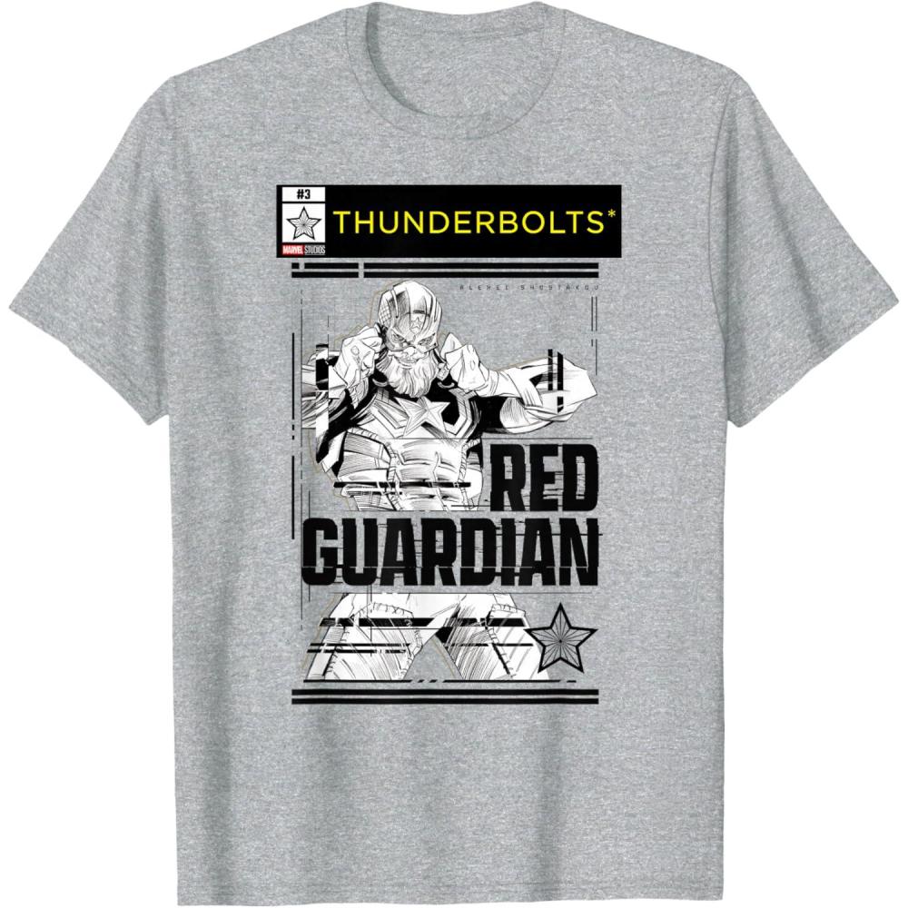 Not super. Not heroes. Not giving up. Join the most unexpected new team in the Marvel Cinematic Universe! This official Marvel tee or hoodie from Marvel Studios' blockbuster movie “Thunderbolts” features action-packed, black-and-white comic cover style art of Red Guardian, the former Russian super soldier Alexei Shostakov, with a Thunderbolts logo at the top. A great gift for a Marvel Super Heroes, Thunderbolts, or MCU fan — collect the whole team with numbered designs featuring Yelena Belova, Bucky Barnes, Taskmaster, John F. Walker, and Ghost! Planning a trip to Avengers Campus at Disney California Adventure Park or another super destination? Get multiples and wear matching Marvel's Thunderbolts t-shirts with friends and family for even more superhero-sized fun! Find it in a t-shirt, premium t-shirt, tank top, v-neck, long sleeve tee, hoodie, and sweatshirt.