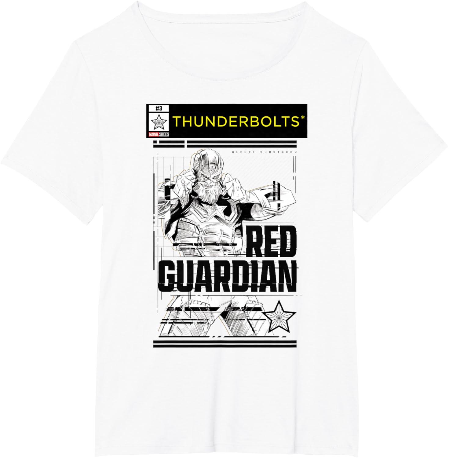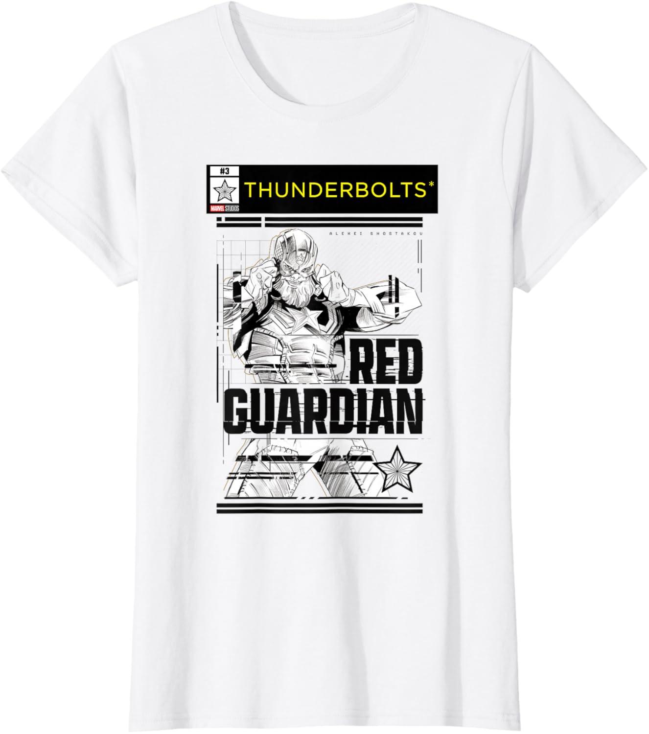 Not super. Not heroes. Not giving up. Join the most unexpected new team in the Marvel Cinematic Universe! This official Marvel tee or hoodie from Marvel Studios' blockbuster movie “Thunderbolts” features action-packed, black-and-white comic cover style art of Red Guardian, the former Russian super soldier Alexei Shostakov, with a Thunderbolts logo at the top. A great gift for a Marvel Super Heroes, Thunderbolts, or MCU fan — collect the whole team with numbered designs featuring Yelena Belova, Bucky Barnes, Taskmaster, John F. Walker, and Ghost! Planning a trip to Avengers Campus at Disney California Adventure Park or another super destination? Get multiples and wear matching Marvel's Thunderbolts t-shirts with friends and family for even more superhero-sized fun! Find it in a t-shirt, premium t-shirt, tank top, v-neck, long sleeve tee, hoodie, and sweatshirt.