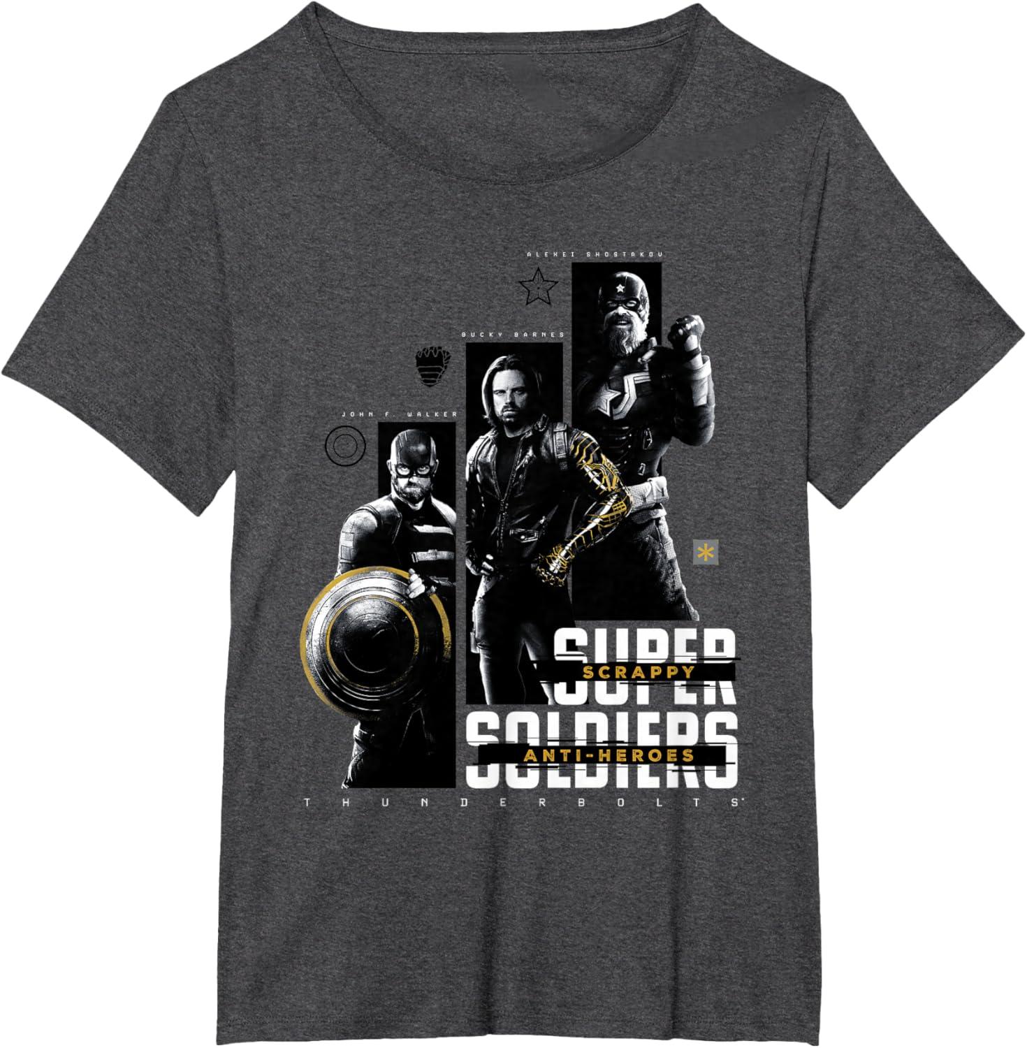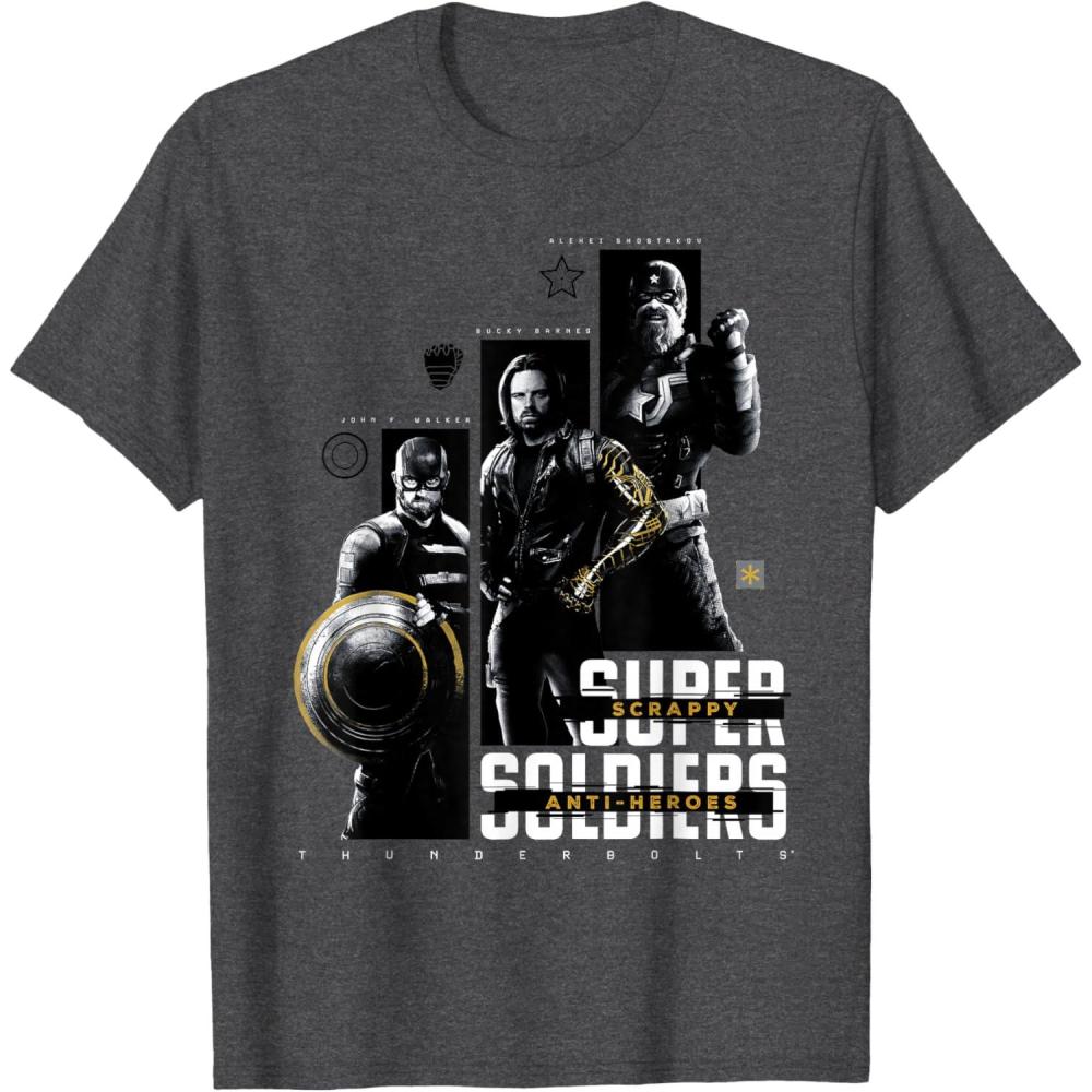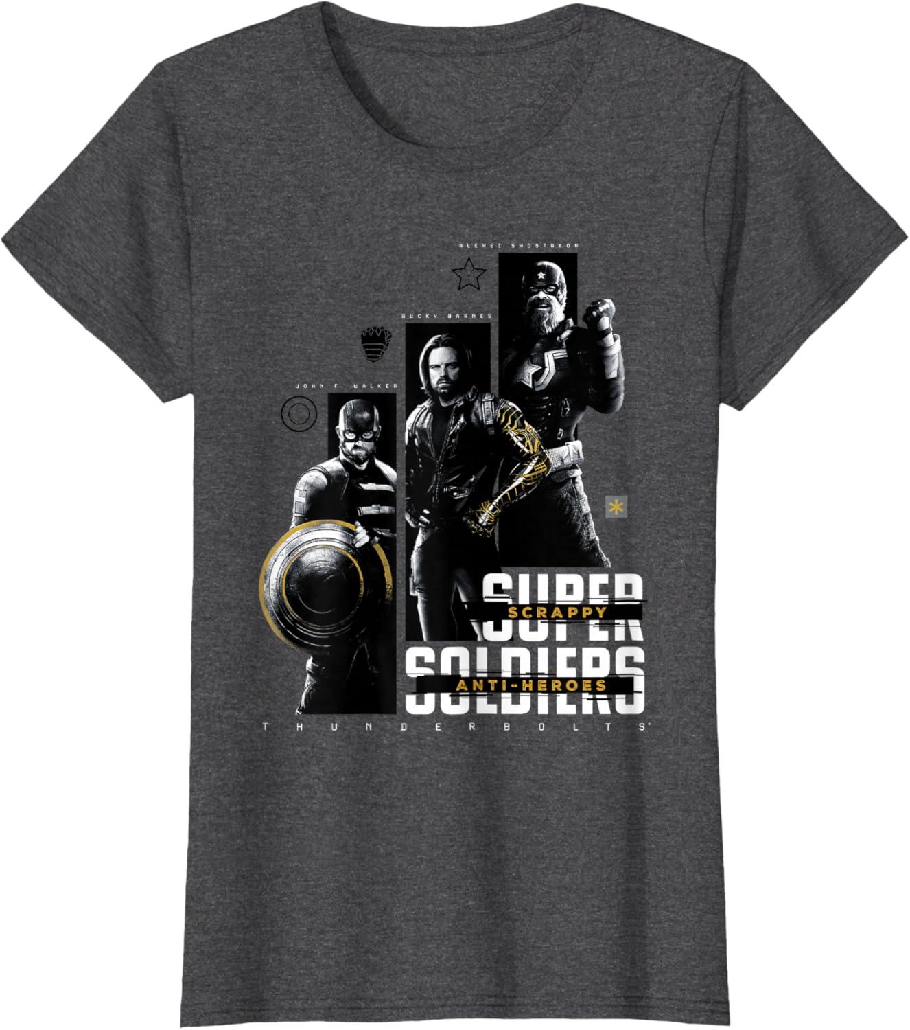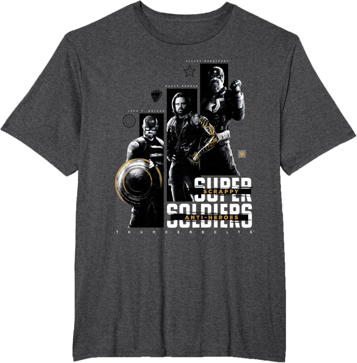 They're not super soldiers, they're scrappy anti-heroes! Join the most unexpected new team in the Marvel Cinematic Universe with this official Marvel tee or hoodie from Marvel Studios' blockbuster movie “Thunderbolts”, featuring eye-catching monochrome images of John F. Walker, Bucky Barnes, and Red Guardian with yellow accents and the message “Scrappy Anti-Heroes” written across the text “Super Soldiers”, plus the iconic movie logo underneath. A great gift for a Marvel Super Heroes, Thunderbolts, or MCU fan! Planning a trip to Avengers Campus at Disney California Adventure Park or another super destination? Get multiples and wear matching Marvel's Thunderbolts t-shirts with friends and family for even more superhero-sized fun! Find it in a t-shirt, premium t-shirt, tank top, v-neck, long sleeve tee, hoodie, and sweatshirt.