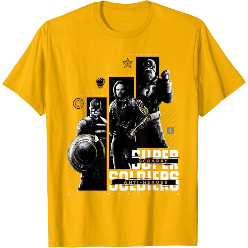 They're not super soldiers, they're scrappy anti-heroes! Join the most unexpected new team in the Marvel Cinematic Universe with this official Marvel tee or hoodie from Marvel Studios' blockbuster movie “Thunderbolts”, featuring eye-catching monochrome images of John F. Walker, Bucky Barnes, and Red Guardian with yellow accents and the message “Scrappy Anti-Heroes” written across the text “Super Soldiers”, plus the iconic movie logo underneath. A great gift for a Marvel Super Heroes, Thunderbolts, or MCU fan! Planning a trip to Avengers Campus at Disney California Adventure Park or another super destination? Get multiples and wear matching Marvel's Thunderbolts t-shirts with friends and family for even more superhero-sized fun! Find it in a t-shirt, premium t-shirt, tank top, v-neck, long sleeve tee, hoodie, and sweatshirt.