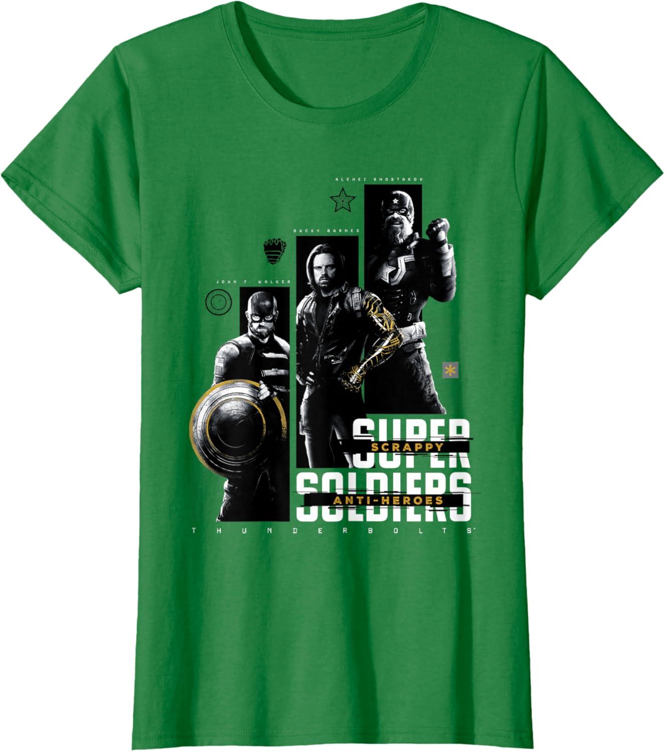They're not super soldiers, they're scrappy anti-heroes! Join the most unexpected new team in the Marvel Cinematic Universe with this official Marvel tee or hoodie from Marvel Studios' blockbuster movie “Thunderbolts”, featuring eye-catching monochrome images of John F. Walker, Bucky Barnes, and Red Guardian with yellow accents and the message “Scrappy Anti-Heroes” written across the text “Super Soldiers”, plus the iconic movie logo underneath. A great gift for a Marvel Super Heroes, Thunderbolts, or MCU fan! Planning a trip to Avengers Campus at Disney California Adventure Park or another super destination? Get multiples and wear matching Marvel's Thunderbolts t-shirts with friends and family for even more superhero-sized fun! Find it in a t-shirt, premium t-shirt, tank top, v-neck, long sleeve tee, hoodie, and sweatshirt.