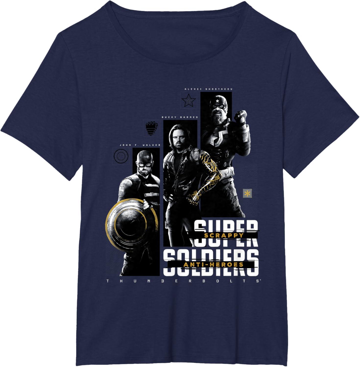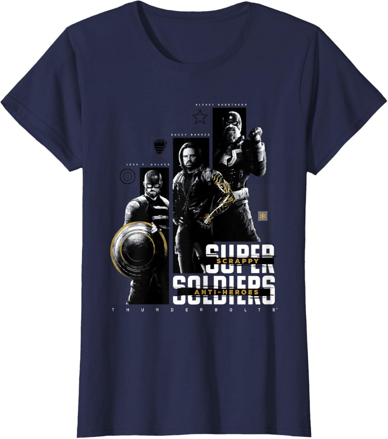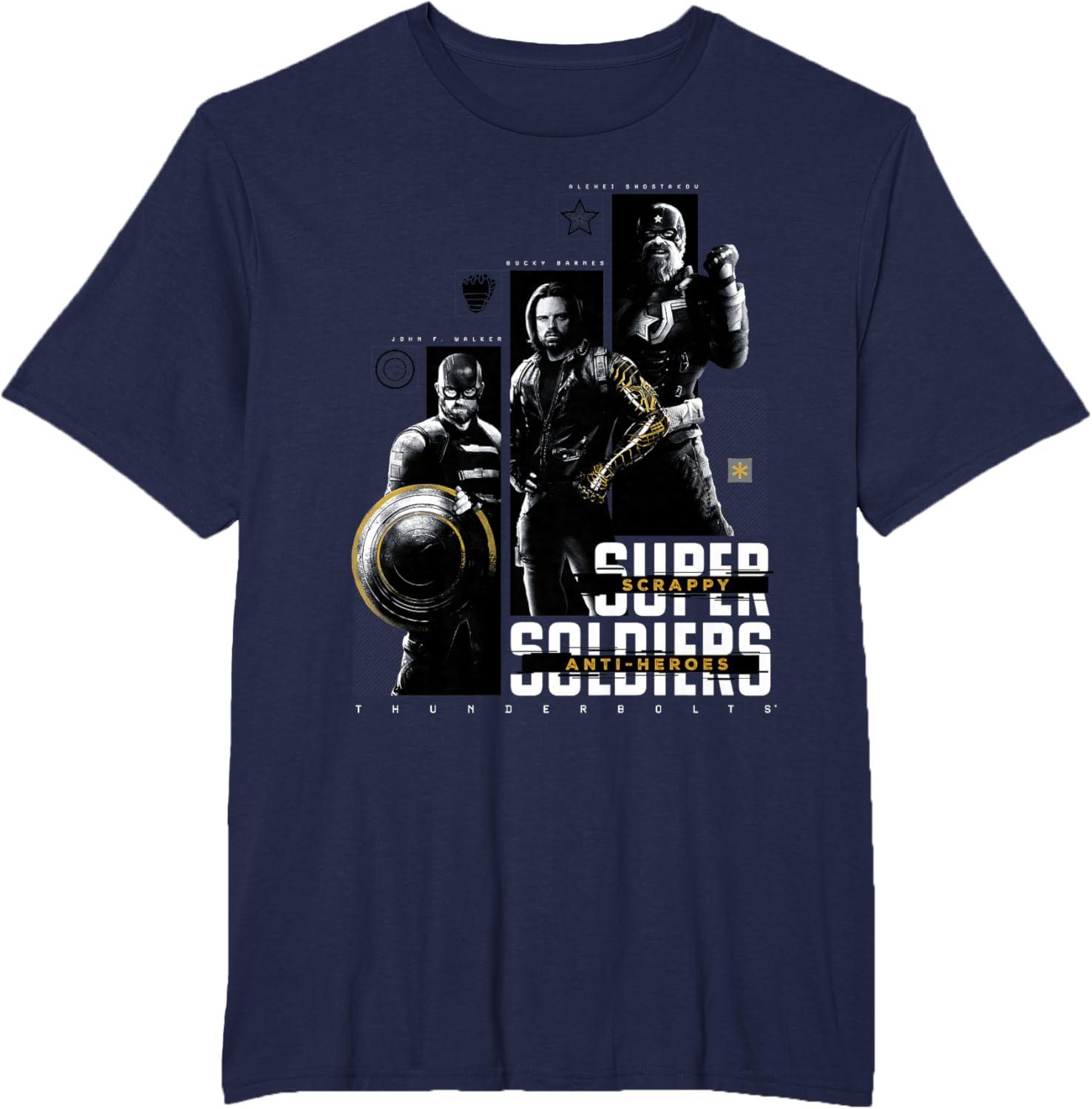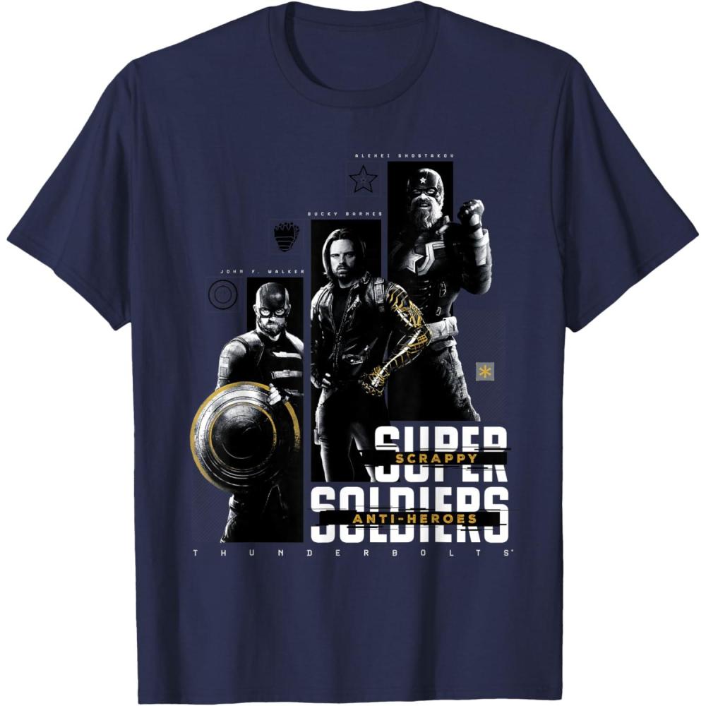They're not super soldiers, they're scrappy anti-heroes! Join the most unexpected new team in the Marvel Cinematic Universe with this official Marvel tee or hoodie from Marvel Studios' blockbuster movie “Thunderbolts”, featuring eye-catching monochrome images of John F. Walker, Bucky Barnes, and Red Guardian with yellow accents and the message “Scrappy Anti-Heroes” written across the text “Super Soldiers”, plus the iconic movie logo underneath. A great gift for a Marvel Super Heroes, Thunderbolts, or MCU fan! Planning a trip to Avengers Campus at Disney California Adventure Park or another super destination? Get multiples and wear matching Marvel's Thunderbolts t-shirts with friends and family for even more superhero-sized fun! Find it in a t-shirt, premium t-shirt, tank top, v-neck, long sleeve tee, hoodie, and sweatshirt.