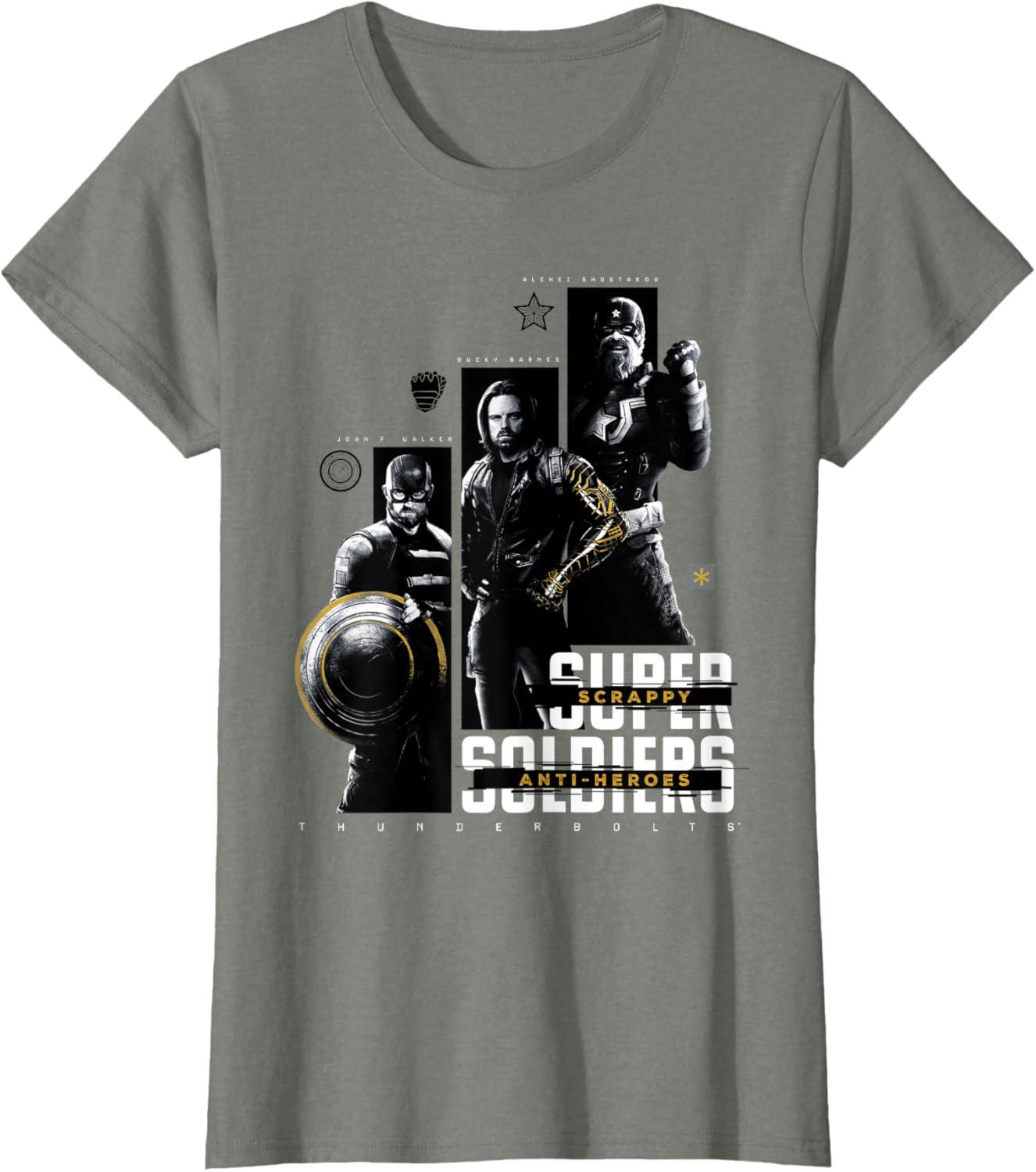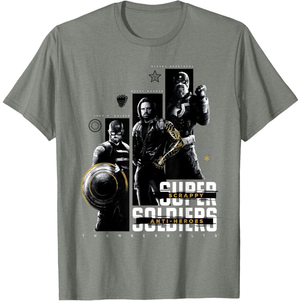 They're not super soldiers, they're scrappy anti-heroes! Join the most unexpected new team in the Marvel Cinematic Universe with this official Marvel tee or hoodie from Marvel Studios' blockbuster movie “Thunderbolts”, featuring eye-catching monochrome images of John F. Walker, Bucky Barnes, and Red Guardian with yellow accents and the message “Scrappy Anti-Heroes” written across the text “Super Soldiers”, plus the iconic movie logo underneath. A great gift for a Marvel Super Heroes, Thunderbolts, or MCU fan! Planning a trip to Avengers Campus at Disney California Adventure Park or another super destination? Get multiples and wear matching Marvel's Thunderbolts t-shirts with friends and family for even more superhero-sized fun! Find it in a t-shirt, premium t-shirt, tank top, v-neck, long sleeve tee, hoodie, and sweatshirt.