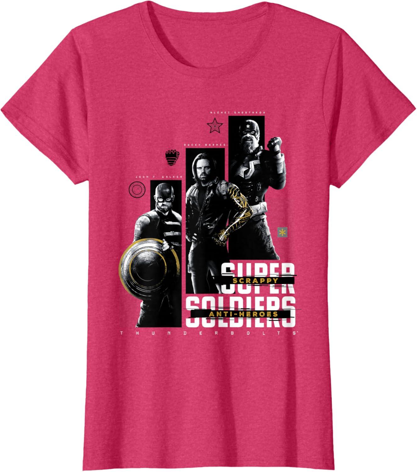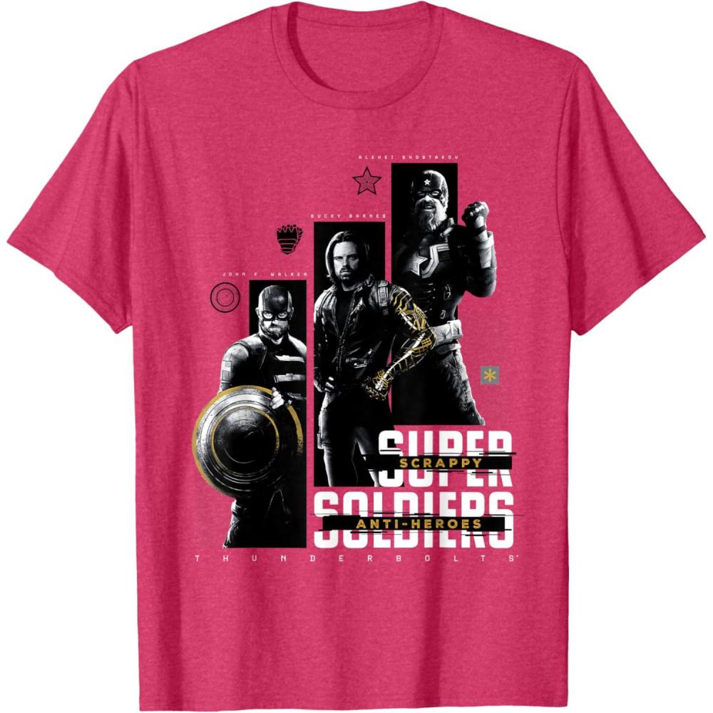 They're not super soldiers, they're scrappy anti-heroes! Join the most unexpected new team in the Marvel Cinematic Universe with this official Marvel tee or hoodie from Marvel Studios' blockbuster movie “Thunderbolts”, featuring eye-catching monochrome images of John F. Walker, Bucky Barnes, and Red Guardian with yellow accents and the message “Scrappy Anti-Heroes” written across the text “Super Soldiers”, plus the iconic movie logo underneath. A great gift for a Marvel Super Heroes, Thunderbolts, or MCU fan! Planning a trip to Avengers Campus at Disney California Adventure Park or another super destination? Get multiples and wear matching Marvel's Thunderbolts t-shirts with friends and family for even more superhero-sized fun! Find it in a t-shirt, premium t-shirt, tank top, v-neck, long sleeve tee, hoodie, and sweatshirt.