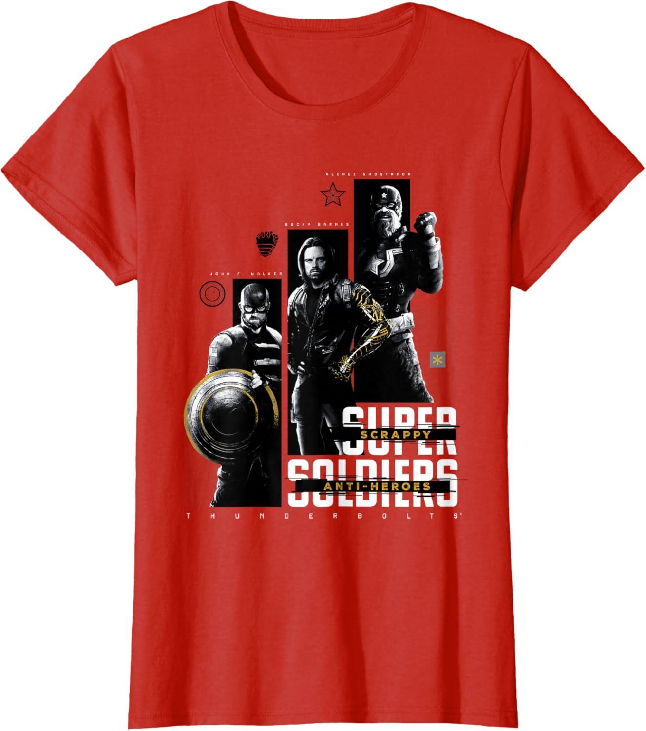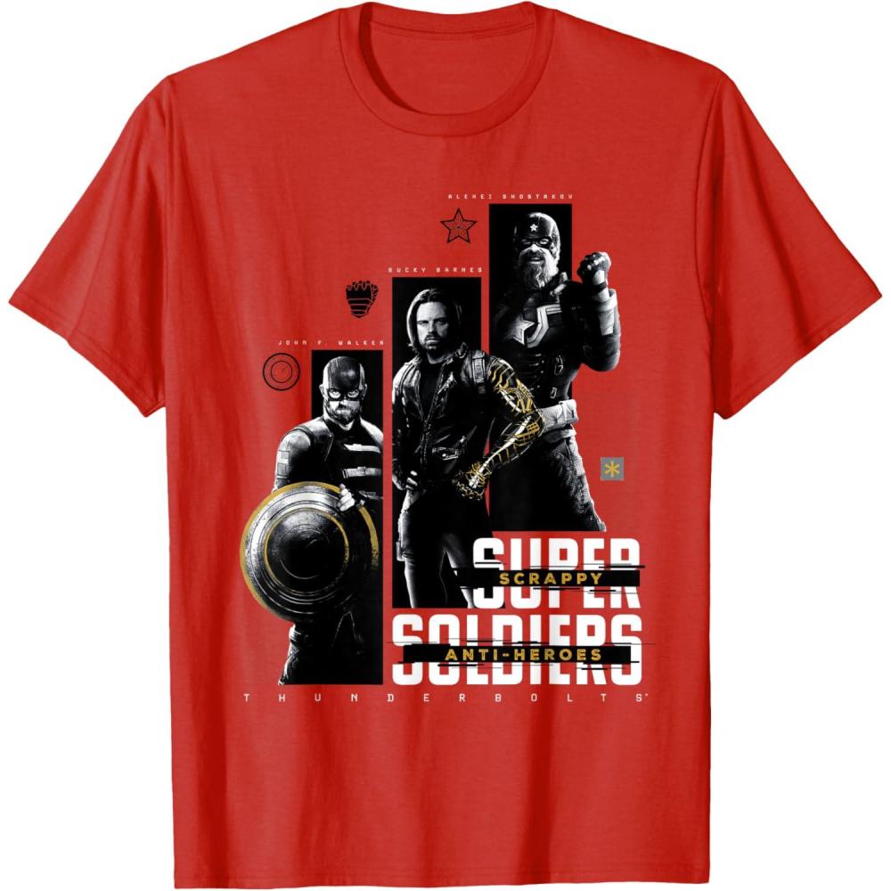 They're not super soldiers, they're scrappy anti-heroes! Join the most unexpected new team in the Marvel Cinematic Universe with this official Marvel tee or hoodie from Marvel Studios' blockbuster movie “Thunderbolts”, featuring eye-catching monochrome images of John F. Walker, Bucky Barnes, and Red Guardian with yellow accents and the message “Scrappy Anti-Heroes” written across the text “Super Soldiers”, plus the iconic movie logo underneath. A great gift for a Marvel Super Heroes, Thunderbolts, or MCU fan! Planning a trip to Avengers Campus at Disney California Adventure Park or another super destination? Get multiples and wear matching Marvel's Thunderbolts t-shirts with friends and family for even more superhero-sized fun! Find it in a t-shirt, premium t-shirt, tank top, v-neck, long sleeve tee, hoodie, and sweatshirt.