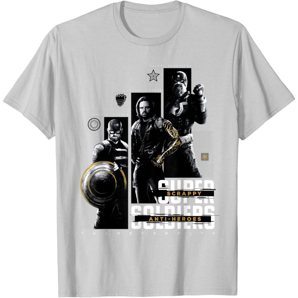 They're not super soldiers, they're scrappy anti-heroes! Join the most unexpected new team in the Marvel Cinematic Universe with this official Marvel tee or hoodie from Marvel Studios' blockbuster movie “Thunderbolts”, featuring eye-catching monochrome images of John F. Walker, Bucky Barnes, and Red Guardian with yellow accents and the message “Scrappy Anti-Heroes” written across the text “Super Soldiers”, plus the iconic movie logo underneath. A great gift for a Marvel Super Heroes, Thunderbolts, or MCU fan! Planning a trip to Avengers Campus at Disney California Adventure Park or another super destination? Get multiples and wear matching Marvel's Thunderbolts t-shirts with friends and family for even more superhero-sized fun! Find it in a t-shirt, premium t-shirt, tank top, v-neck, long sleeve tee, hoodie, and sweatshirt.