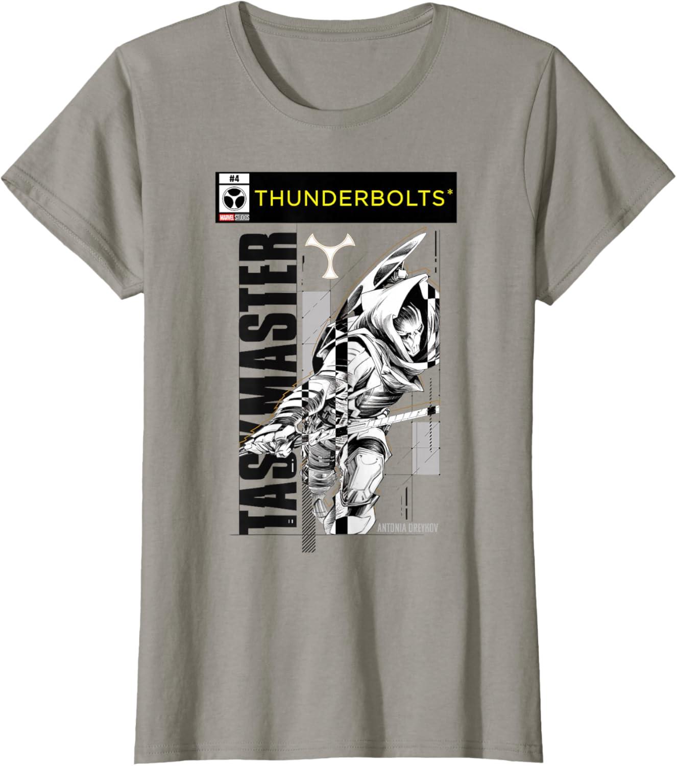 Not super. Not heroes. Not giving up. Join the most unexpected new team in the Marvel Cinematic Universe! This official Marvel tee or hoodie from Marvel Studios' blockbuster movie “Thunderbolts” features action-packed, black-and-white comic cover style art of Taskmaster, the skill-copying Antonia Dreykov, with a Thunderbolts logo at the top. A great gift for a Marvel Super Heroes, Thunderbolts, or MCU fan — collect the whole team with numbered designs featuring Yelena Belova, Bucky Barnes, Red Guardian, John F. Walker, and Ghost! Planning a trip to Avengers Campus at Disney California Adventure Park or another super destination? Get multiples and wear matching Marvel's Thunderbolts t-shirts with friends and family for even more superhero-sized fun! Find it in a t-shirt, premium t-shirt, tank top, v-neck, long sleeve tee, hoodie, and sweatshirt.