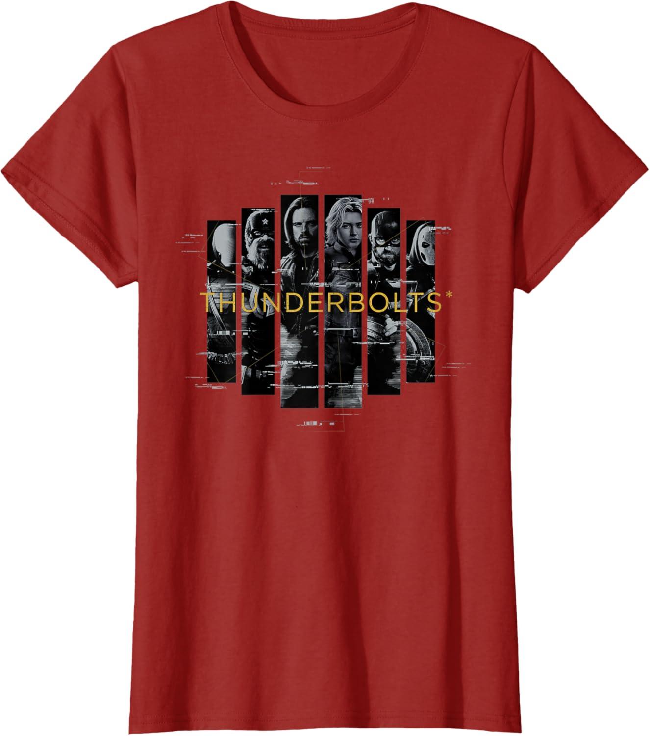 Not super. Not heroes. Not giving up. Join the most unexpected new team in the Marvel Cinematic Universe! This official Marvel tee or hoodie from Marvel Studios' blockbuster movie “Thunderbolts” features eye-catching, black-and-white vertical images of Bucky Barnes, Yelena Belova, Red Guardian, John F. Walker, Ghost, and Taskmaster with a printed digital glitch effect and the iconic movie logo. A great gift for a Marvel Super Heroes, Thunderbolts, or MCU fan! Planning a trip to Avengers Campus at Disney California Adventure Park or another super destination? Get multiples and wear matching Marvel's Thunderbolts t-shirts with friends and family for even more superhero-sized fun! Find it in a t-shirt, premium t-shirt, tank top, v-neck, long sleeve tee, hoodie, and sweatshirt.