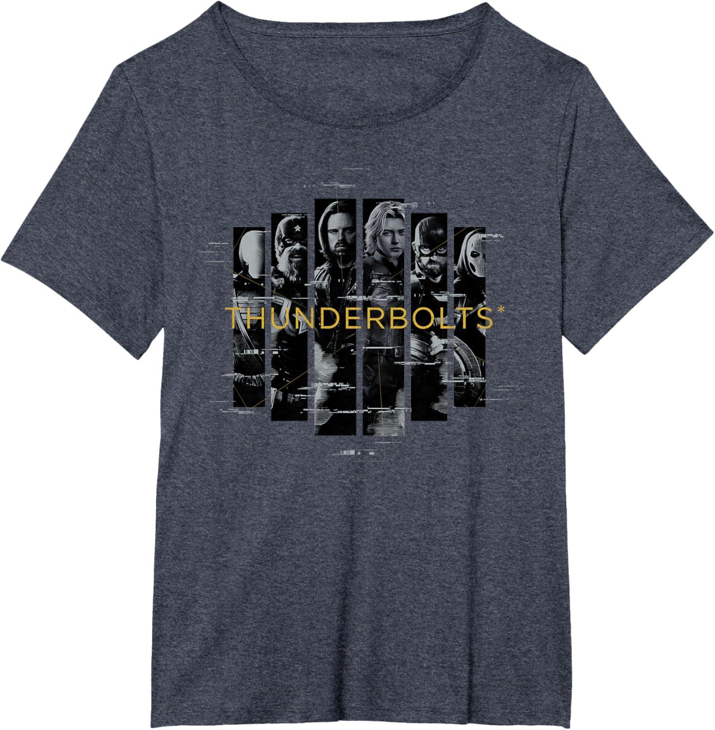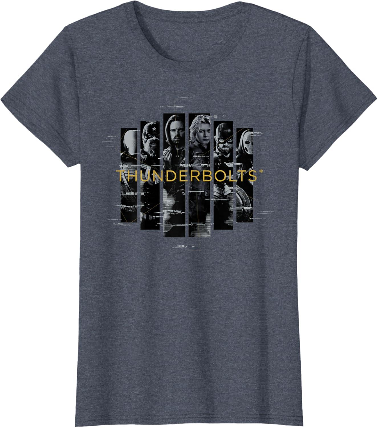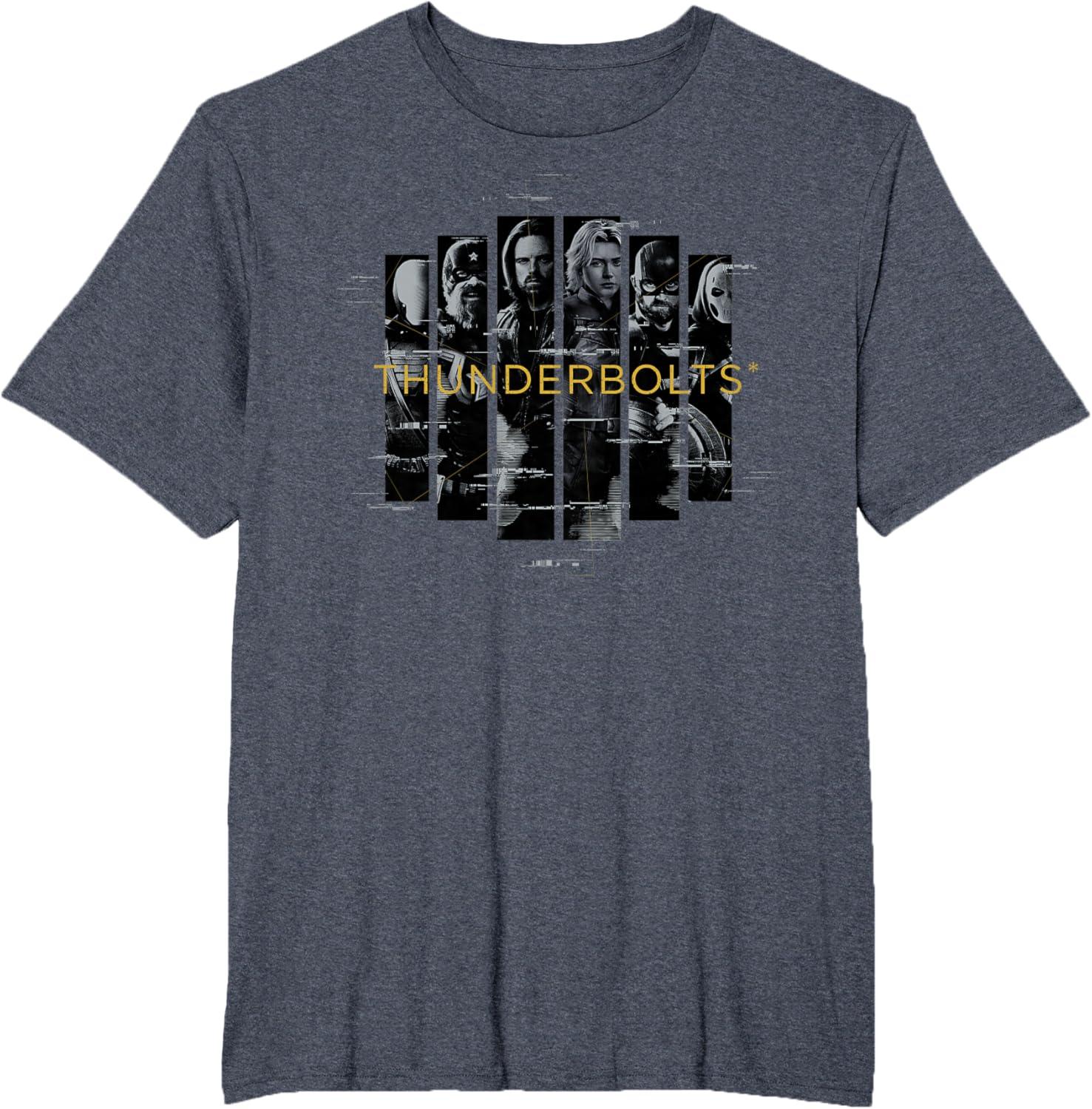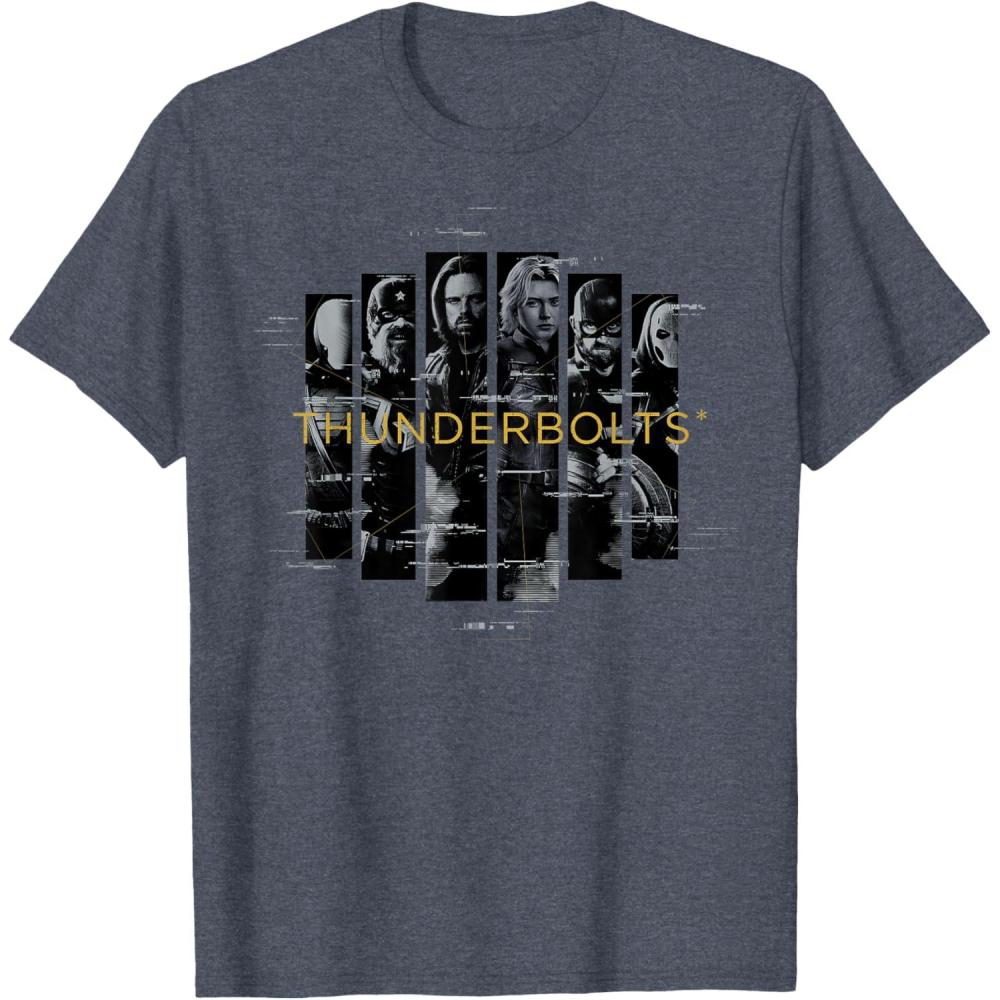 Not super. Not heroes. Not giving up. Join the most unexpected new team in the Marvel Cinematic Universe! This official Marvel tee or hoodie from Marvel Studios' blockbuster movie “Thunderbolts” features eye-catching, black-and-white vertical images of Bucky Barnes, Yelena Belova, Red Guardian, John F. Walker, Ghost, and Taskmaster with a printed digital glitch effect and the iconic movie logo. A great gift for a Marvel Super Heroes, Thunderbolts, or MCU fan! Planning a trip to Avengers Campus at Disney California Adventure Park or another super destination? Get multiples and wear matching Marvel's Thunderbolts t-shirts with friends and family for even more superhero-sized fun! Find it in a t-shirt, premium t-shirt, tank top, v-neck, long sleeve tee, hoodie, and sweatshirt.