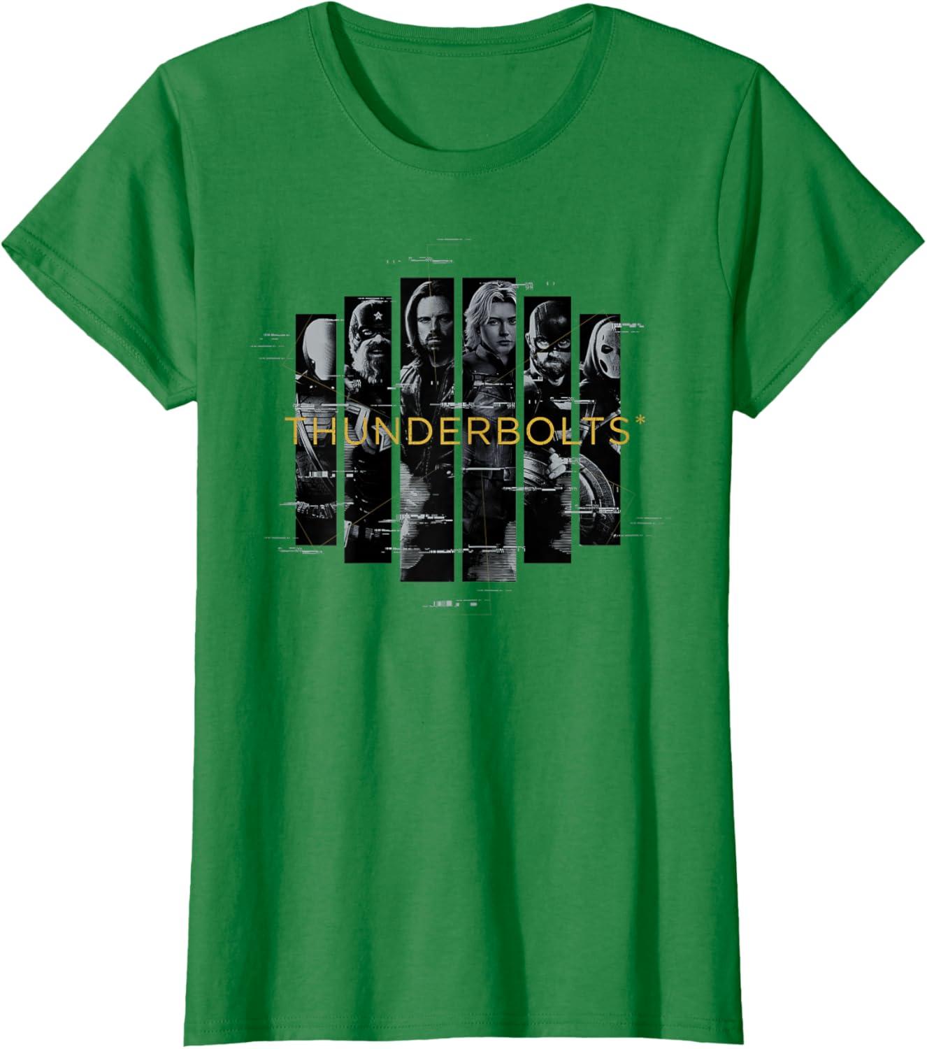 Not super. Not heroes. Not giving up. Join the most unexpected new team in the Marvel Cinematic Universe! This official Marvel tee or hoodie from Marvel Studios' blockbuster movie “Thunderbolts” features eye-catching, black-and-white vertical images of Bucky Barnes, Yelena Belova, Red Guardian, John F. Walker, Ghost, and Taskmaster with a printed digital glitch effect and the iconic movie logo. A great gift for a Marvel Super Heroes, Thunderbolts, or MCU fan! Planning a trip to Avengers Campus at Disney California Adventure Park or another super destination? Get multiples and wear matching Marvel's Thunderbolts t-shirts with friends and family for even more superhero-sized fun! Find it in a t-shirt, premium t-shirt, tank top, v-neck, long sleeve tee, hoodie, and sweatshirt.