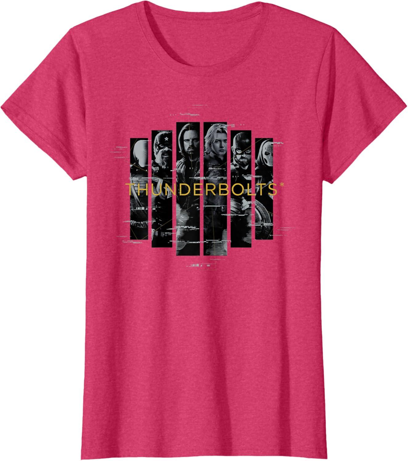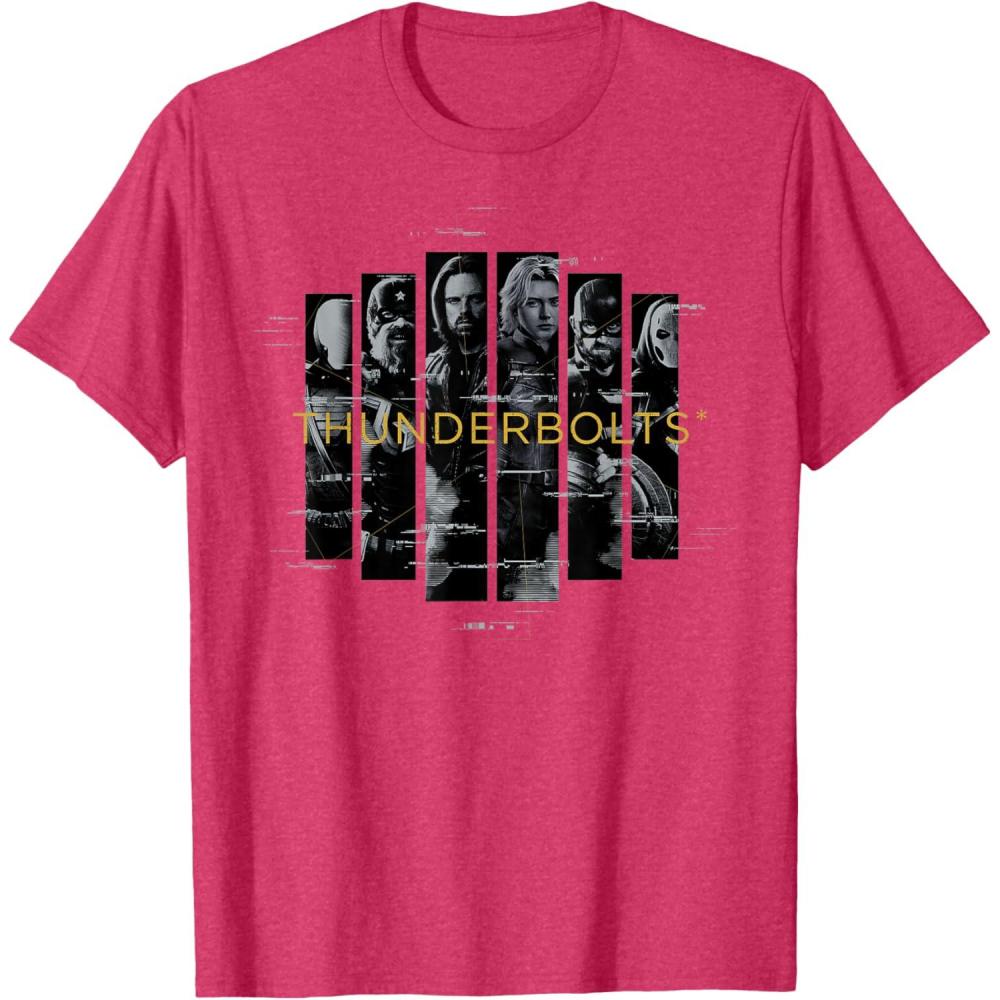Not super. Not heroes. Not giving up. Join the most unexpected new team in the Marvel Cinematic Universe! This official Marvel tee or hoodie from Marvel Studios' blockbuster movie “Thunderbolts” features eye-catching, black-and-white vertical images of Bucky Barnes, Yelena Belova, Red Guardian, John F. Walker, Ghost, and Taskmaster with a printed digital glitch effect and the iconic movie logo. A great gift for a Marvel Super Heroes, Thunderbolts, or MCU fan! Planning a trip to Avengers Campus at Disney California Adventure Park or another super destination? Get multiples and wear matching Marvel's Thunderbolts t-shirts with friends and family for even more superhero-sized fun! Find it in a t-shirt, premium t-shirt, tank top, v-neck, long sleeve tee, hoodie, and sweatshirt.