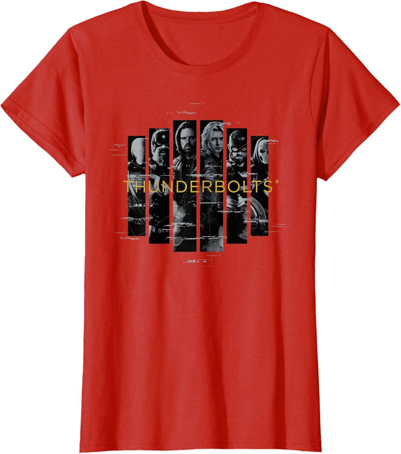 Not super. Not heroes. Not giving up. Join the most unexpected new team in the Marvel Cinematic Universe! This official Marvel tee or hoodie from Marvel Studios' blockbuster movie “Thunderbolts” features eye-catching, black-and-white vertical images of Bucky Barnes, Yelena Belova, Red Guardian, John F. Walker, Ghost, and Taskmaster with a printed digital glitch effect and the iconic movie logo. A great gift for a Marvel Super Heroes, Thunderbolts, or MCU fan! Planning a trip to Avengers Campus at Disney California Adventure Park or another super destination? Get multiples and wear matching Marvel's Thunderbolts t-shirts with friends and family for even more superhero-sized fun! Find it in a t-shirt, premium t-shirt, tank top, v-neck, long sleeve tee, hoodie, and sweatshirt.