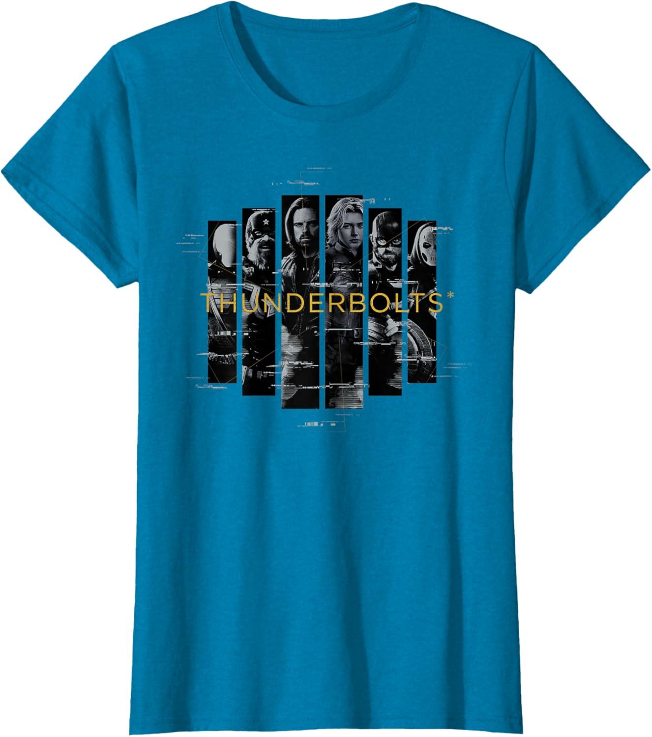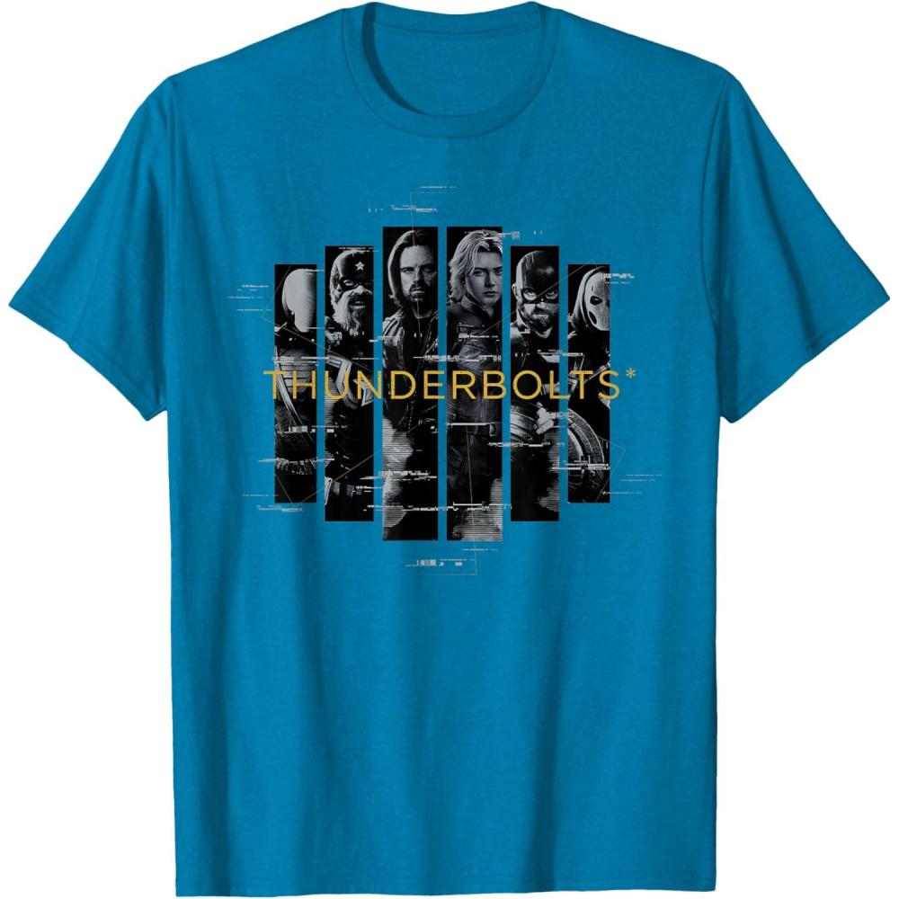 Not super. Not heroes. Not giving up. Join the most unexpected new team in the Marvel Cinematic Universe! This official Marvel tee or hoodie from Marvel Studios' blockbuster movie “Thunderbolts” features eye-catching, black-and-white vertical images of Bucky Barnes, Yelena Belova, Red Guardian, John F. Walker, Ghost, and Taskmaster with a printed digital glitch effect and the iconic movie logo. A great gift for a Marvel Super Heroes, Thunderbolts, or MCU fan! Planning a trip to Avengers Campus at Disney California Adventure Park or another super destination? Get multiples and wear matching Marvel's Thunderbolts t-shirts with friends and family for even more superhero-sized fun! Find it in a t-shirt, premium t-shirt, tank top, v-neck, long sleeve tee, hoodie, and sweatshirt.