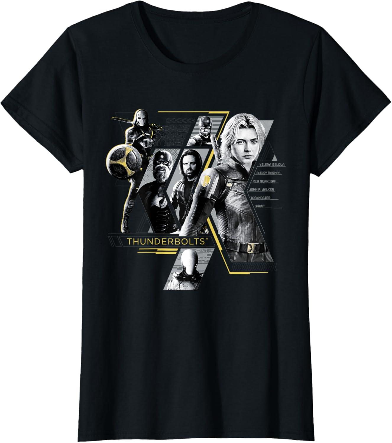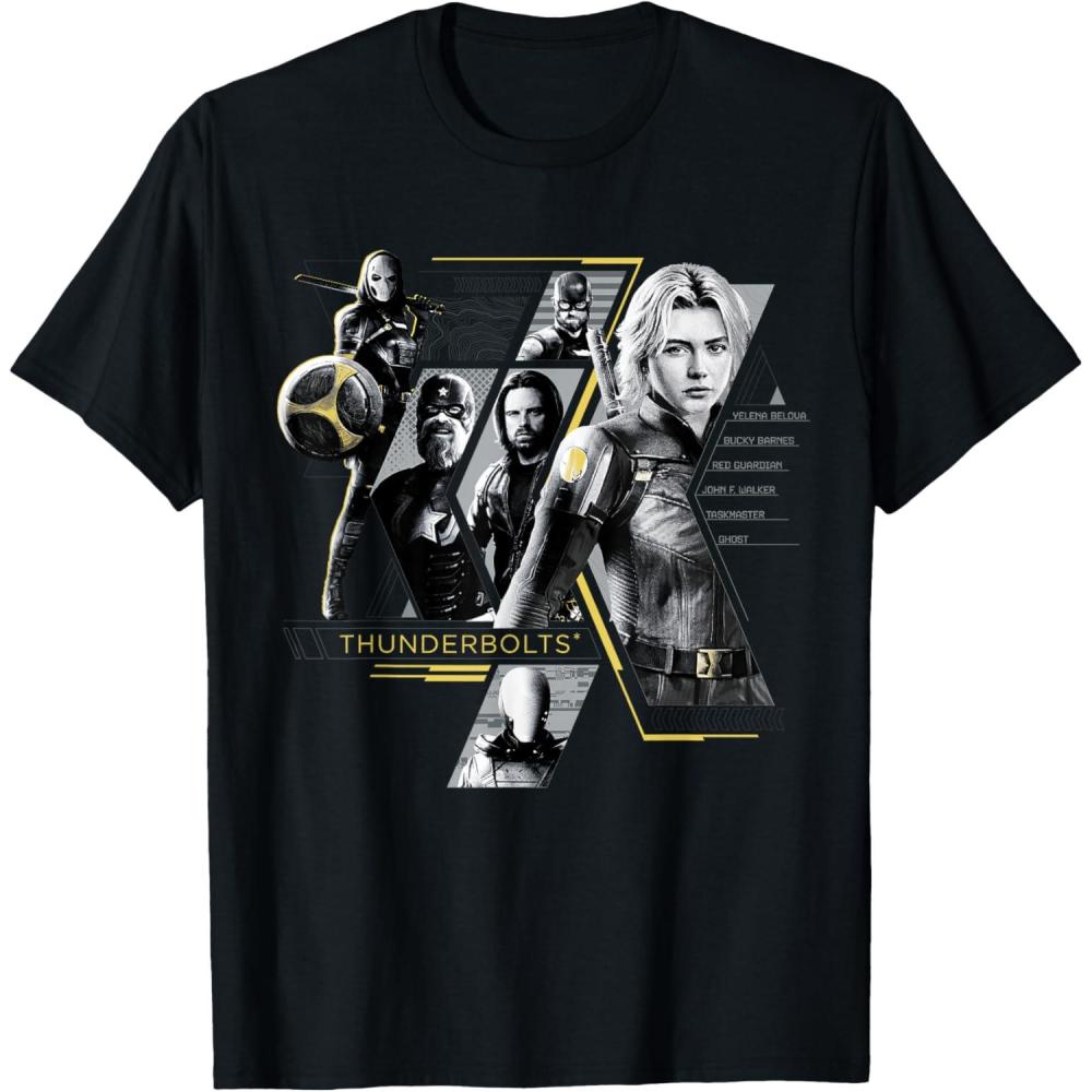 Not super. Not heroes. Not giving up. Join the most unexpected new team in the Marvel Cinematic Universe! This official Marvel tee or hoodie from Marvel Studios' blockbuster movie “Thunderbolts” features eye-catching, black-and-white images of Yelena Belova, Bucky Barnes, Red Guardian, John F. Walker, Ghost, and Taskmaster with yellow accents and the iconic movie logo. A great gift for a Marvel Super Heroes, Thunderbolts, or MCU fan! Planning a trip to Avengers Campus at Disney California Adventure Park or another super destination? Get multiples and wear matching Marvel's Thunderbolts t-shirts with friends and family for even more superhero-sized fun! Find it in a t-shirt, premium t-shirt, tank top, v-neck, long sleeve tee, hoodie, and sweatshirt.