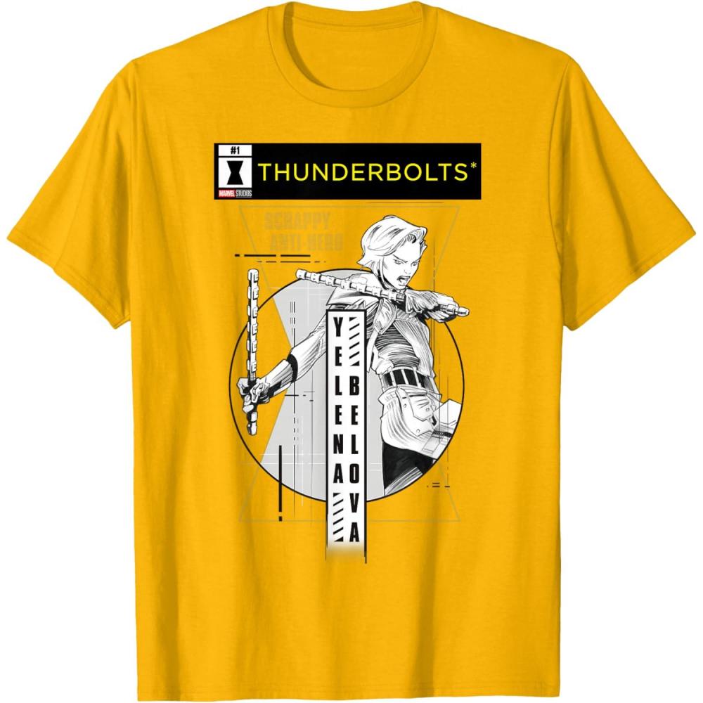 Not super. Not heroes. Not giving up. Join the most unexpected new team in the Marvel Cinematic Universe! This official Marvel tee or hoodie from Marvel Studios' blockbuster movie “Thunderbolts” features action-packed, black-and-white comic cover style art of Yelena Belova, trained in the Red Room as a Black Widow, with a Thunderbolts logo at the top and accompanied by her name and the message “Scrappy Anti-Hero”. A great gift for a Marvel Super Heroes, Thunderbolts, or MCU fan — collect the whole team with numbered designs featuring Bucky Barnes, Red Guardian, Taskmaster, John F. Walker, and Ghost! Planning a trip to Avengers Campus at Disney California Adventure Park or another super destination? Get multiples and wear matching Marvel's Thunderbolts t-shirts with friends and family for even more superhero-sized fun! Find it in a t-shirt, premium t-shirt, tank top, v-neck, long sleeve tee, hoodie, and sweatshirt.