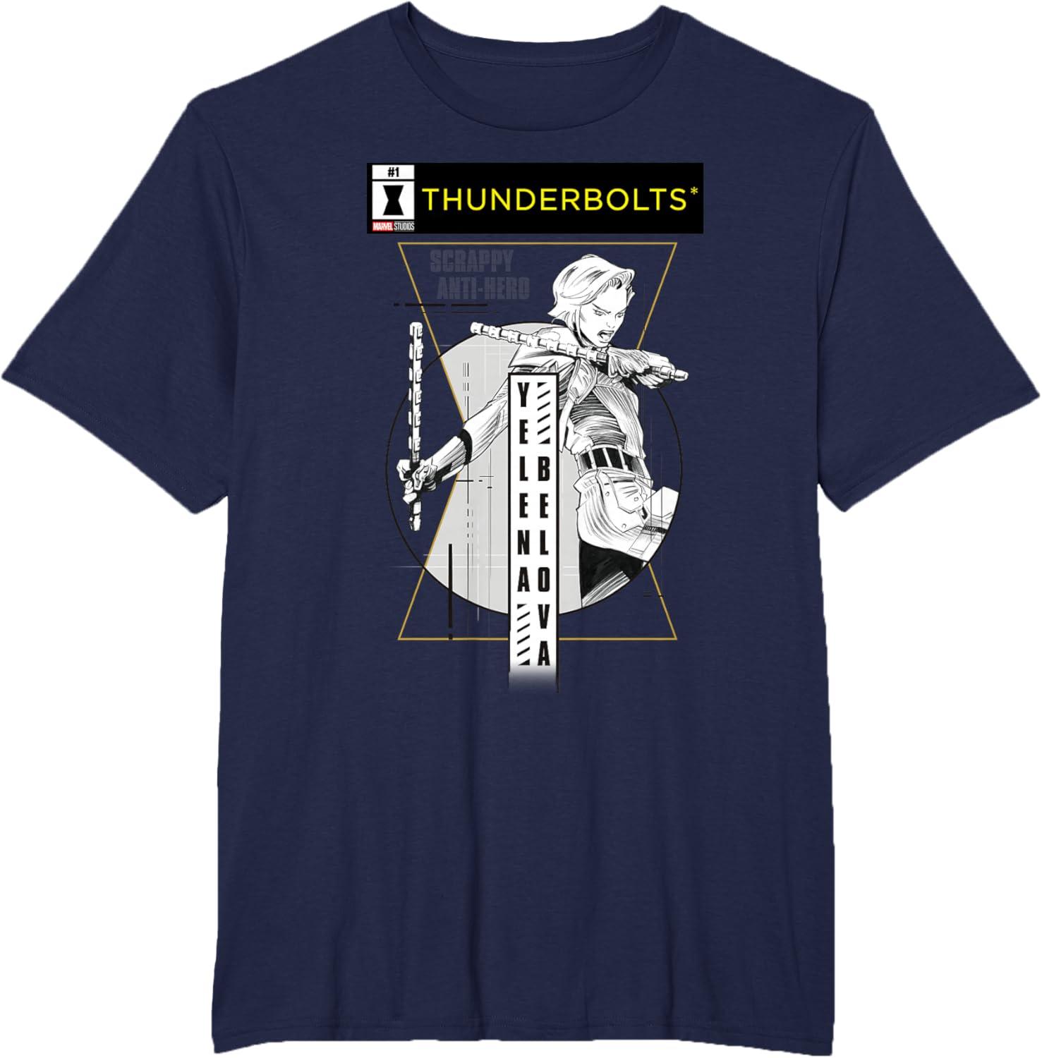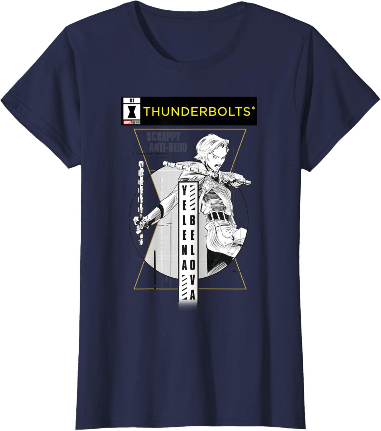 Not super. Not heroes. Not giving up. Join the most unexpected new team in the Marvel Cinematic Universe! This official Marvel tee or hoodie from Marvel Studios' blockbuster movie “Thunderbolts” features action-packed, black-and-white comic cover style art of Yelena Belova, trained in the Red Room as a Black Widow, with a Thunderbolts logo at the top and accompanied by her name and the message “Scrappy Anti-Hero”. A great gift for a Marvel Super Heroes, Thunderbolts, or MCU fan — collect the whole team with numbered designs featuring Bucky Barnes, Red Guardian, Taskmaster, John F. Walker, and Ghost! Planning a trip to Avengers Campus at Disney California Adventure Park or another super destination? Get multiples and wear matching Marvel's Thunderbolts t-shirts with friends and family for even more superhero-sized fun! Find it in a t-shirt, premium t-shirt, tank top, v-neck, long sleeve tee, hoodie, and sweatshirt.