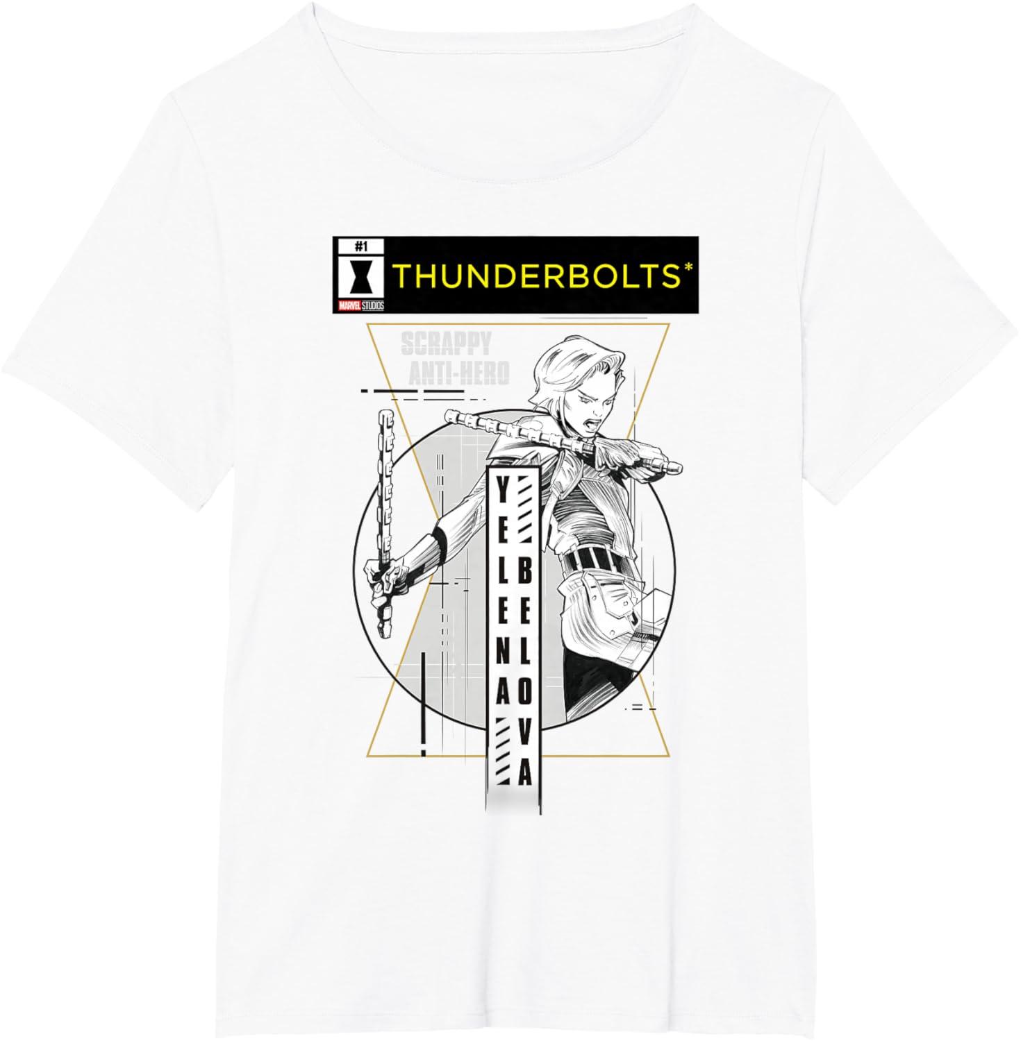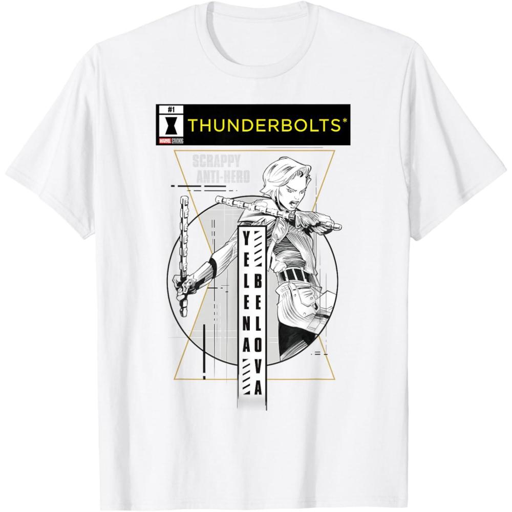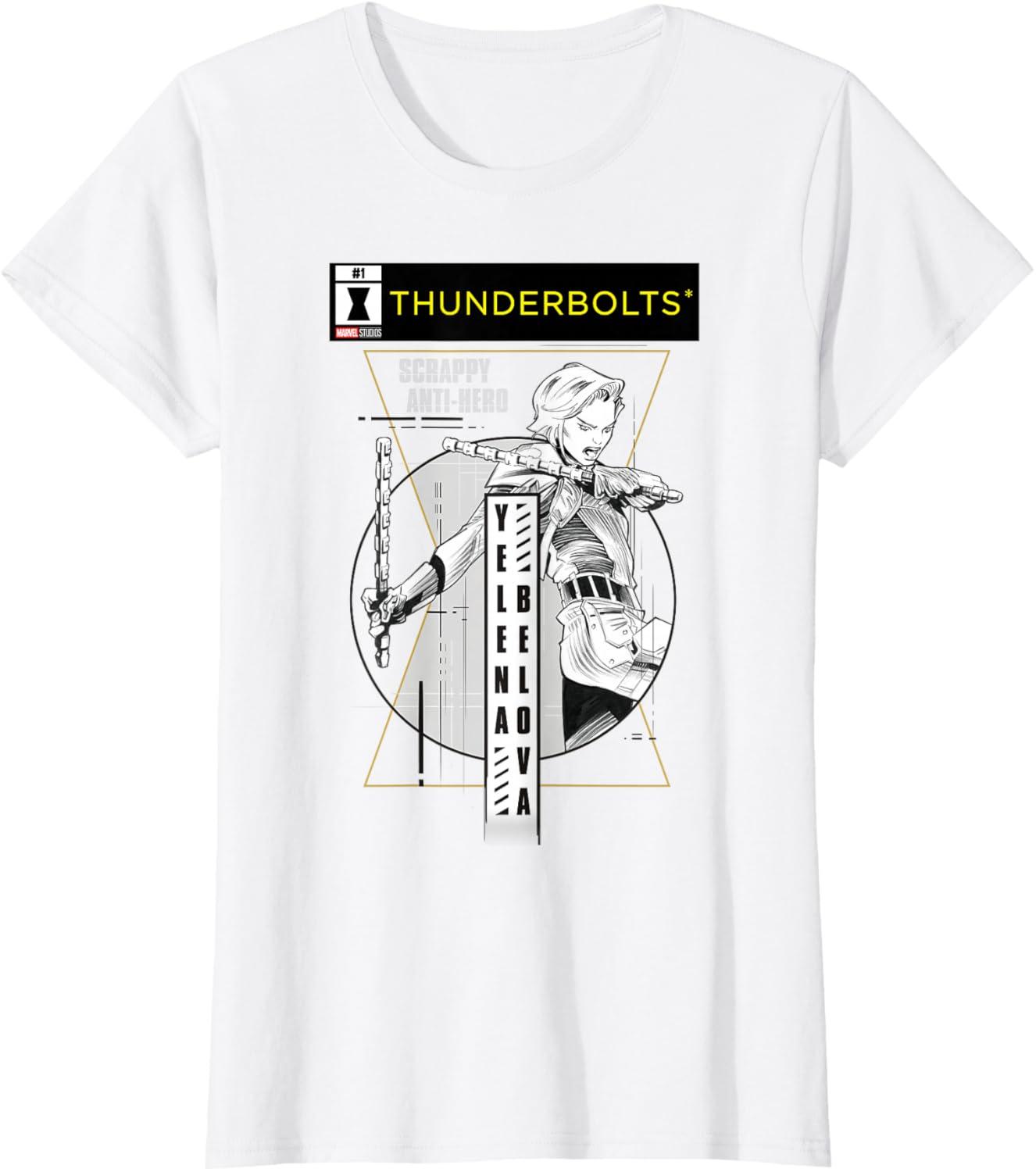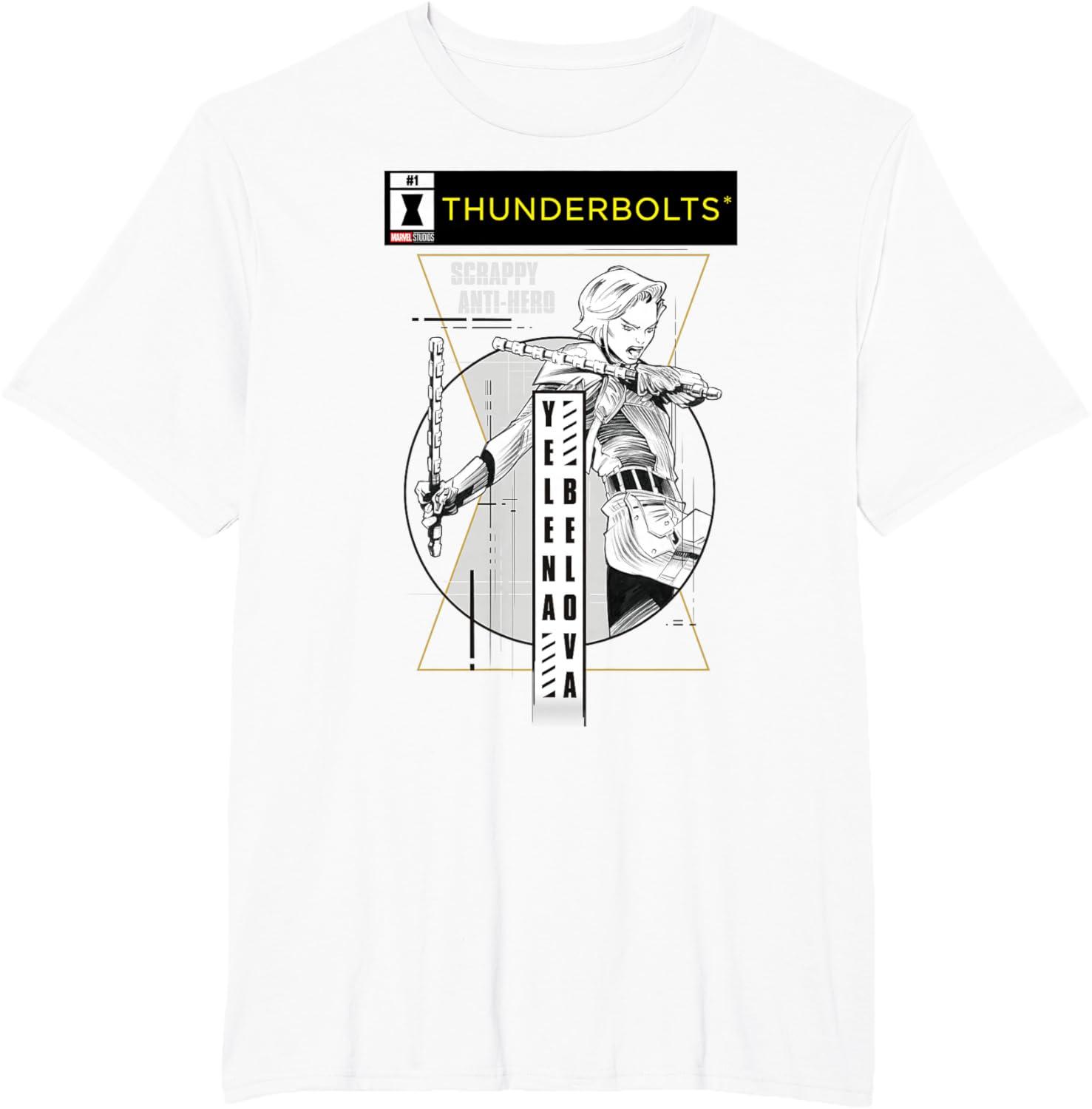 Not super. Not heroes. Not giving up. Join the most unexpected new team in the Marvel Cinematic Universe! This official Marvel tee or hoodie from Marvel Studios' blockbuster movie “Thunderbolts” features action-packed, black-and-white comic cover style art of Yelena Belova, trained in the Red Room as a Black Widow, with a Thunderbolts logo at the top and accompanied by her name and the message “Scrappy Anti-Hero”. A great gift for a Marvel Super Heroes, Thunderbolts, or MCU fan — collect the whole team with numbered designs featuring Bucky Barnes, Red Guardian, Taskmaster, John F. Walker, and Ghost! Planning a trip to Avengers Campus at Disney California Adventure Park or another super destination? Get multiples and wear matching Marvel's Thunderbolts t-shirts with friends and family for even more superhero-sized fun! Find it in a t-shirt, premium t-shirt, tank top, v-neck, long sleeve tee, hoodie, and sweatshirt.