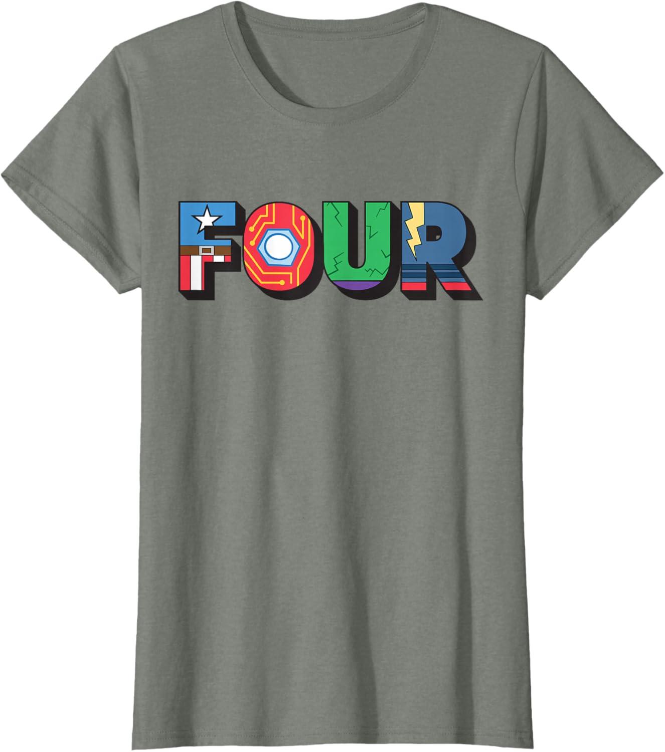 Celebrate a super-heroic fourth birthday with Marvel's Avengers! This fun official Marvel tee features a big and colorful “Four” patterned to resemble Captain America, Iron Man, the Hulk, and Thor. A great birthday gift for a 4-year-old who loves super heroes, and perfect for a Marvel Super Heroes themed 4th birthday party or a family birthday trip to Avengers Campus at Disney California Adventure Park, Disneyland, or Walt Disney World. Get multiples for friends and family to celebrate the big day together! Look for other Marvel Super Heroes Avengers Numbers graphic tees and use them as contest prizes, as numbered matching family vacation t-shirts, or for anything else you can imagine. Available in youth and adult sizes. Find it in a t-shirt, premium t-shirt, tank top, v-neck, long sleeve tee, hoodie, and sweatshirt.
