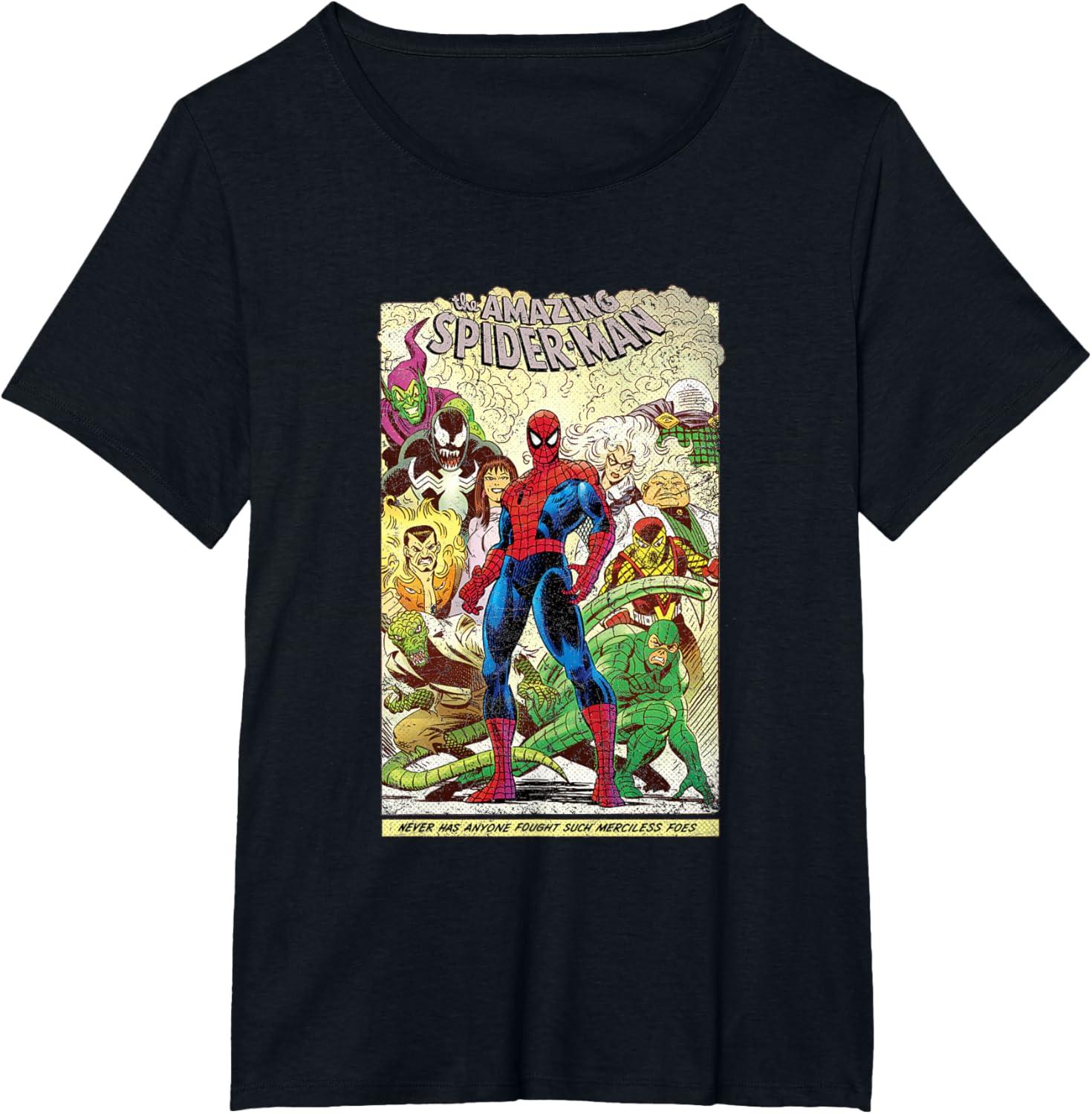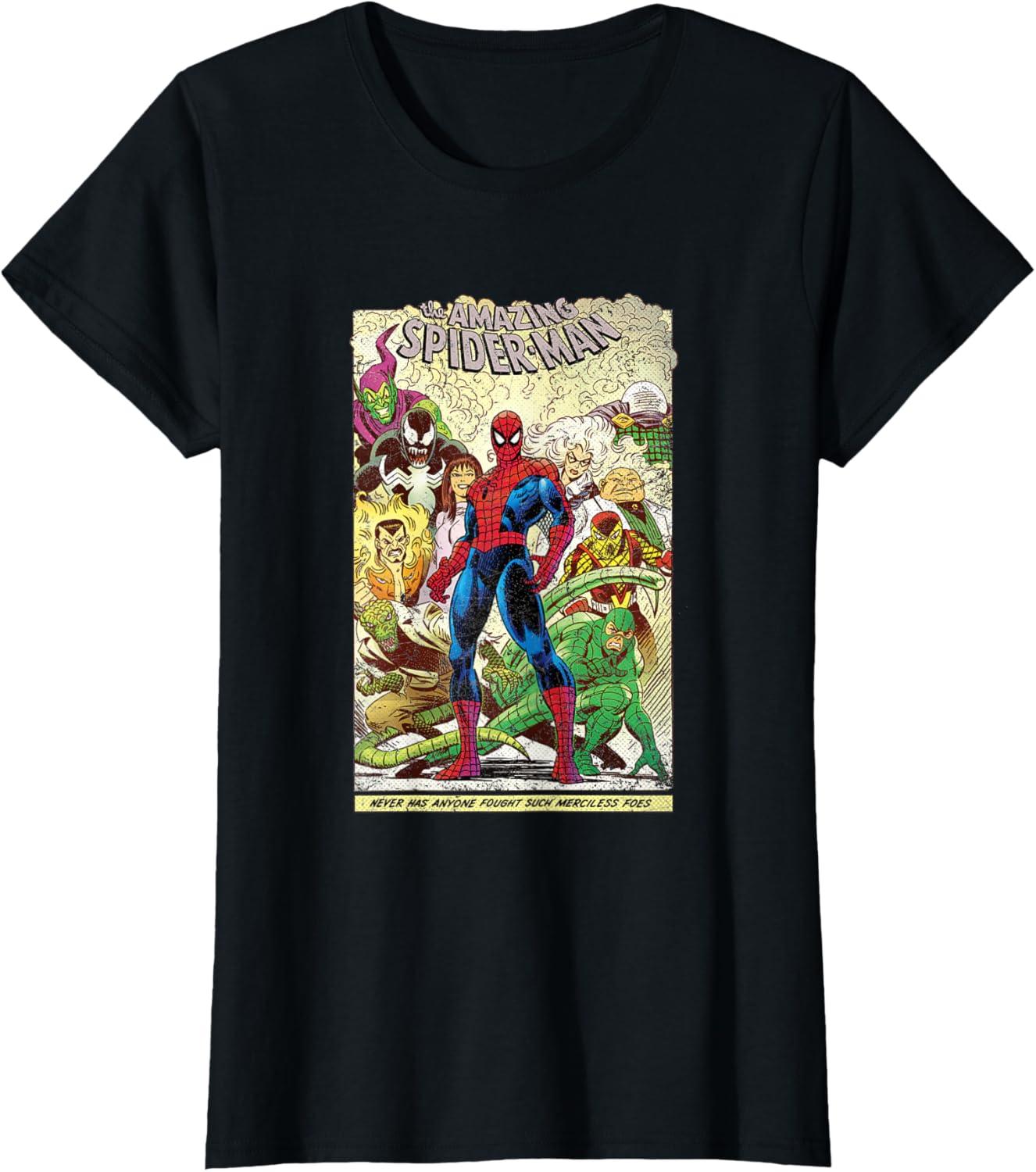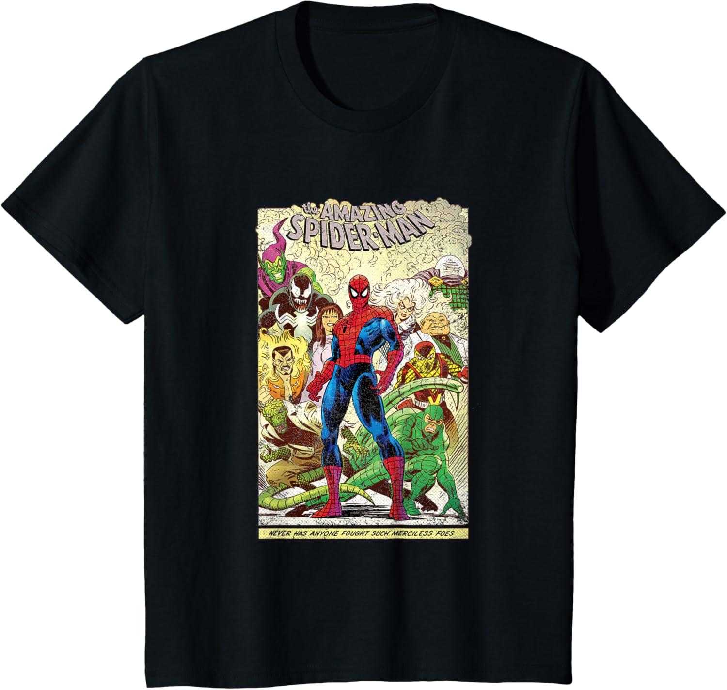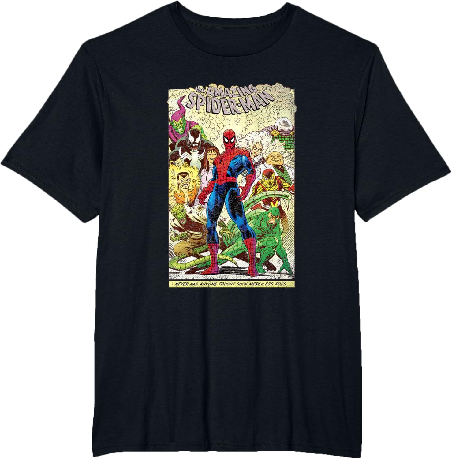 Peter Parker looks as courageous as ever on the front of this retro tee shirt featuring comic art inspired by The Amazing Spider-Man. Venom, Green Goblin, Black Cat, Kraven the Hunter, Mary Jane, Lizard, Mysterio, Kingpin, Shocker, and Scorpion stand behind Spidey with a banner at the bottom that reads, “Never has anyone fought such merciless foes.” Searching for the perfect gift for Marvel fans? This awesome t-shirt will not disappoint.