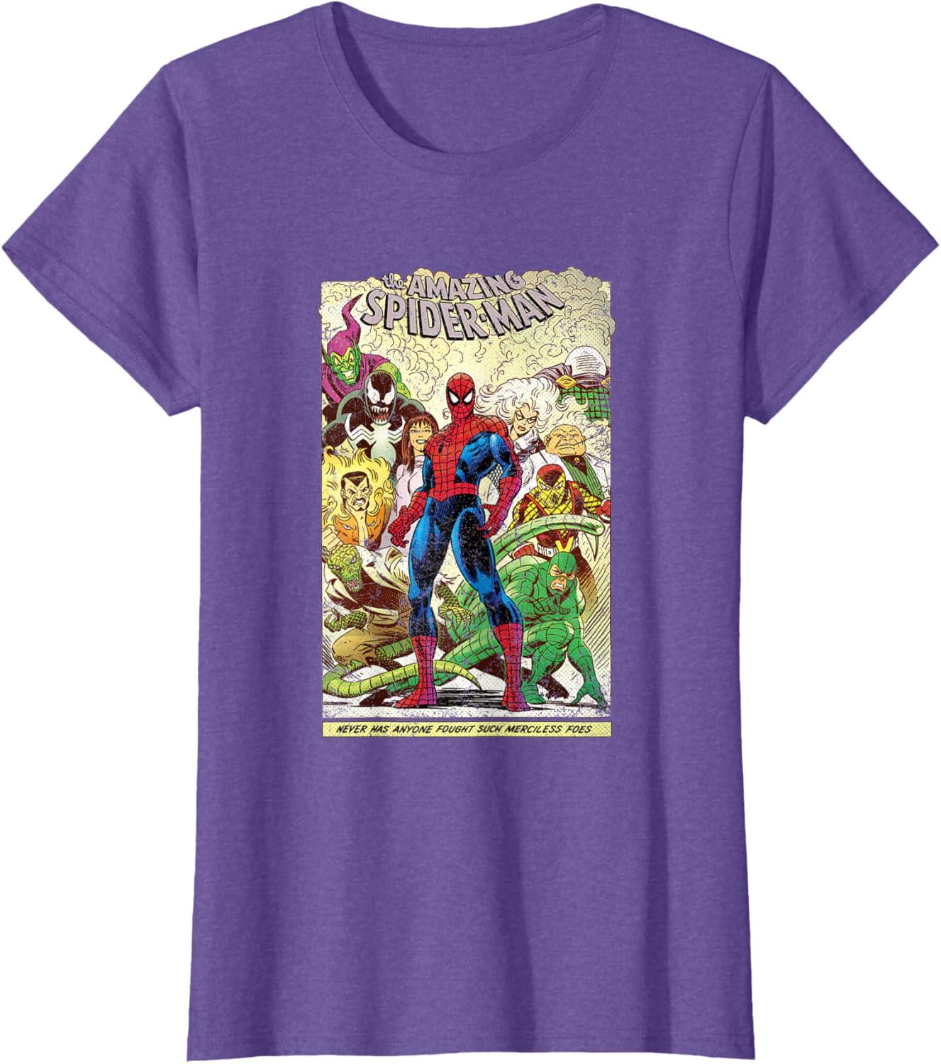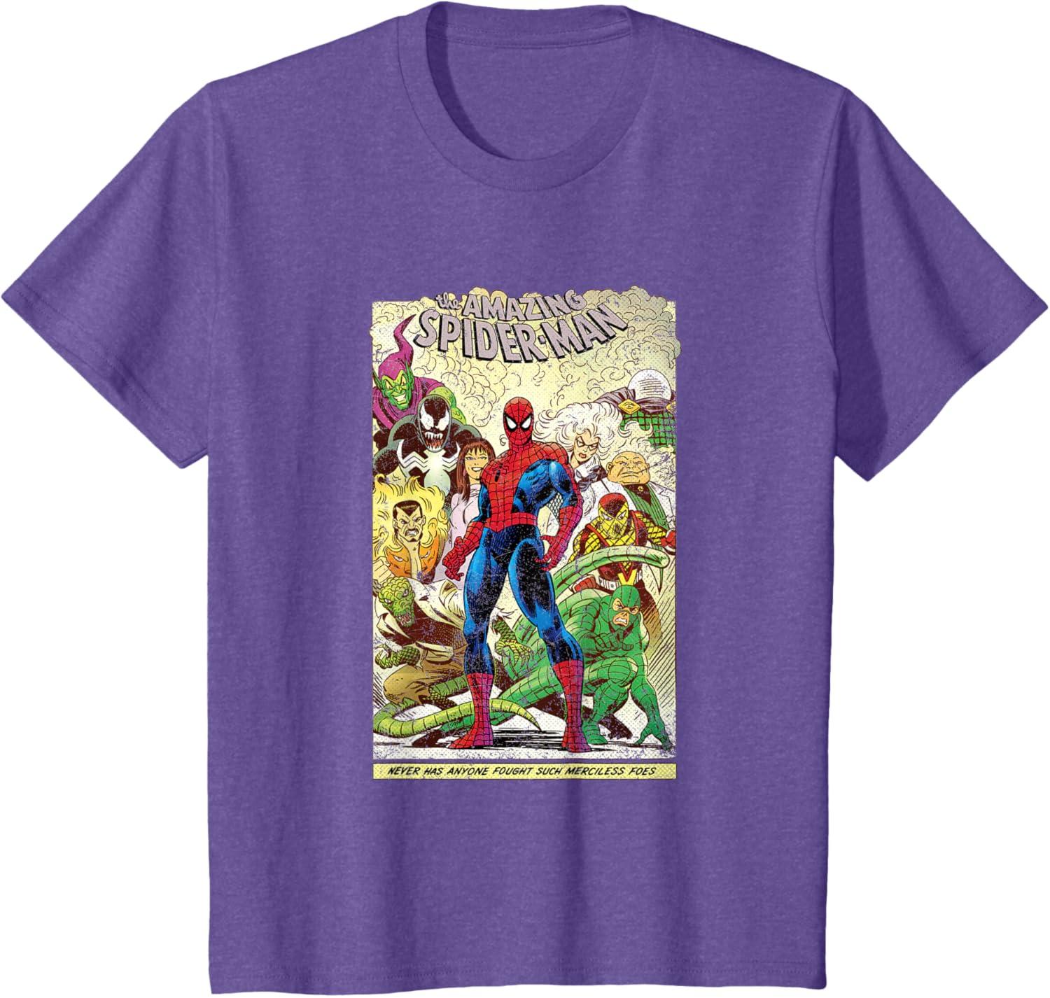 Peter Parker looks as courageous as ever on the front of this retro tee shirt featuring comic art inspired by The Amazing Spider-Man. Venom, Green Goblin, Black Cat, Kraven the Hunter, Mary Jane, Lizard, Mysterio, Kingpin, Shocker, and Scorpion stand behind Spidey with a banner at the bottom that reads, “Never has anyone fought such merciless foes.” Searching for the perfect gift for Marvel fans? This awesome t-shirt will not disappoint.