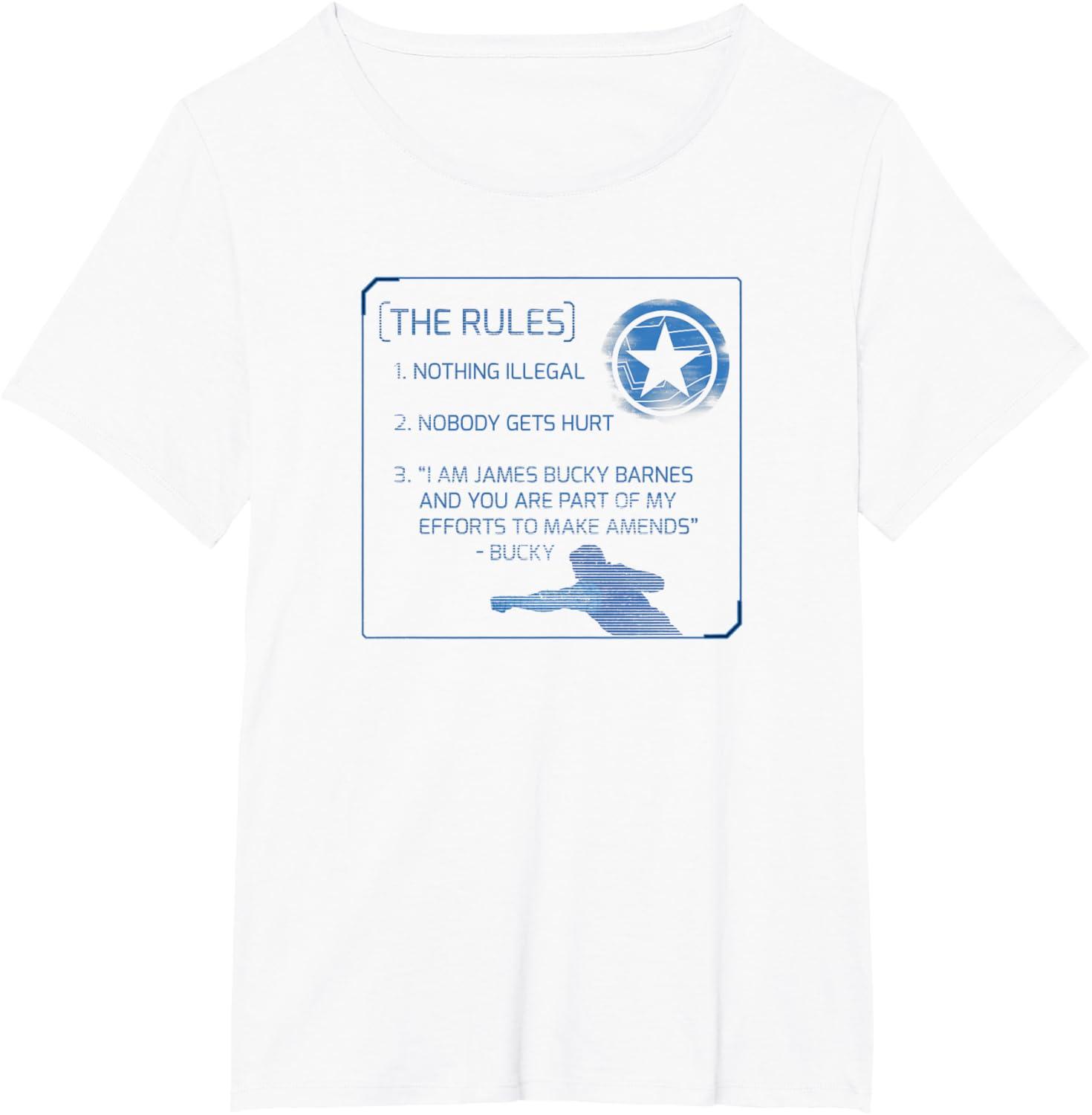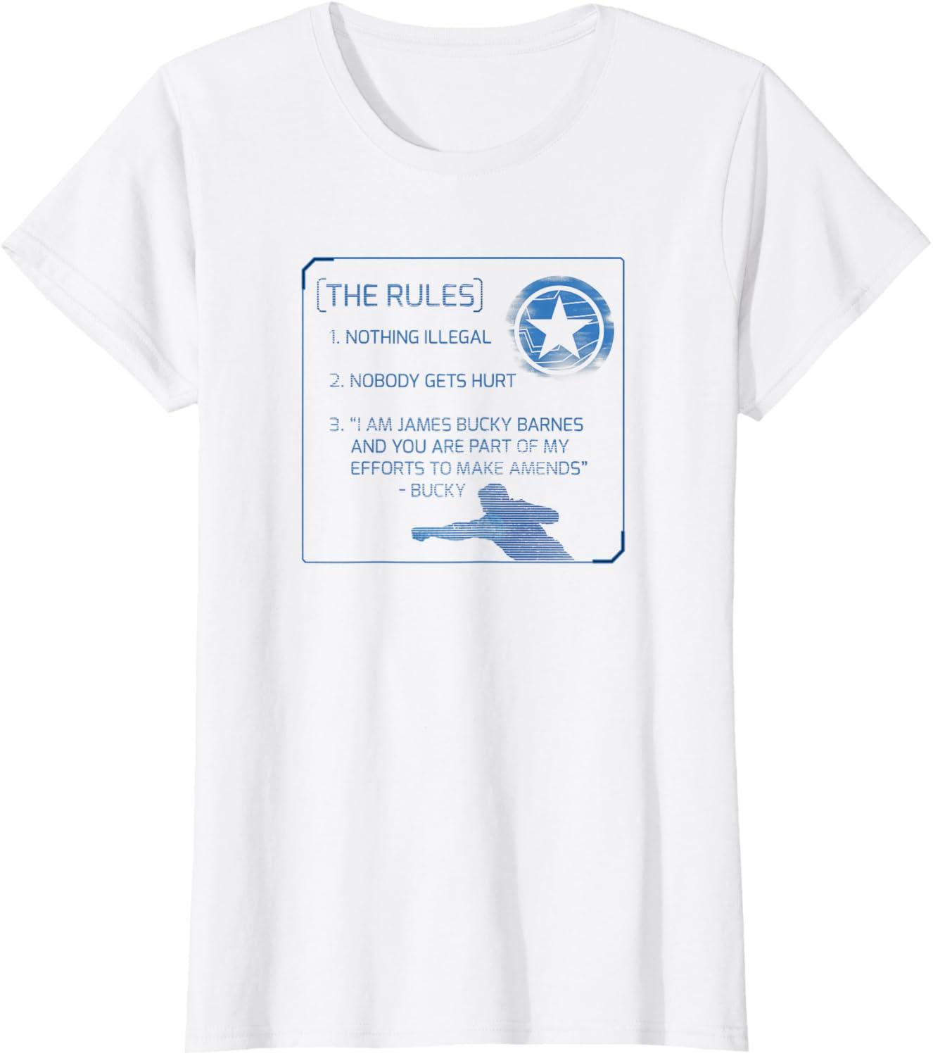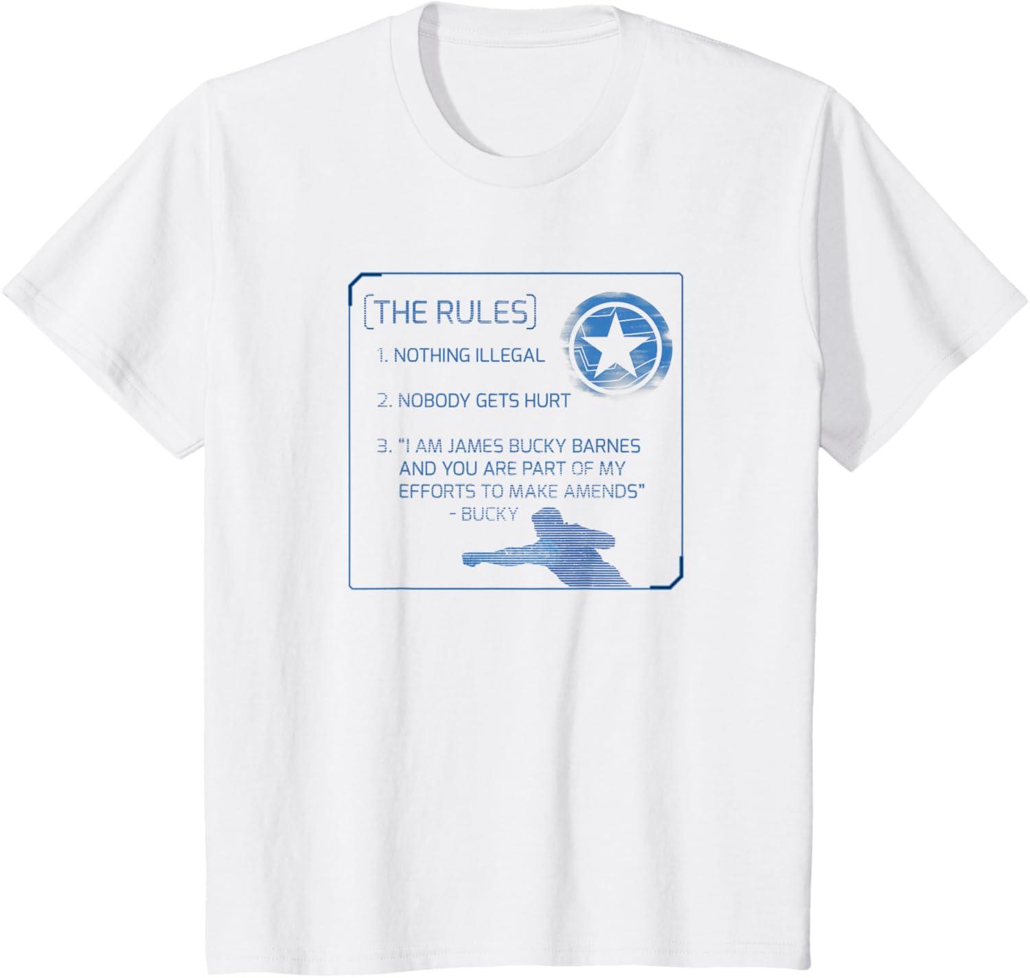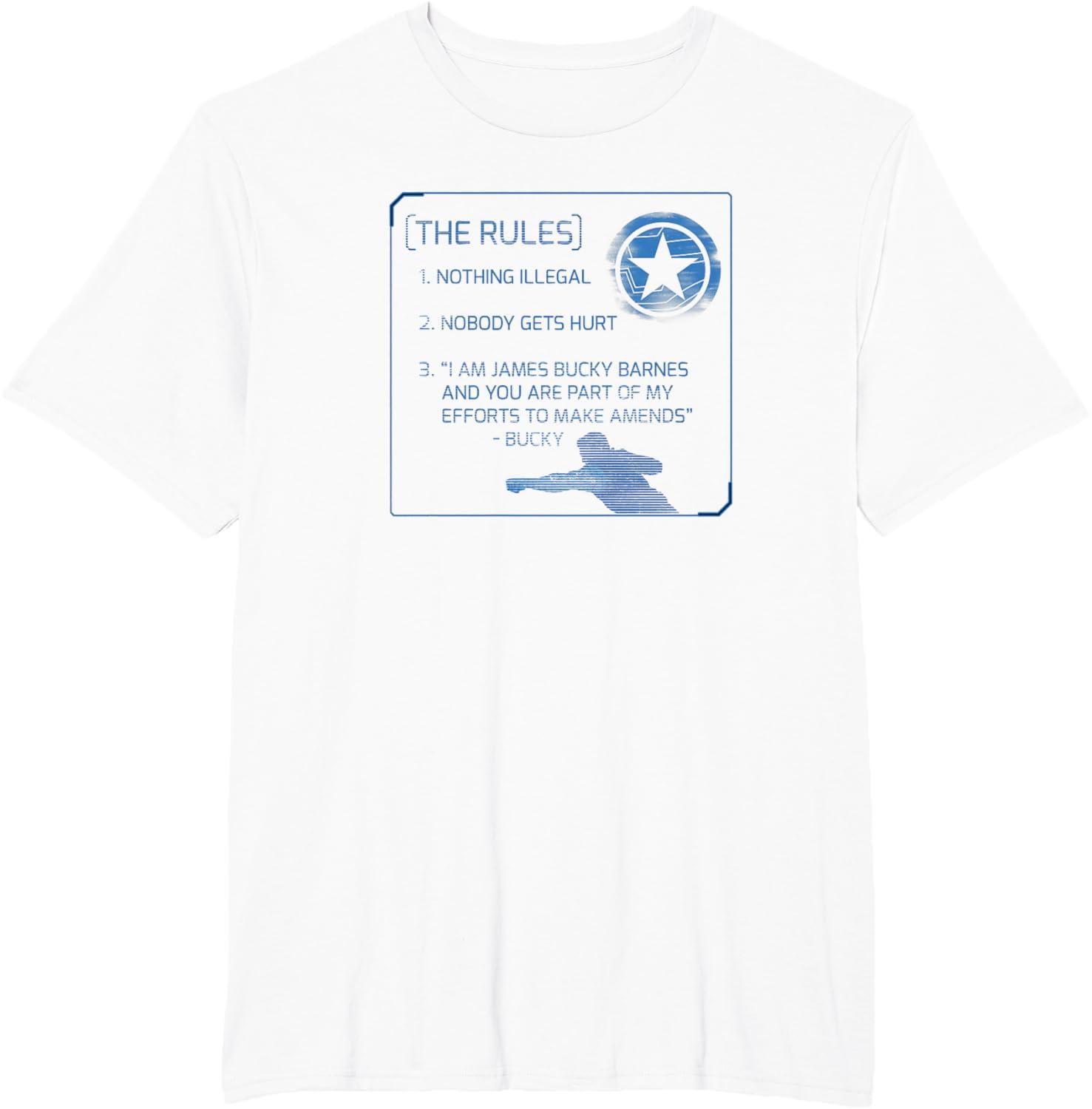 1. Nothing Illegal. 2. Nobody Gets Hurt. 3. I am James Bucky Barnes and You Are Part of My Efforts to Make Amends. Help Bucky Barnes remember his new life rules when you wear this cool Marvel t-shirt featuring artwork from Marvel Studios’ The Falcon and the Winter Soldier, streaming on Disney+. The Falcon and The Winter Soldier is a global adventure that picks up after the events of Avengers: Endgame and follows Sam Wilson and Bucky Barnes on a journey that tests their abilities and their patience. Available in youth and adult sizes. Get this Marvel design in a t-shirt, premium t-shirt, tank top, v-neck, long sleeve tee, or sweatshirt.