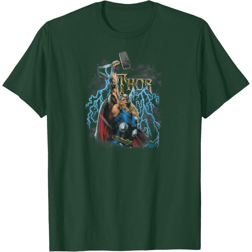 Feel the thunder roar with this electrifying Thor design that strikes like a bolt from the heavens. With storm clouds swirling and lightning igniting the skies, the God of Thunder raises Mjolnir high in a pose of mythic power. From the intricate gold logo to the storm-charged atmosphere, this artwork channels all the might and majesty of Asgard’s fiercest warrior. Perfect for anyone ready to rock the realms with bold strength and immortal swagger.