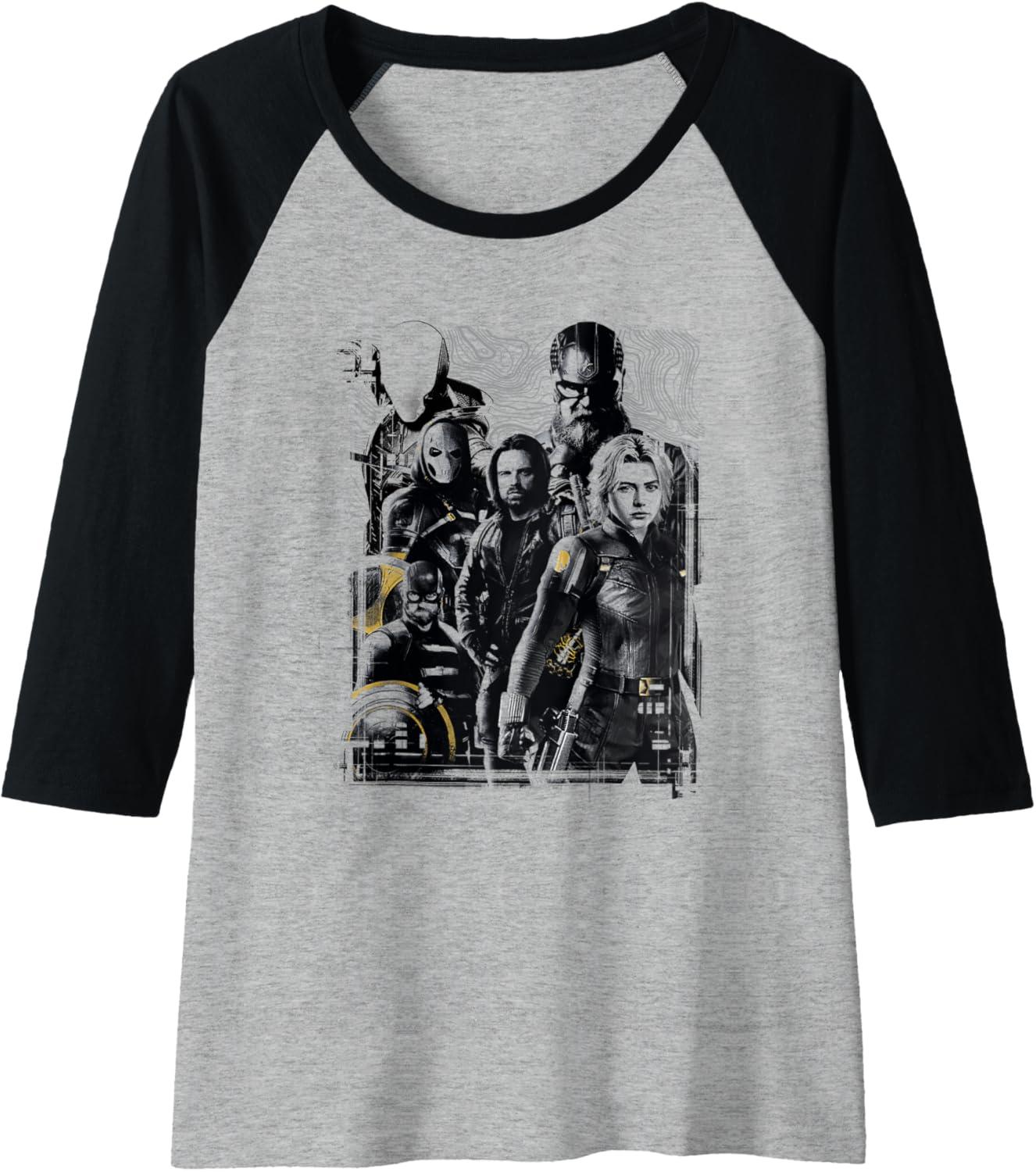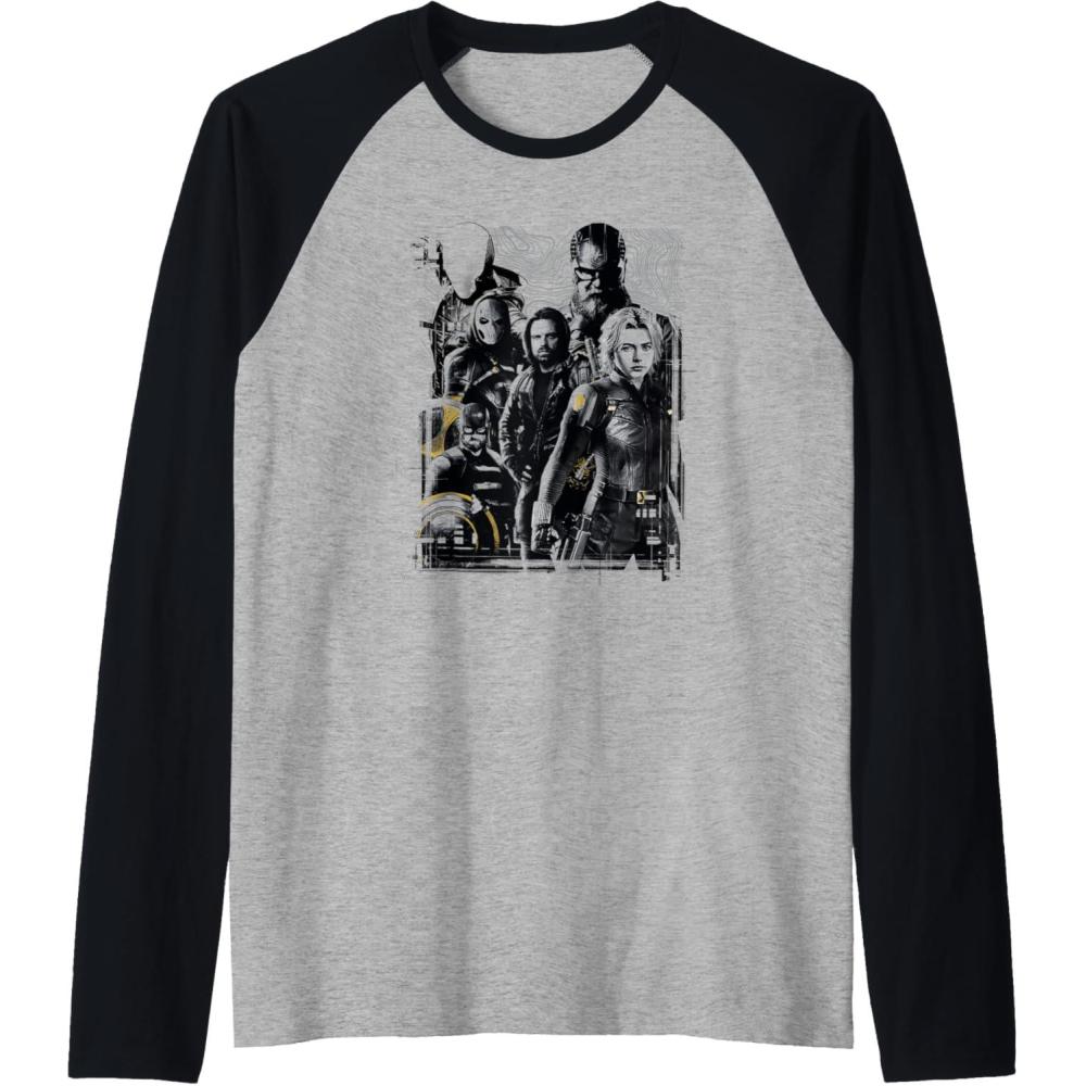 Marvel Thunderbolts Topographic Map Group Shot Raglan Baseball Tee(Black/Athletic Heather)